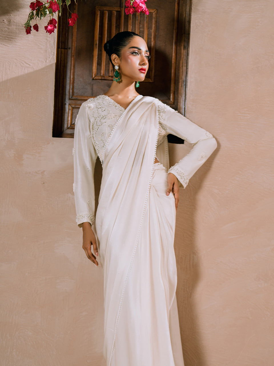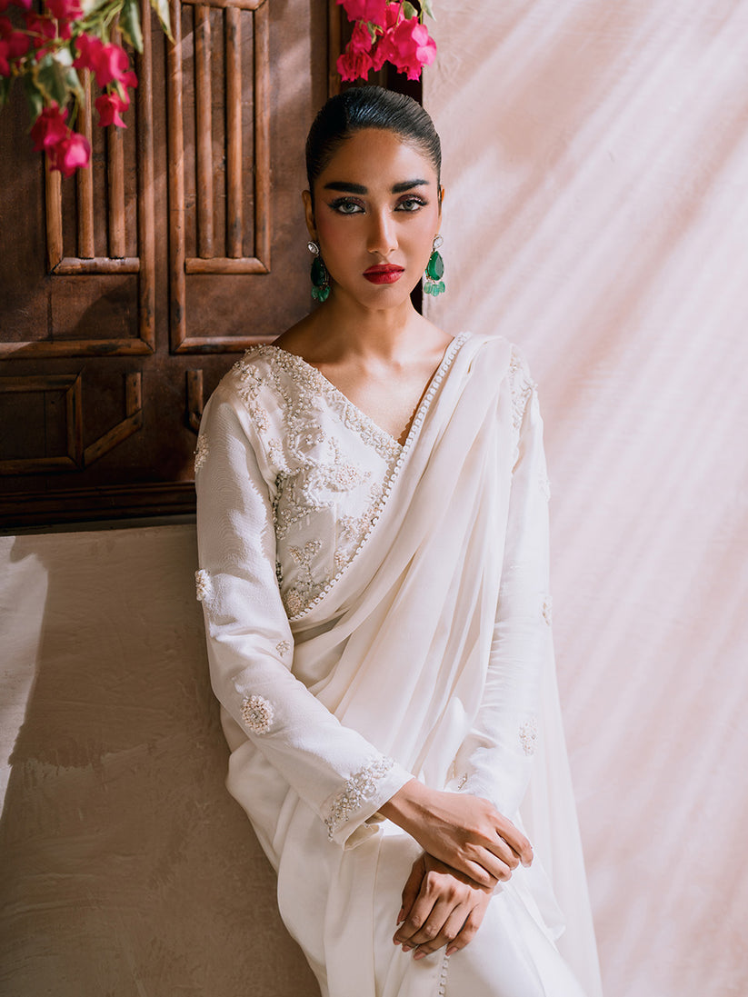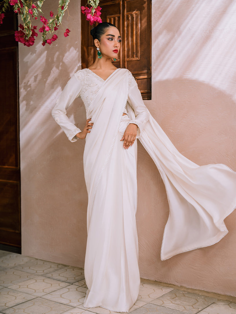 White blouse with handwork embroidery details, paired with a chamois silk saree. Made from pure raw silk for the blouse and pure chamois silk for the saree.