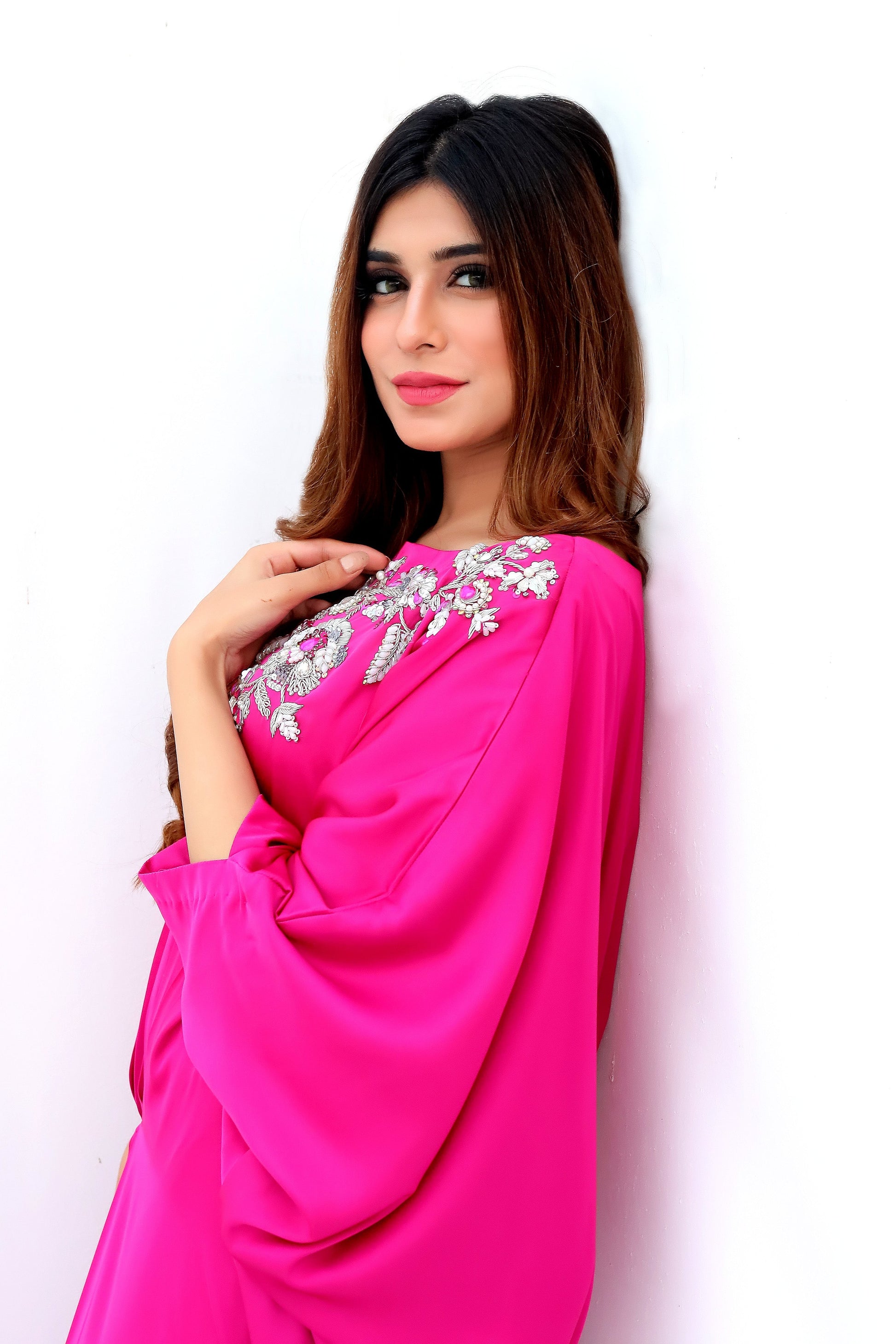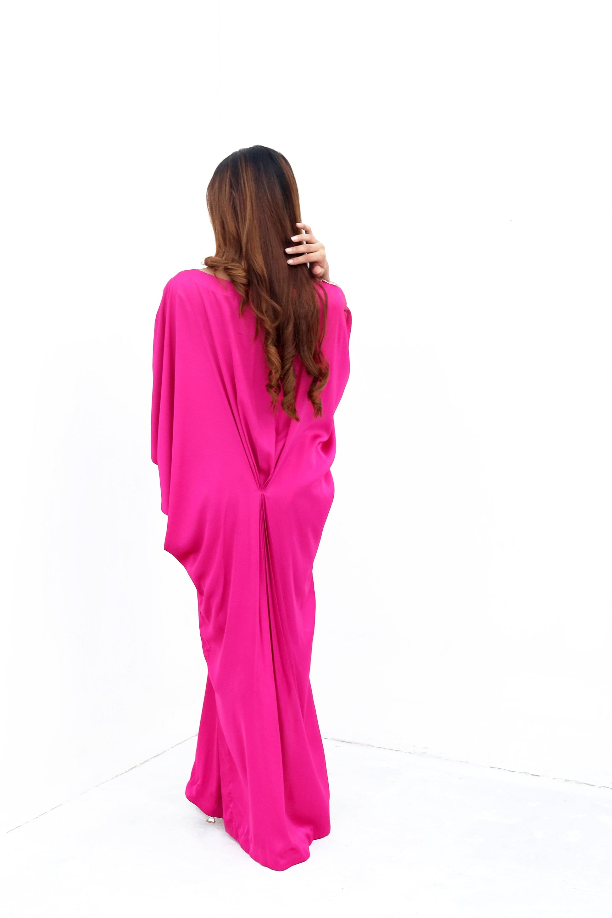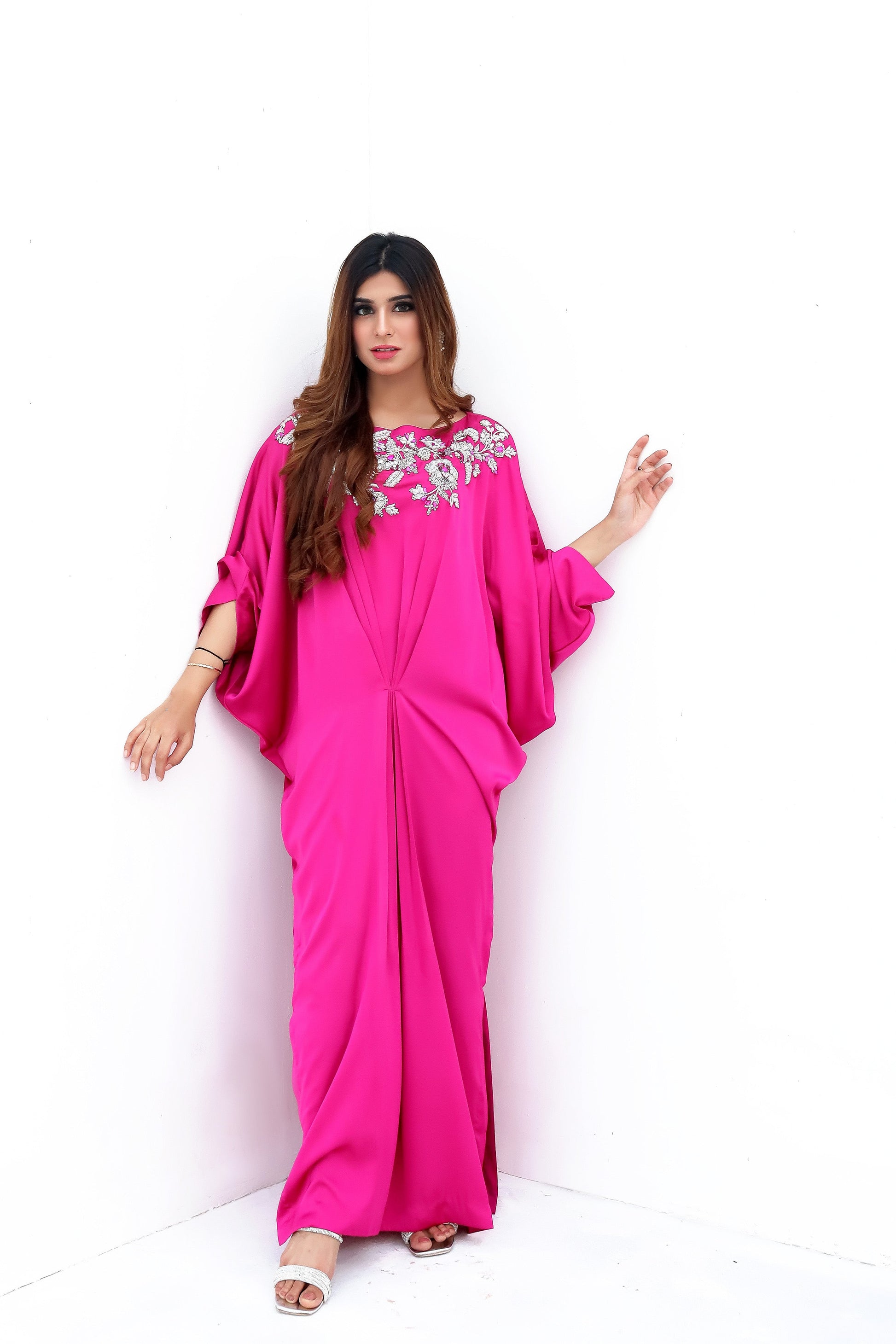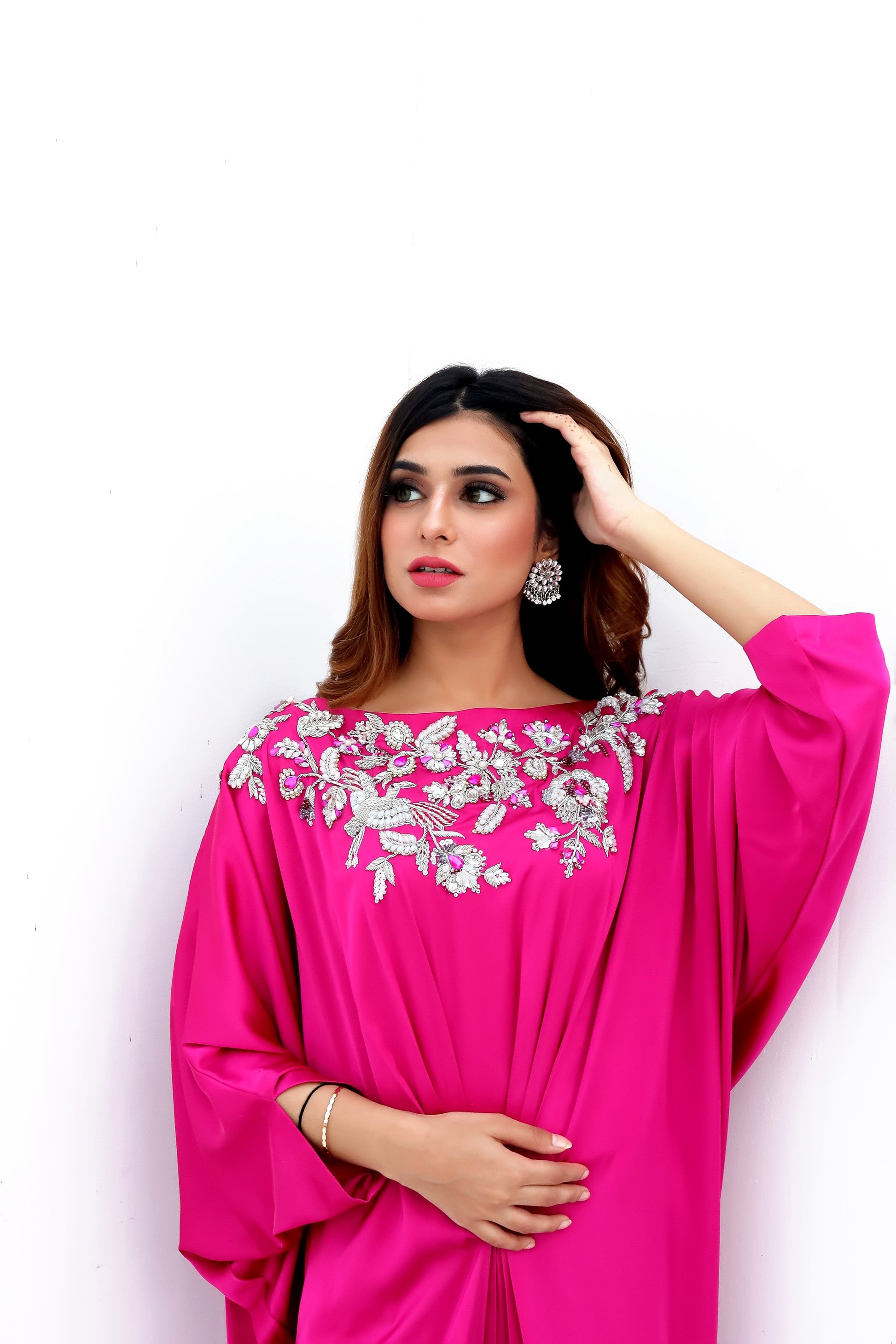 This magenta kaftan dress is a vision of luxury, crafted from pure silk for a sumptuous feel. The kaftan style adds an elegant and comfortable flair. The exquisite hand-embroidered details include Swarovski crystals, sequins, beads, Dabka, and intricate 3D work, creating a dazzling ensemble that seamlessly combines style and opulence.