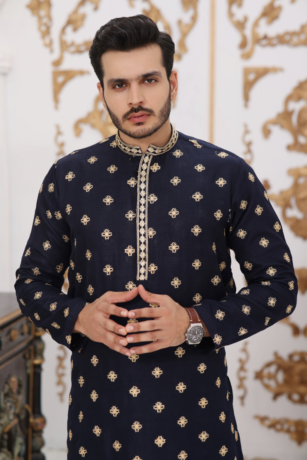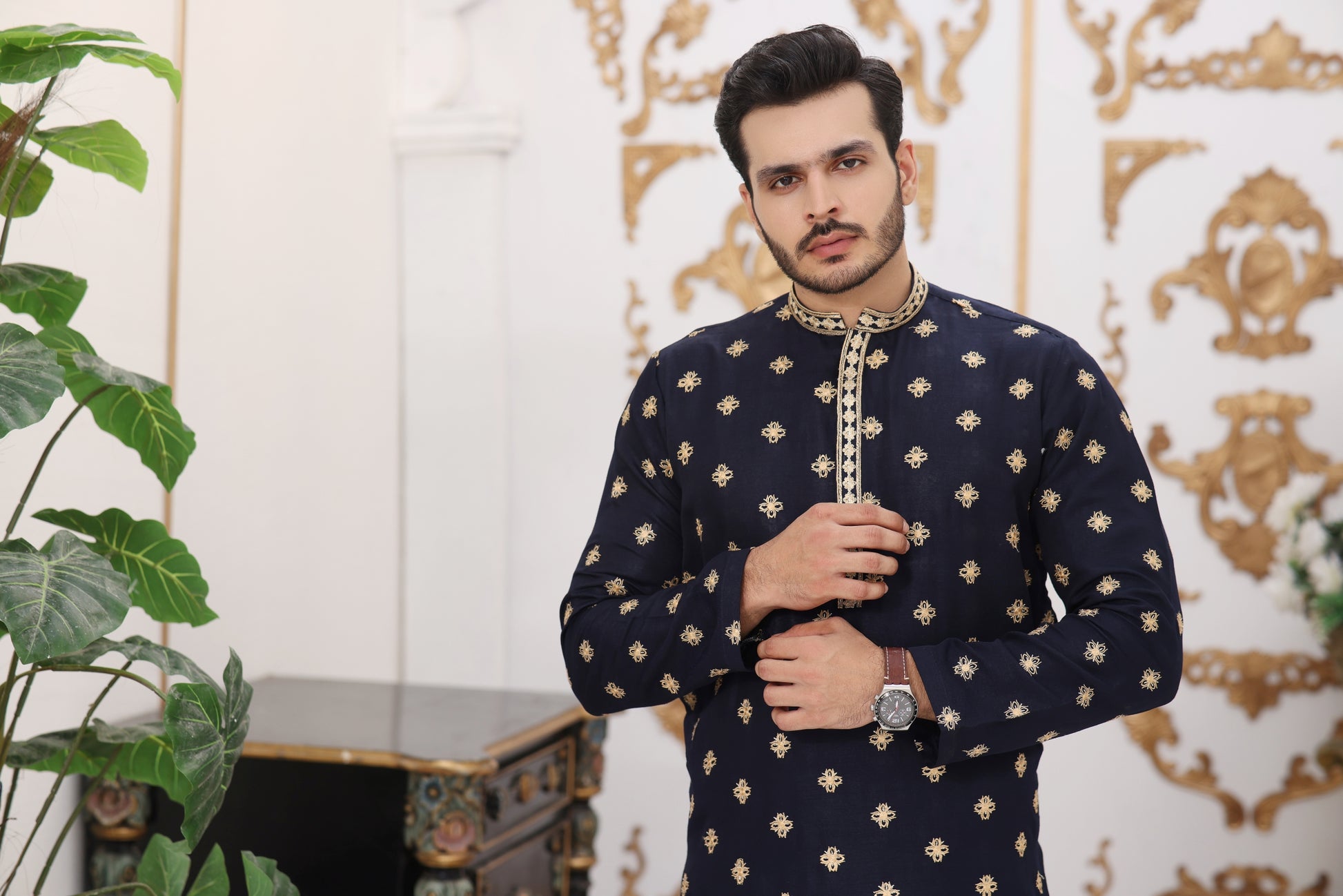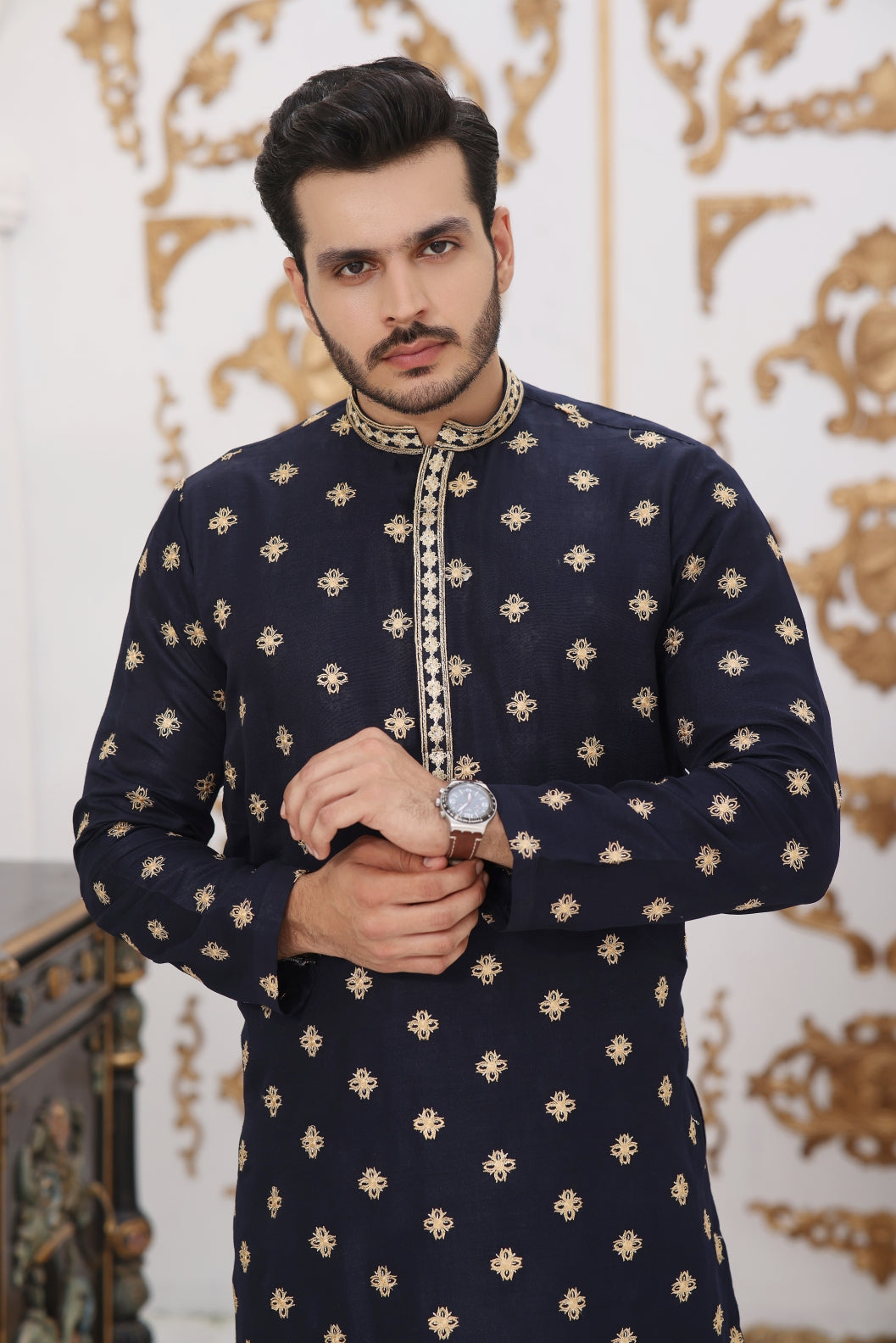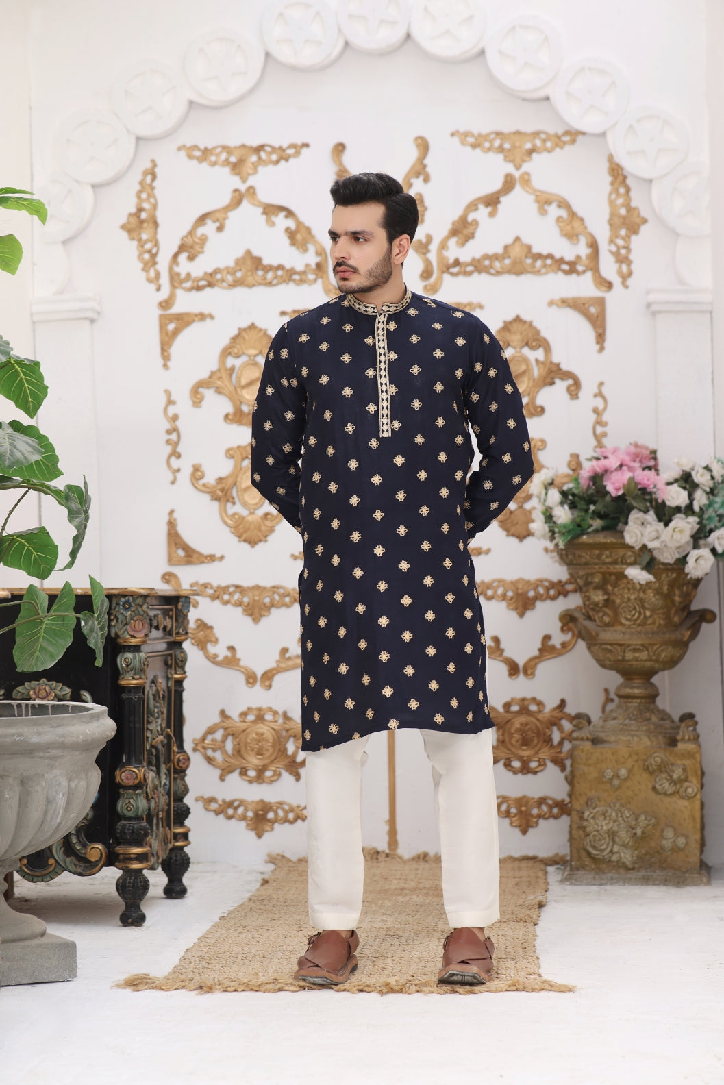 Men’s Formal Kurta With Off White Pajama On Raw Silk Computerized Embroidery on Body, Collar and Plunket with very fine stitched.