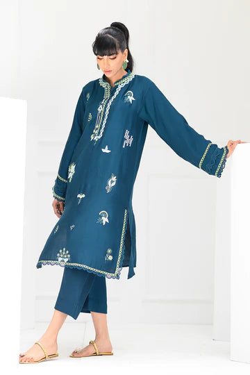 Immerse yourself in this cotton net kurta, resplendent in a teal hue featuring delicate embroidered motives and a