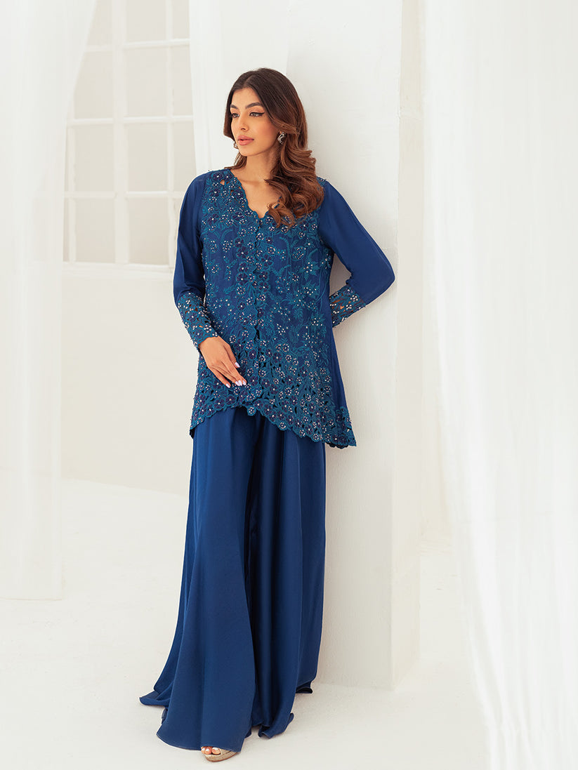 An exquisite blue silk coat boasting resham embroidery, intricate cutwork, and adorned with shimmering diamonte and bead accents, perfectly complemented by coordinating blue crepe silk pants.