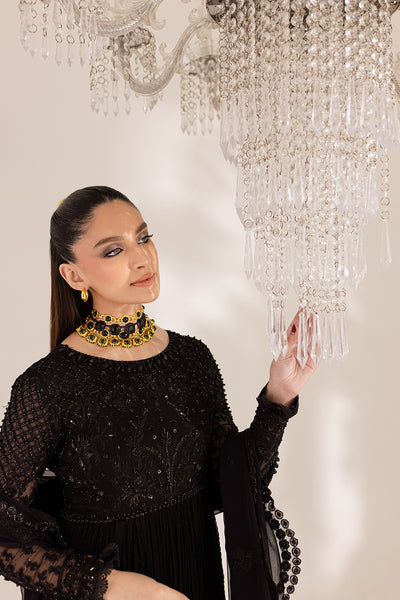 Black chiffon frock enhanced with hand work & embroidery details, paired with trouser & embroidered chiffon dupatta.
