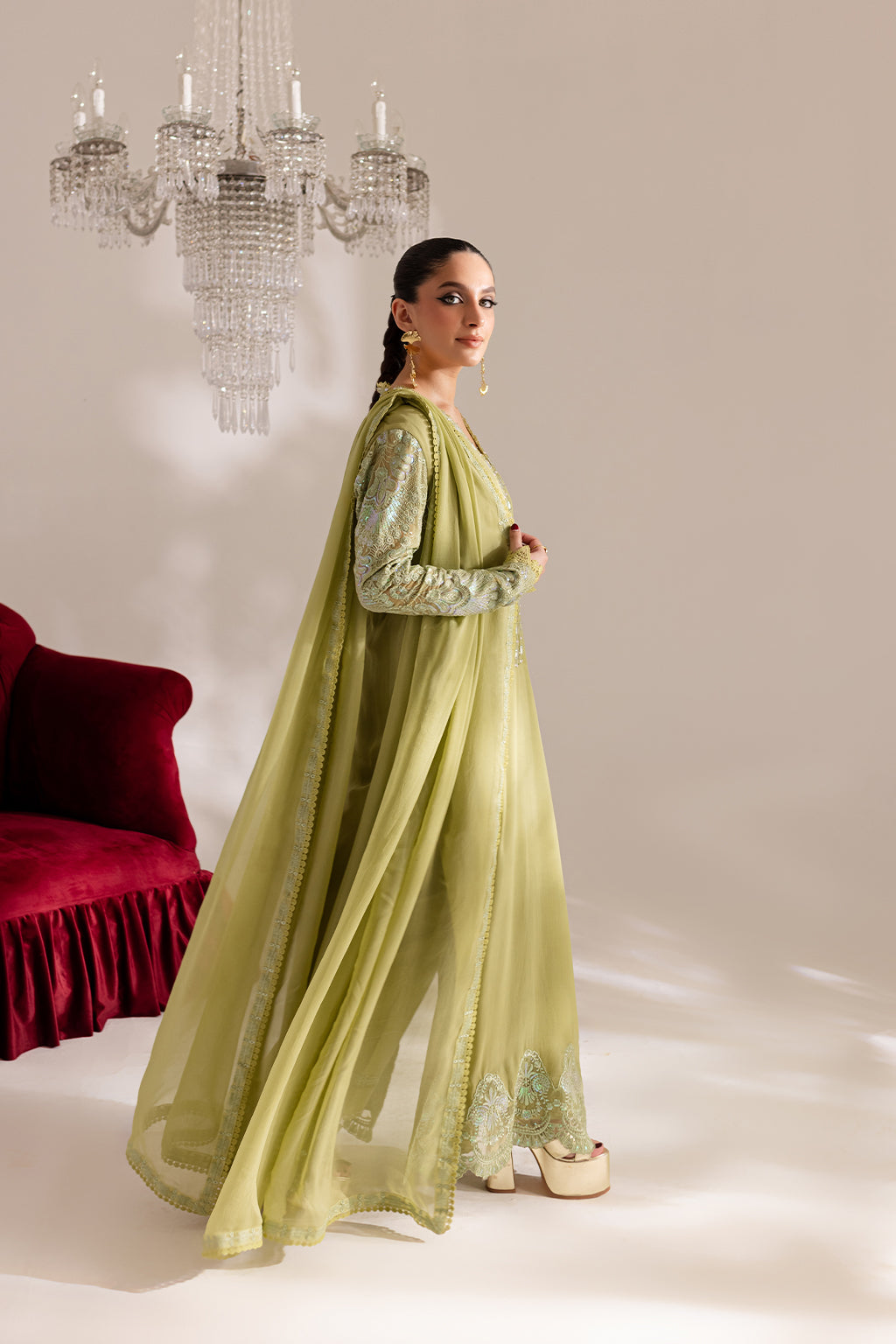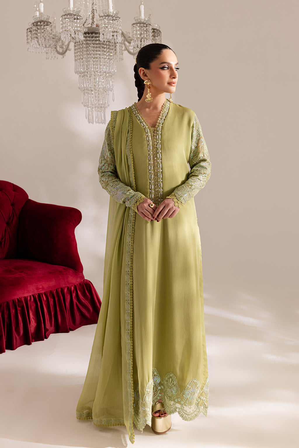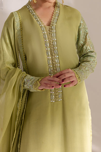 Mint chiffon embroidered long shirt, paired with raw silk straight trouser and embroidered chiffon dupatta.