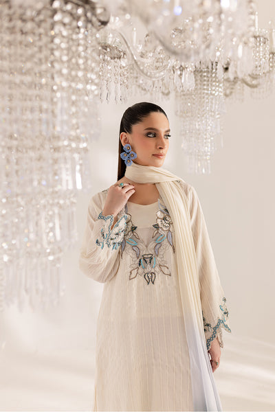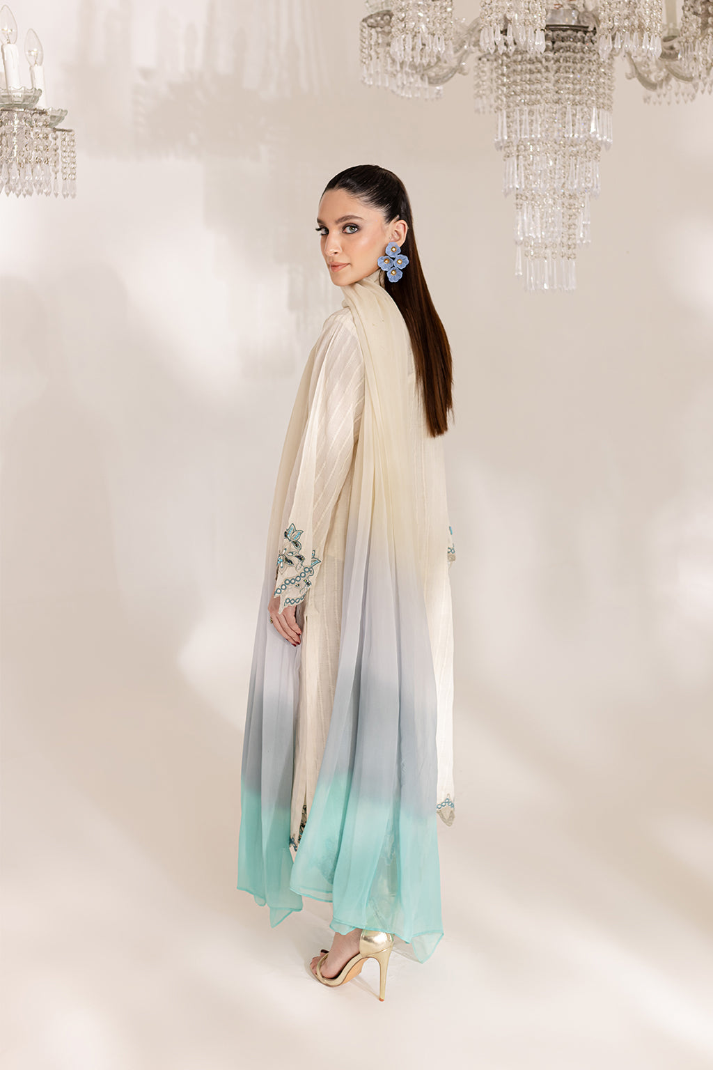 Off white cotton jacquard shirt with delicate hand work and embroidery details, paired with tie & dye dupatta, straight trouser & separate inner.