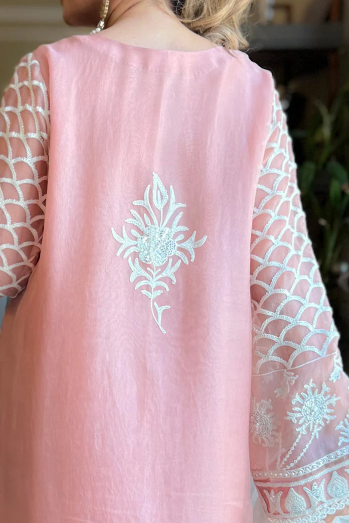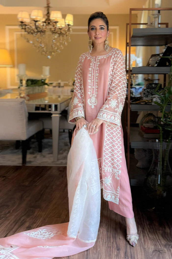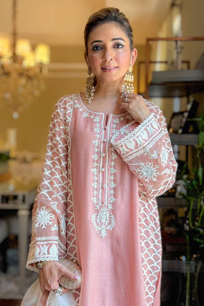 The soft, peach hues paired with intricate white embroidery create a breathtakingly beautiful combination. The elegant dupatta adds a touch of glamor, elevating the entire outfit to new heights of sophistication and style.