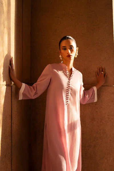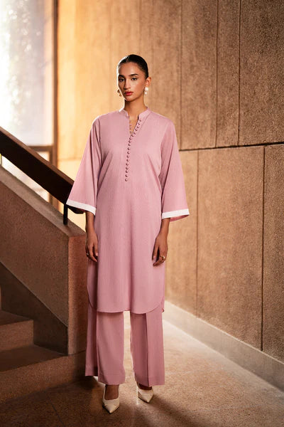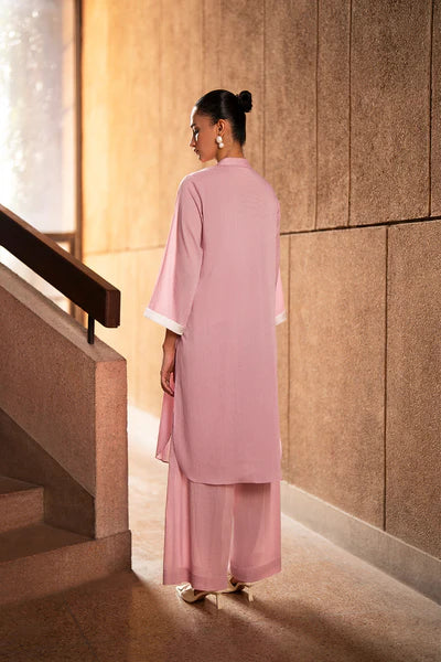 Powder pink shirt with trendy buttons placket, paired with straight trousers.
