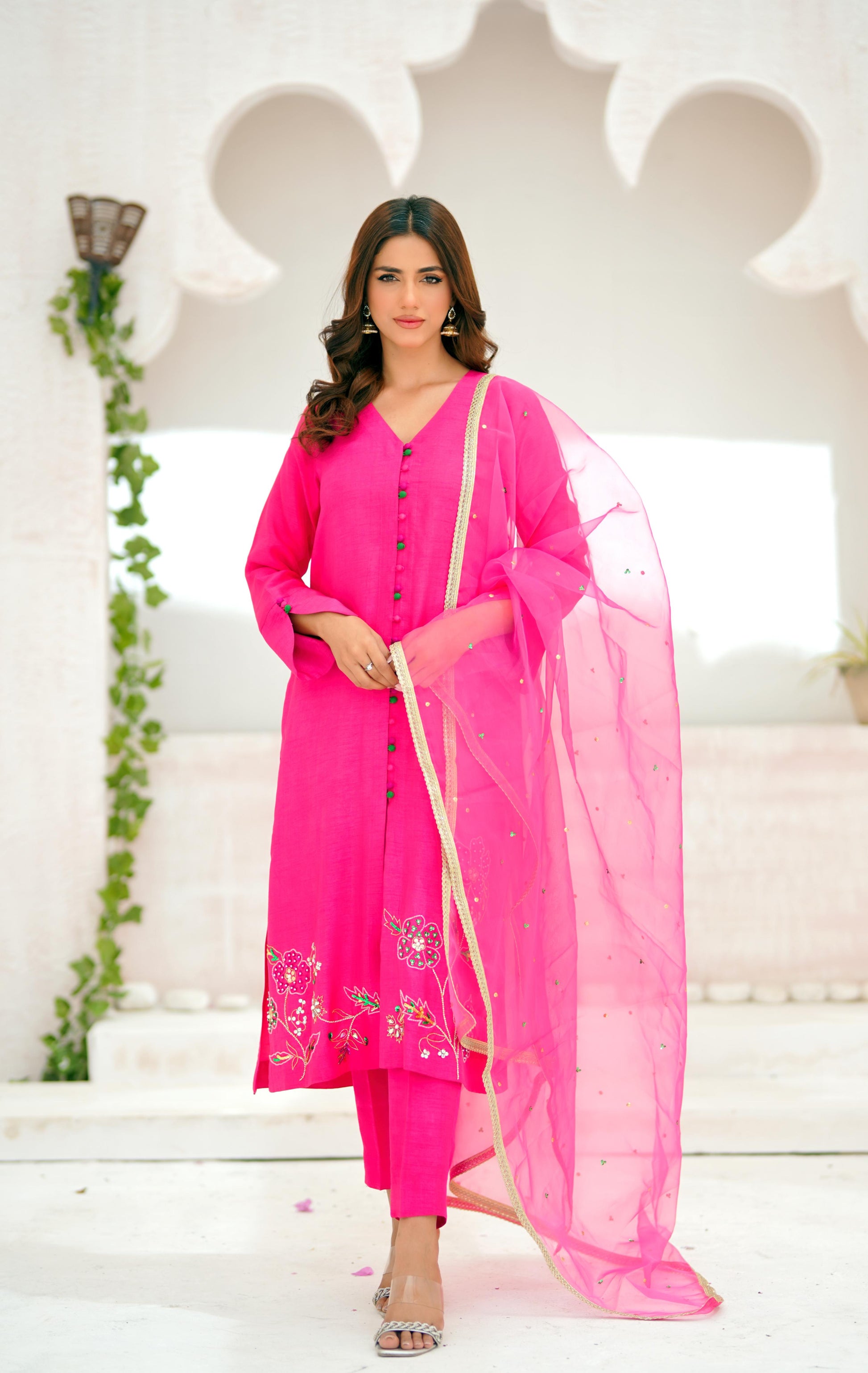 A show-stopping shocking pink pure korean raw silk dress with a front open design, adorned with intricate hand embroidery on the daman, embellished with Japanese beads sequence and crystal Swarovski stones. The Doppata features organza with sequence and delicate lace borders, creating a truly regal and eye-catching look.