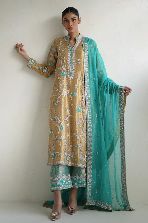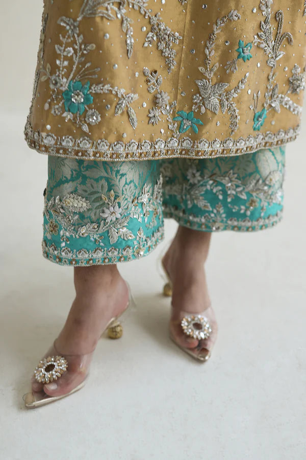 zardozi embroidery. The exquisite design is further enhanced by stunning teal flowers, creating a striking
