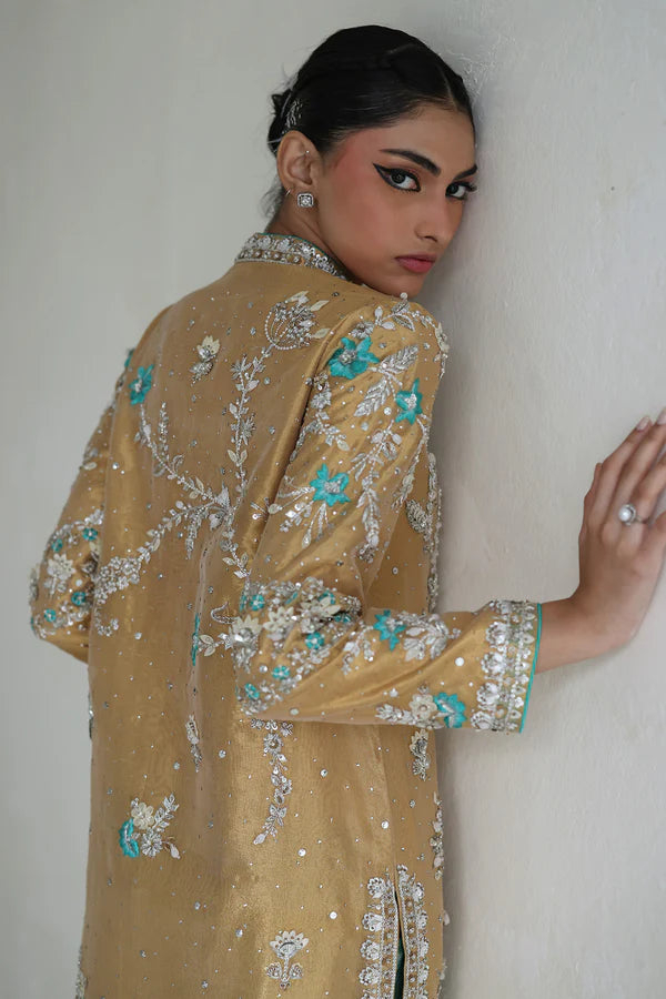 This breathtaking outfit, featuring a luxurious gold tissue shirt adorned with intricate, heavily composed