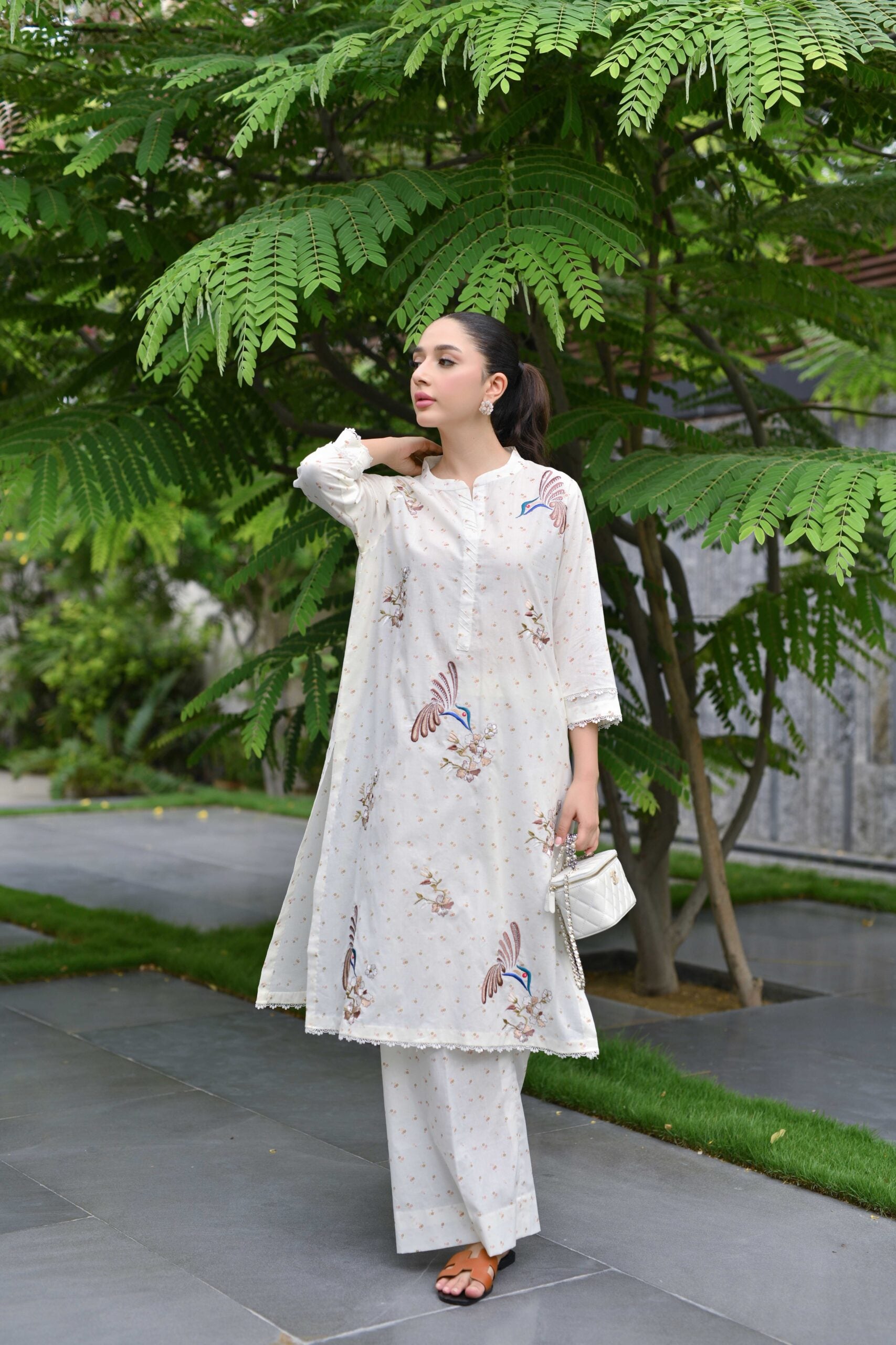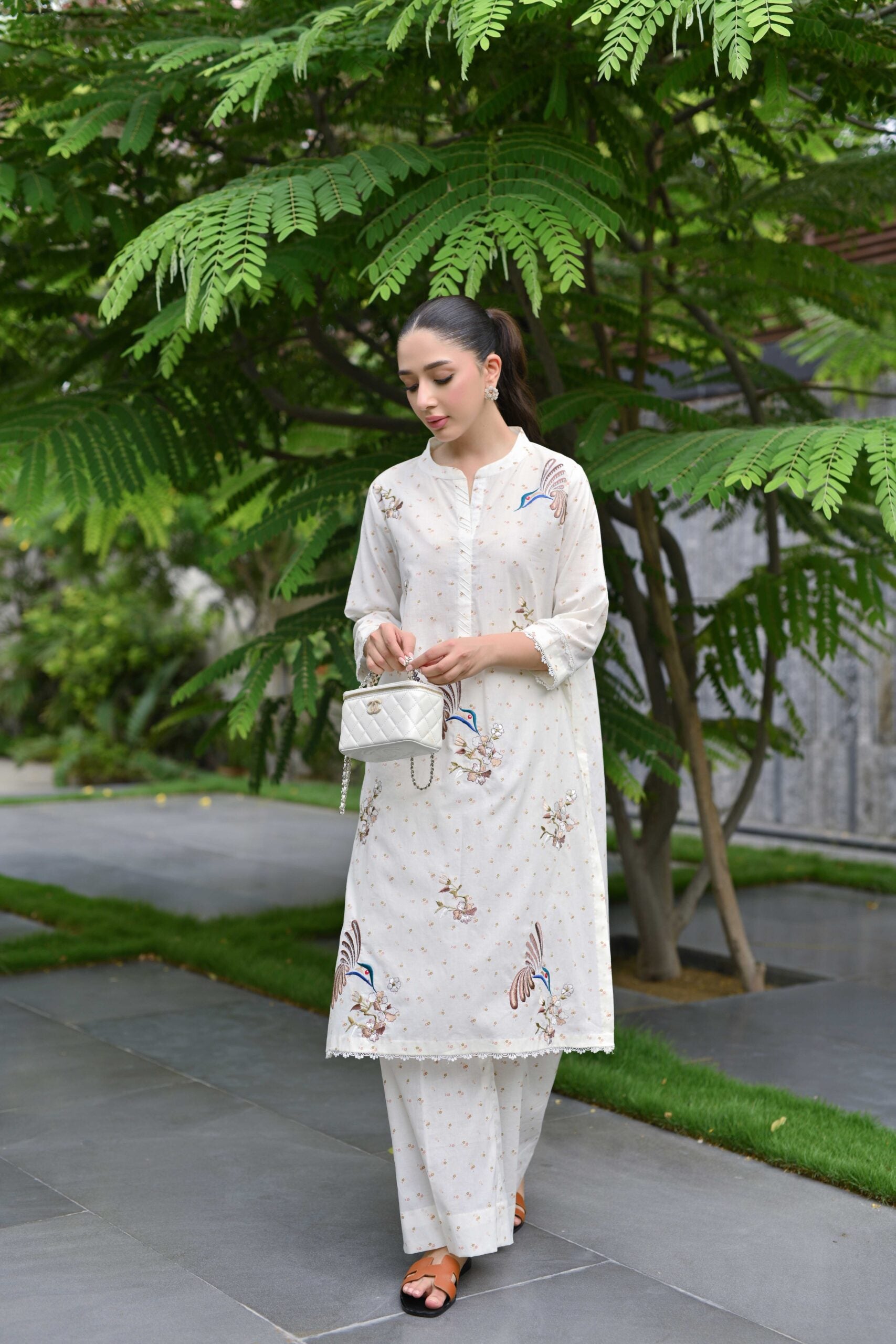 A light and airy Swiss voile shirt, intricately detailed with delicate embroidery. The look is completed with