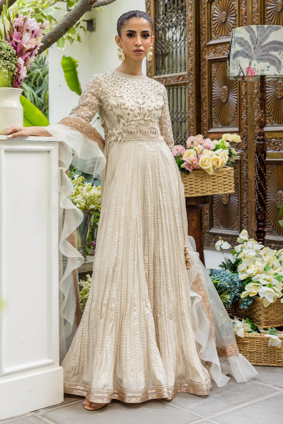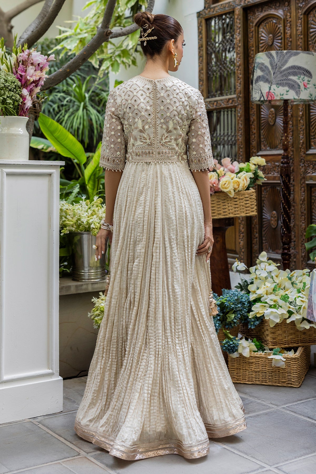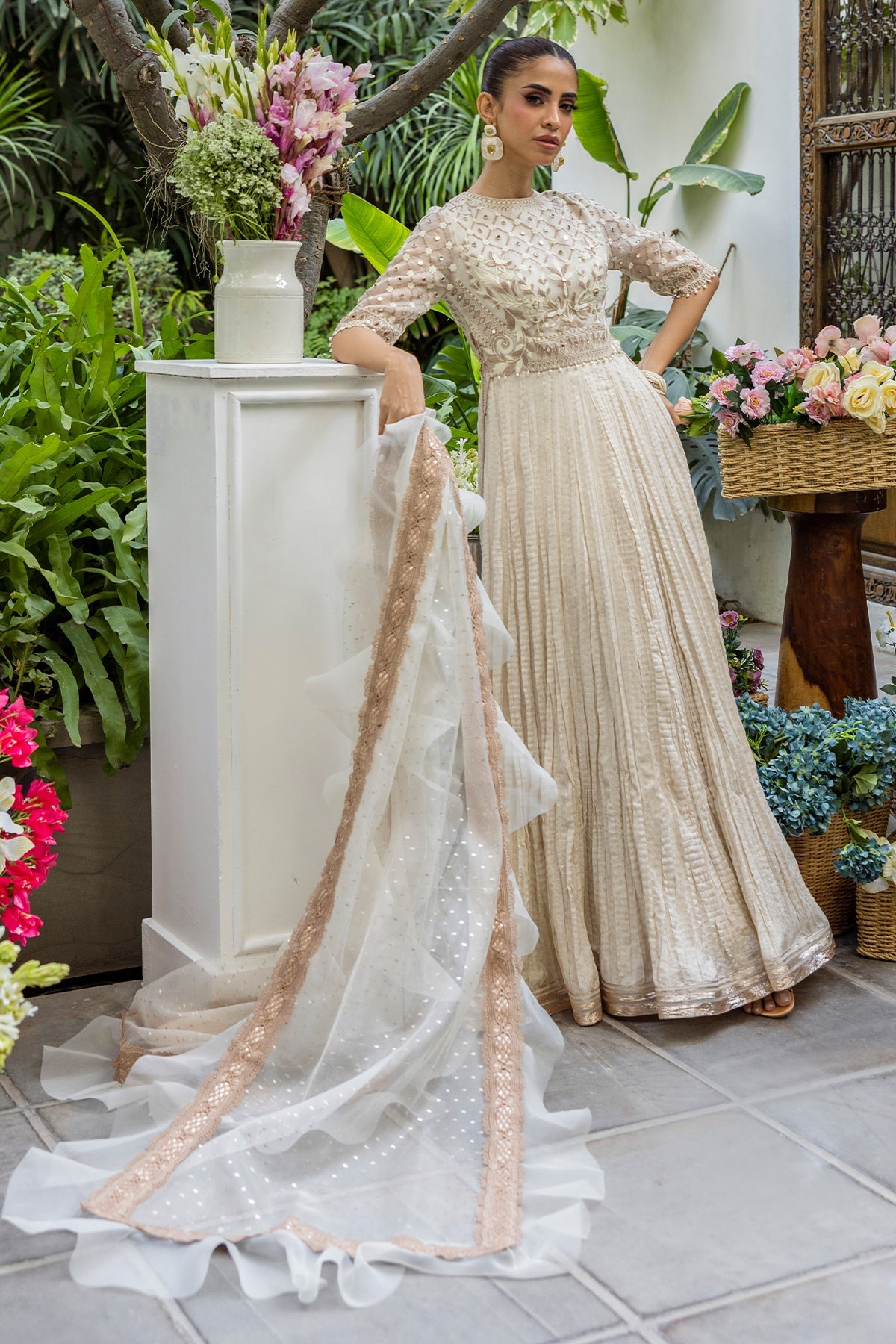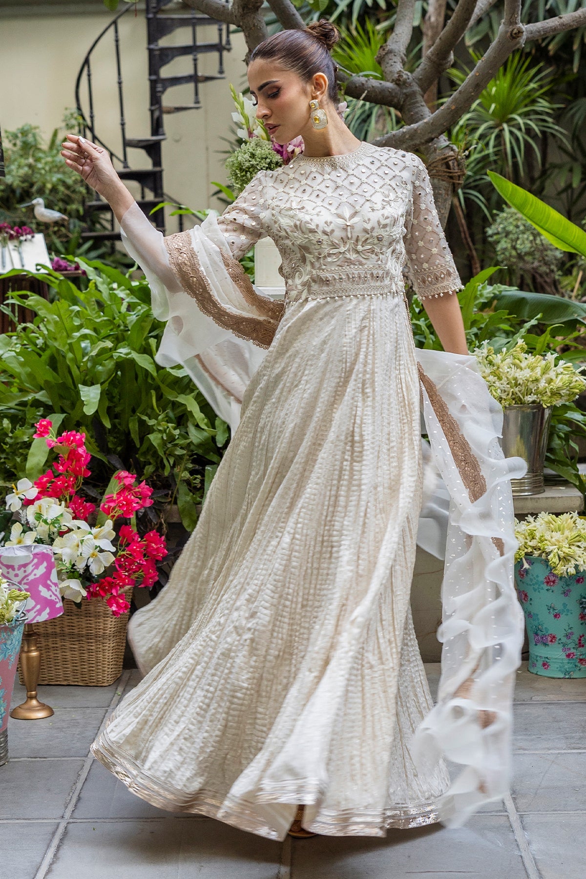 Drift into a world of ethereal beauty with this Dori embroidered organza bodice, adorned with handcrafted 3D florals and shimmering mirror accents. The lorex crushed fabric glows with gota-edged detailing, while the whimsical frill dupatta adds a fluid, dreamlike charm. A mesmerizing blend of tradition and modern grace.