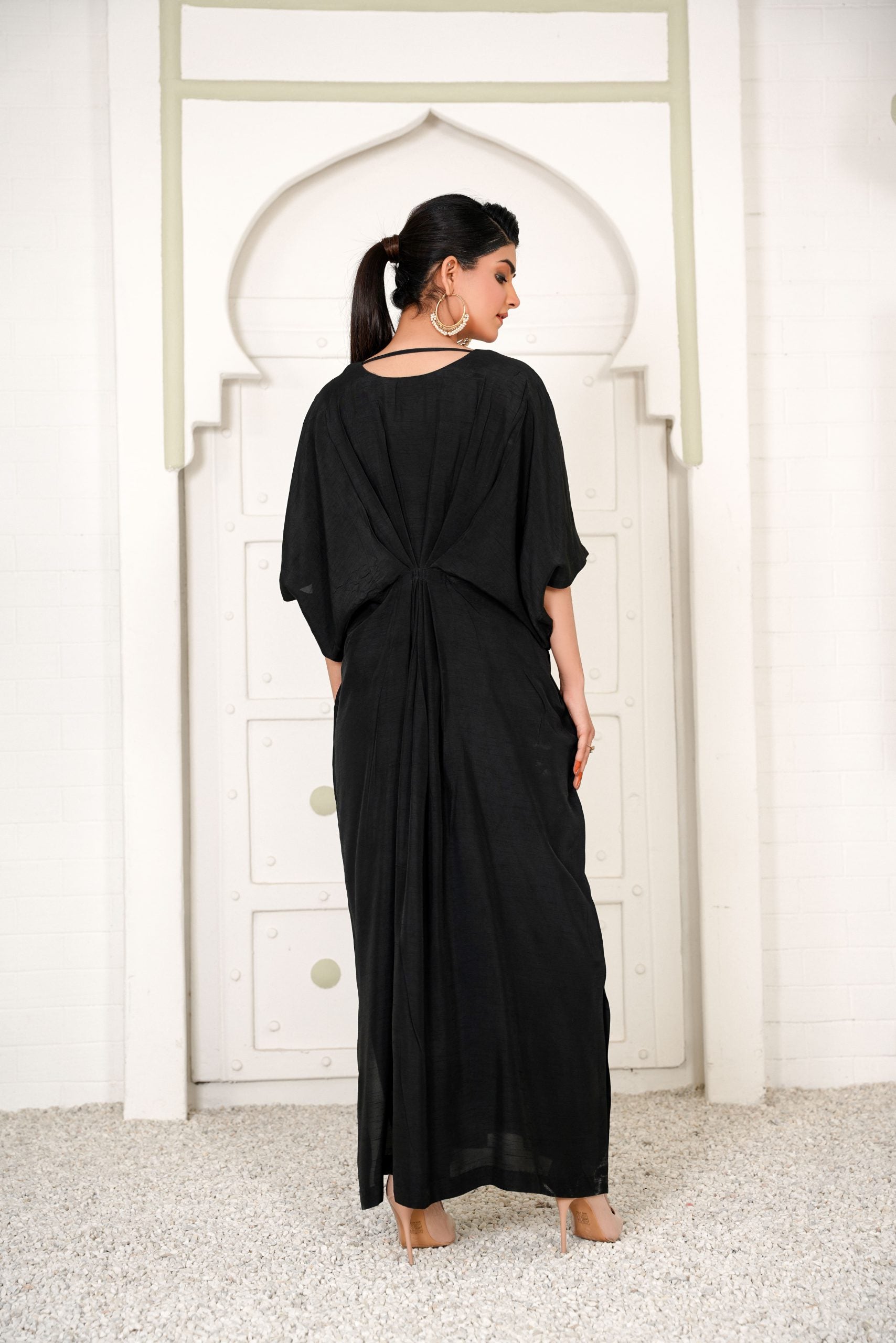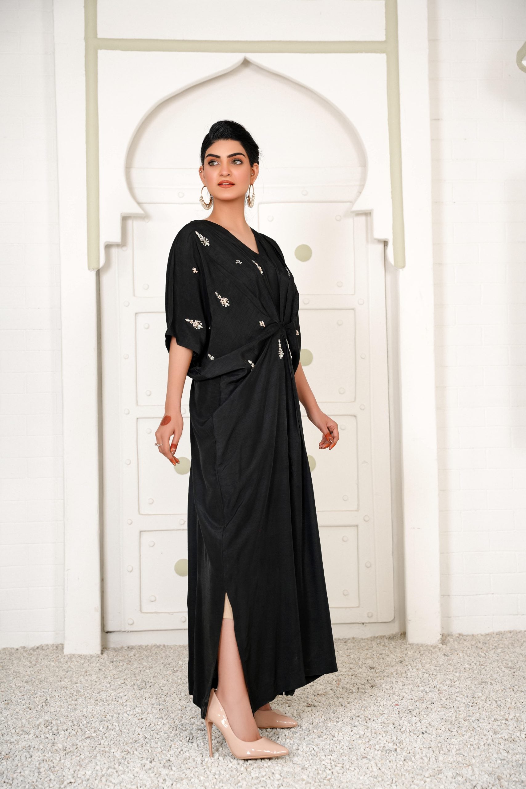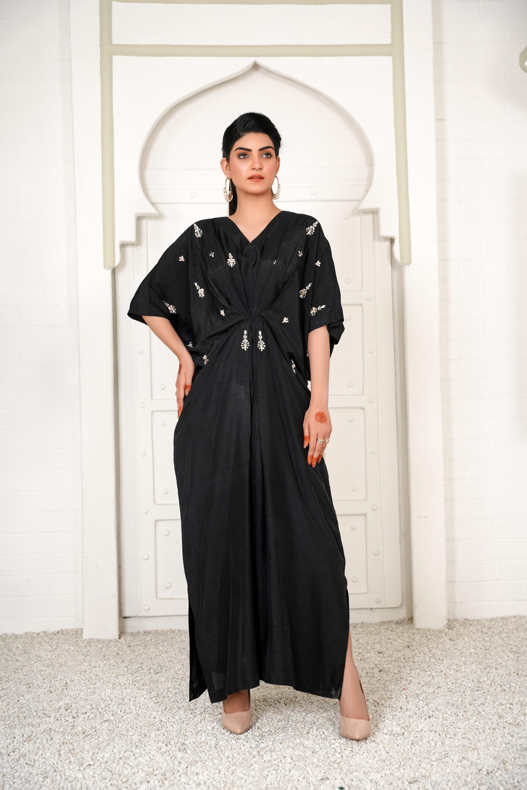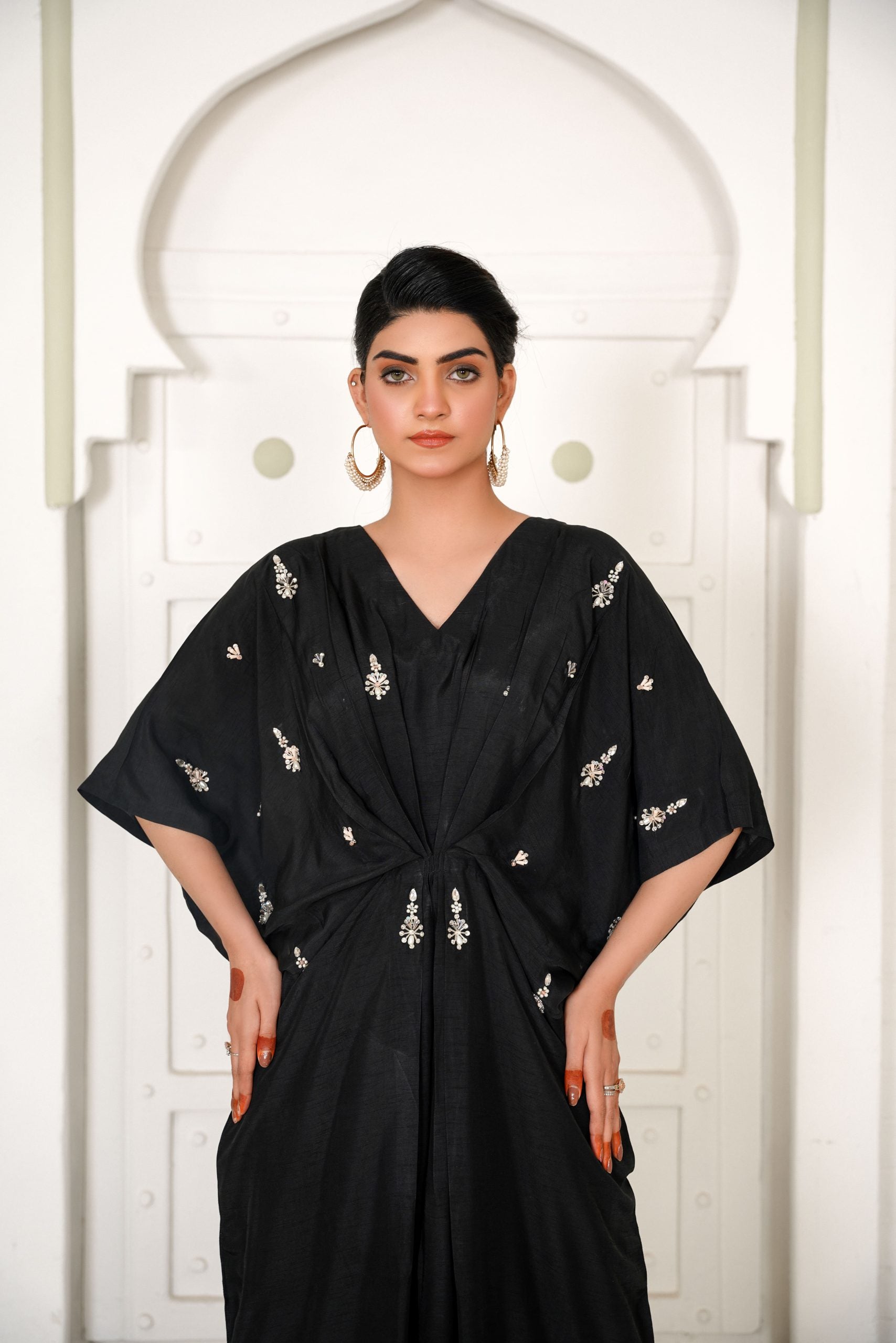 Lara is a black celestial kaftan with pearls and crystal motifs half of the front. It gives you a dreamy look which evokes the feeling of eternity. Kaftans will be free size with 56 inches length but can be customizes as per requirements.