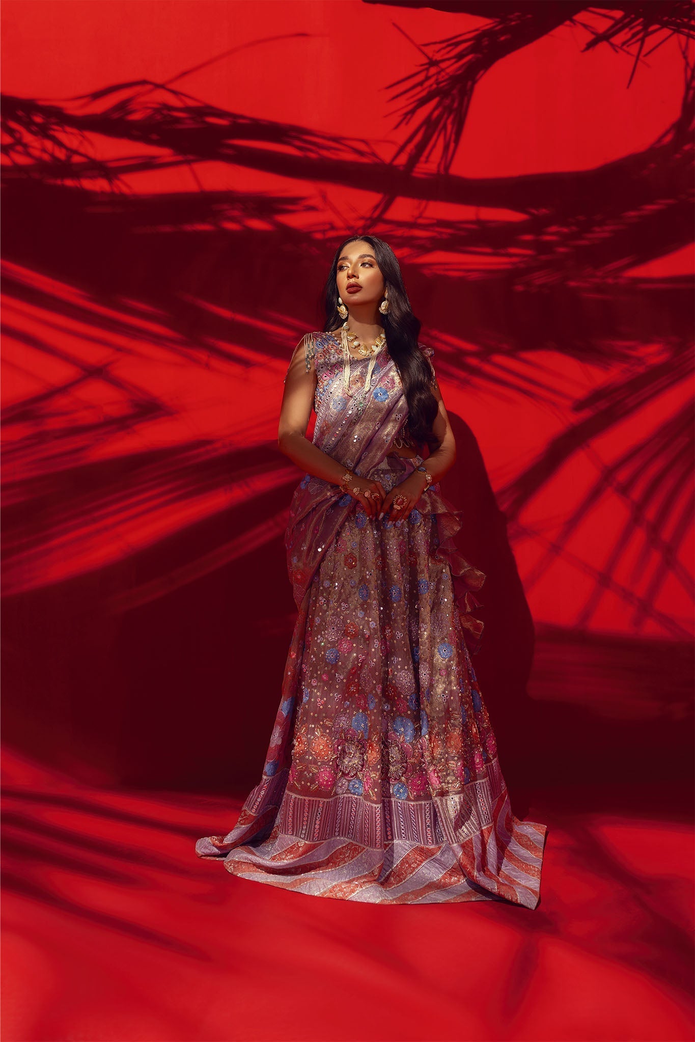 Redefined ethernal charm in this lilac lehnga choli. The raw silk choli is embroided with flowers detailed with hand embellishments on it and sleeves. This choli is paired with matching shimmer organza lehnga embroided back and hand embellishments on front finished with gotta and jamawar. It is styled with self printed machine embroided shimmer organza dupatta woth frill and jamawar finishing.