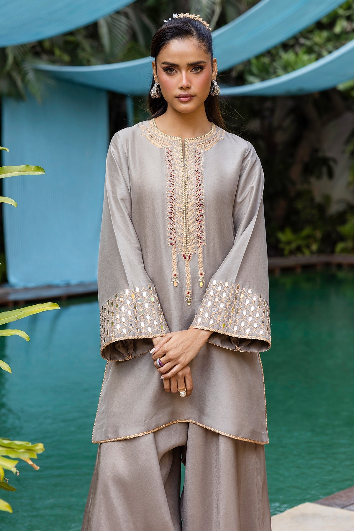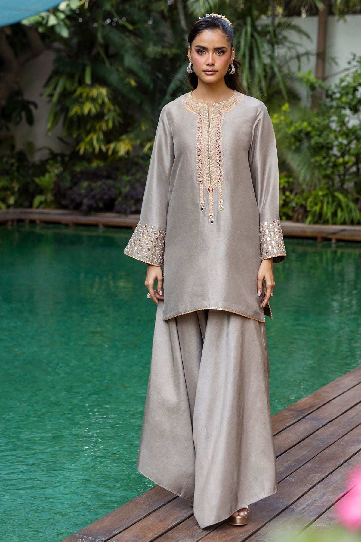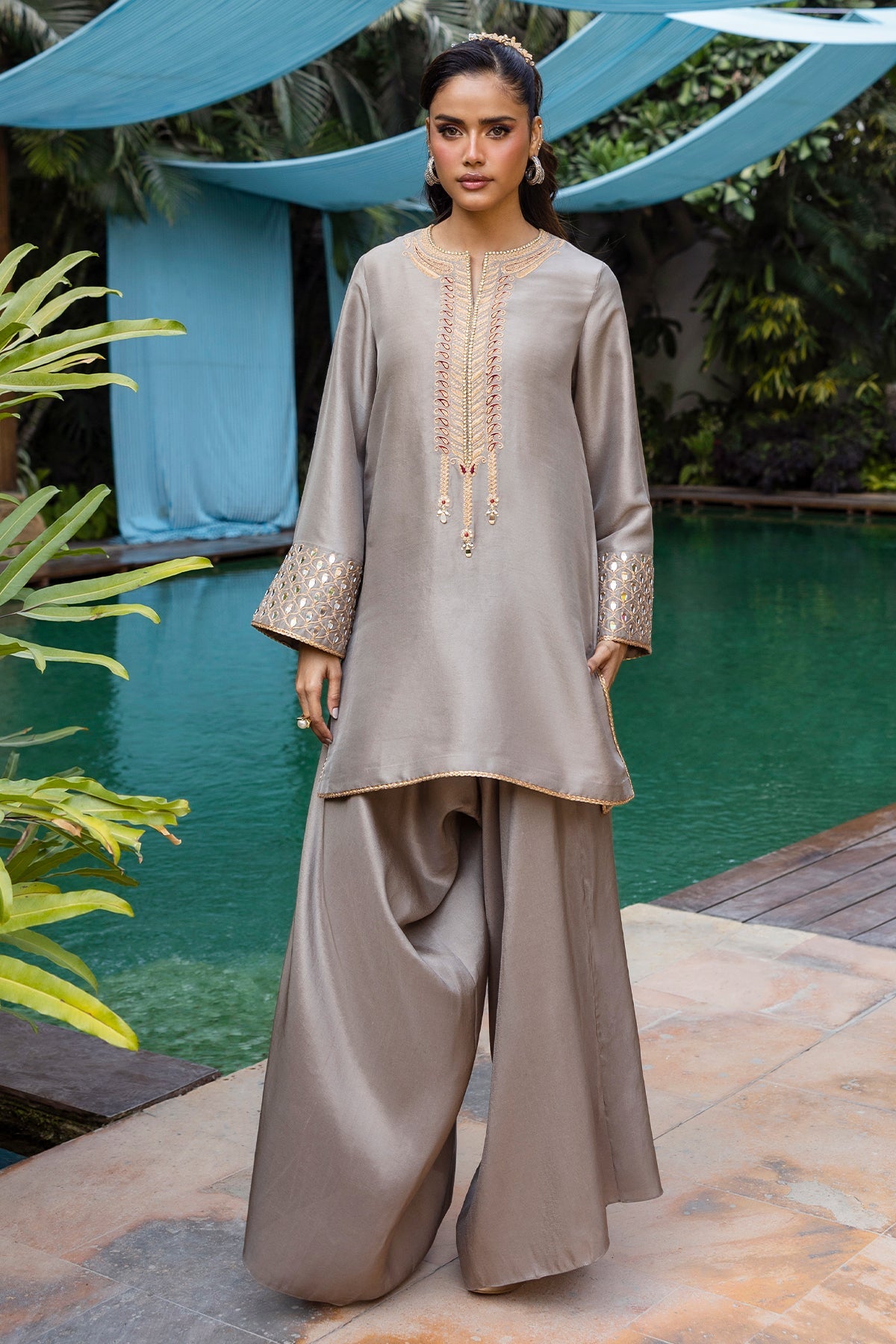 A graceful combination of texture and detail, this Dori embroidered raw silk top is enhanced with adda work and mirror embroidery, while a maroon-accented neckline adds depth to its aesthetic. Paired with raw silk loose pants, it’s a perfect choice for effortless elegance.