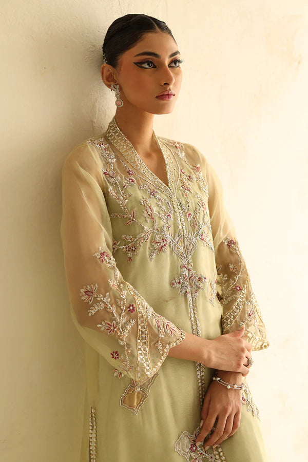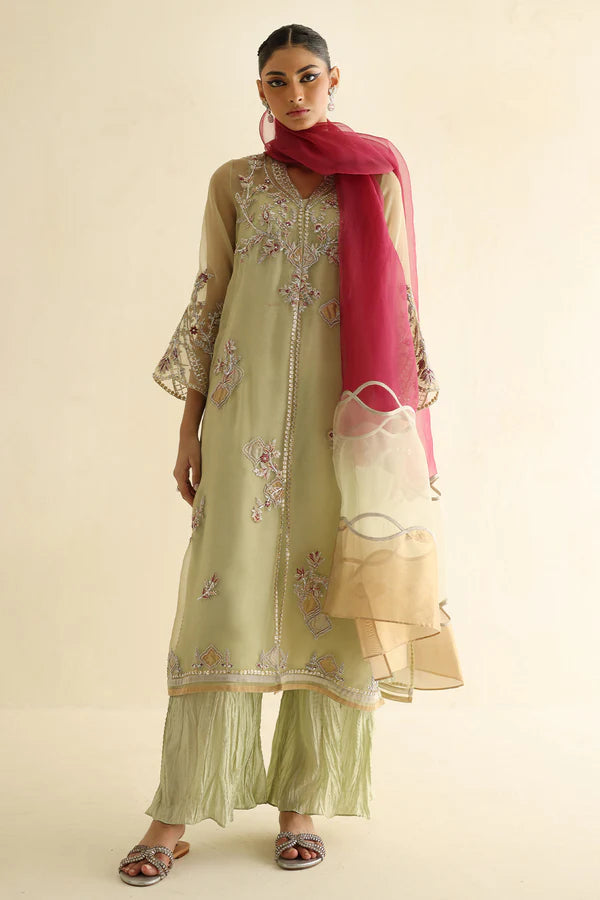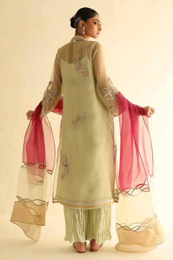 crafted to create a visual effect. Paired with a contrasting dupatta and crushed culottes, this ensemble is