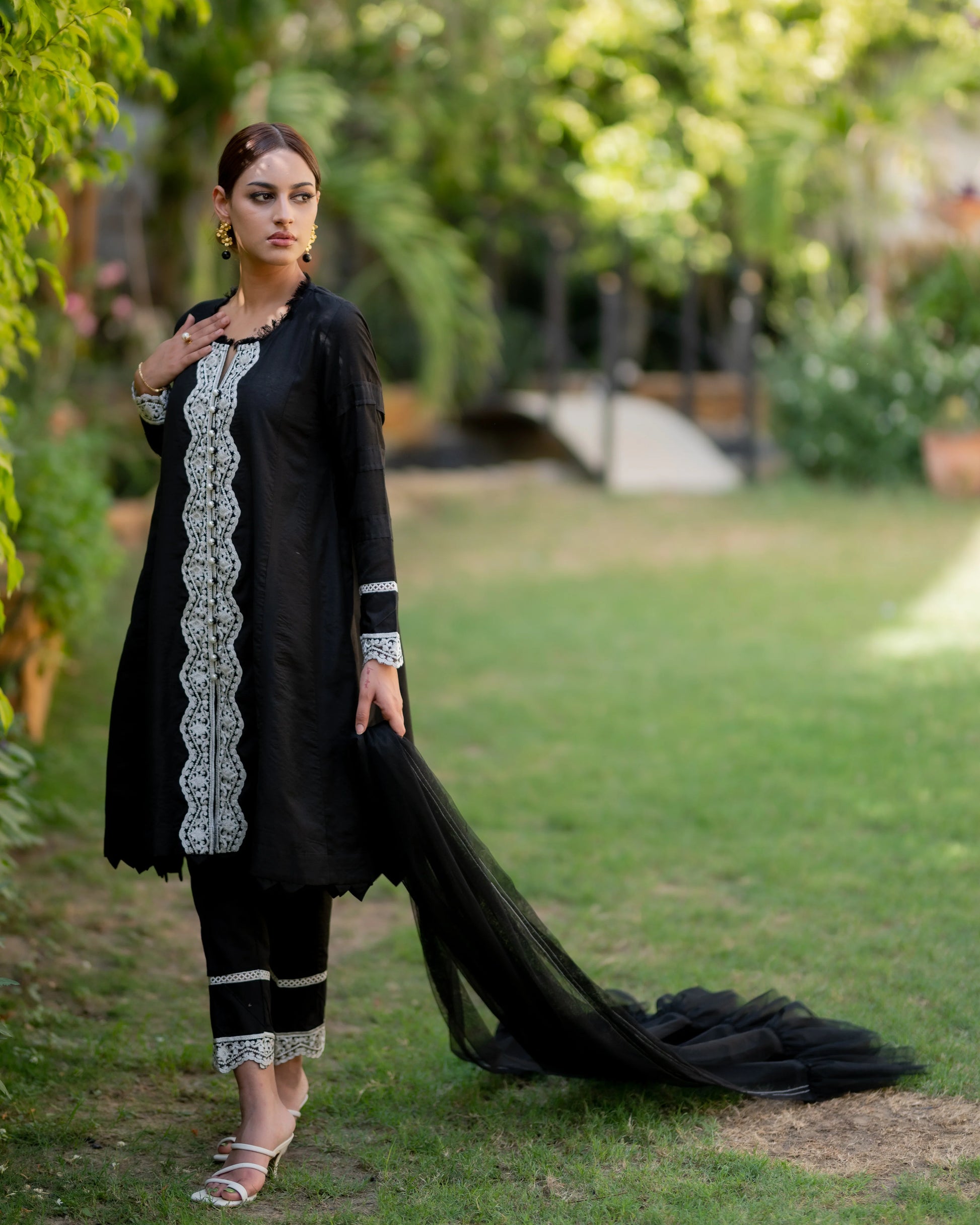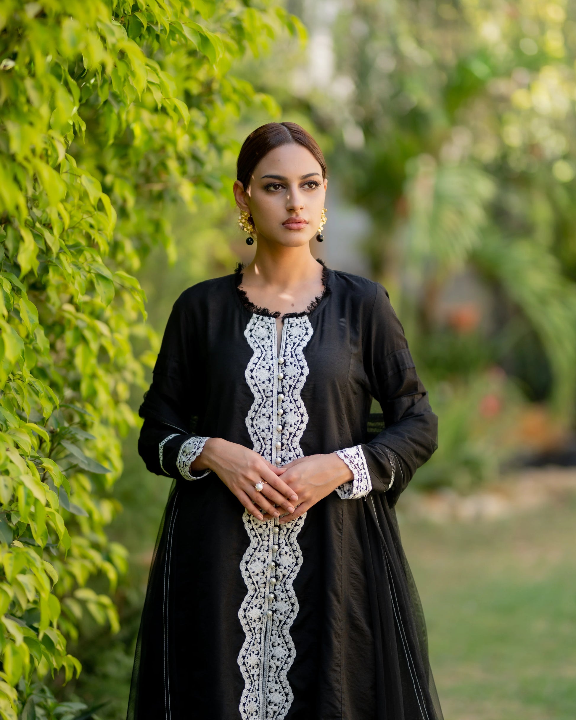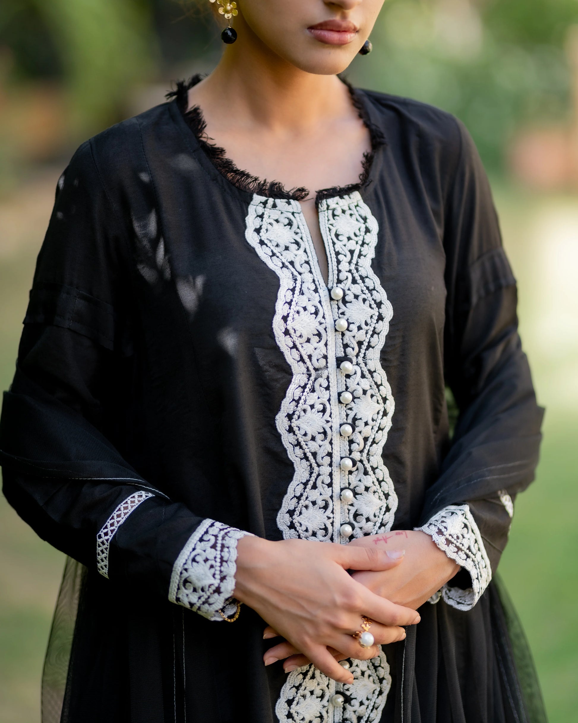 Black Katan silk kalidar with side slits. Adorned with floral embroidery and lace in ivory on neck and sleeves. Paired up
