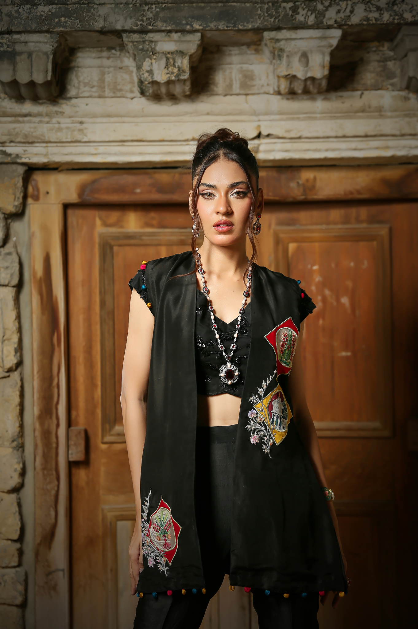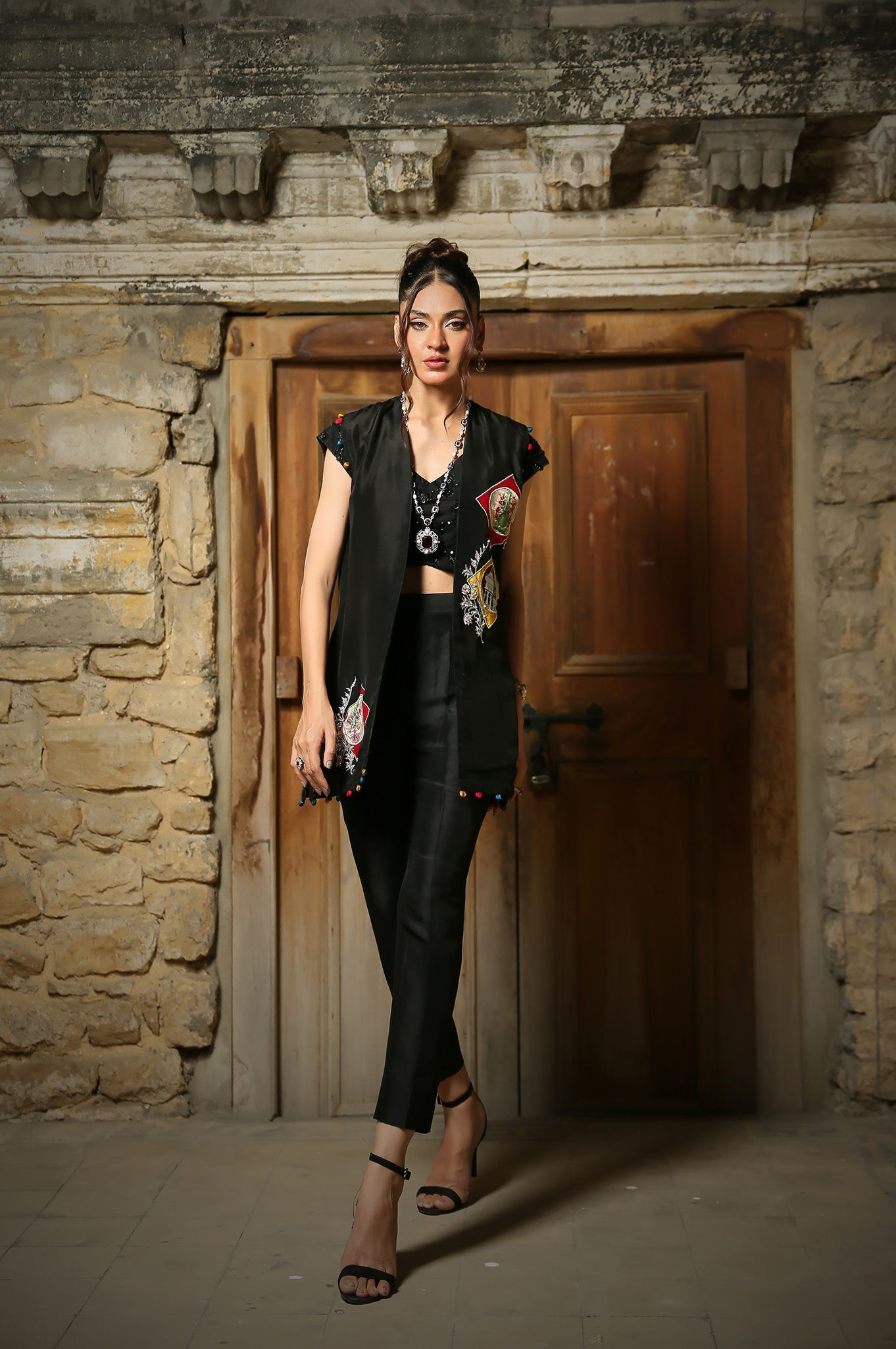 Make a striking fashion statement with our Mahi ensemble, meticulously crafted from premium raw silk. This sleek black set is designed to turn heads, combining modern chic with ethnic detailing. The tailored silhouette exudes a refined yet bold style, perfect for those who appreciate subtle luxury. The sleeveless open-front jacket is adorned with vibrant embroidered patches and playful multicoloured pom-poms along the edges, offering a fresh, creative contrast to the minimalistic black backdrop. The slim-fit pants and cropped top create a balanced and sophisticated look, while the intricate patchwork embroidery adds a hint of traditional artistry. The raw silk fabric enhances the richness of the outfit, making it ideal for women who seek comfort without compromising on elegance.