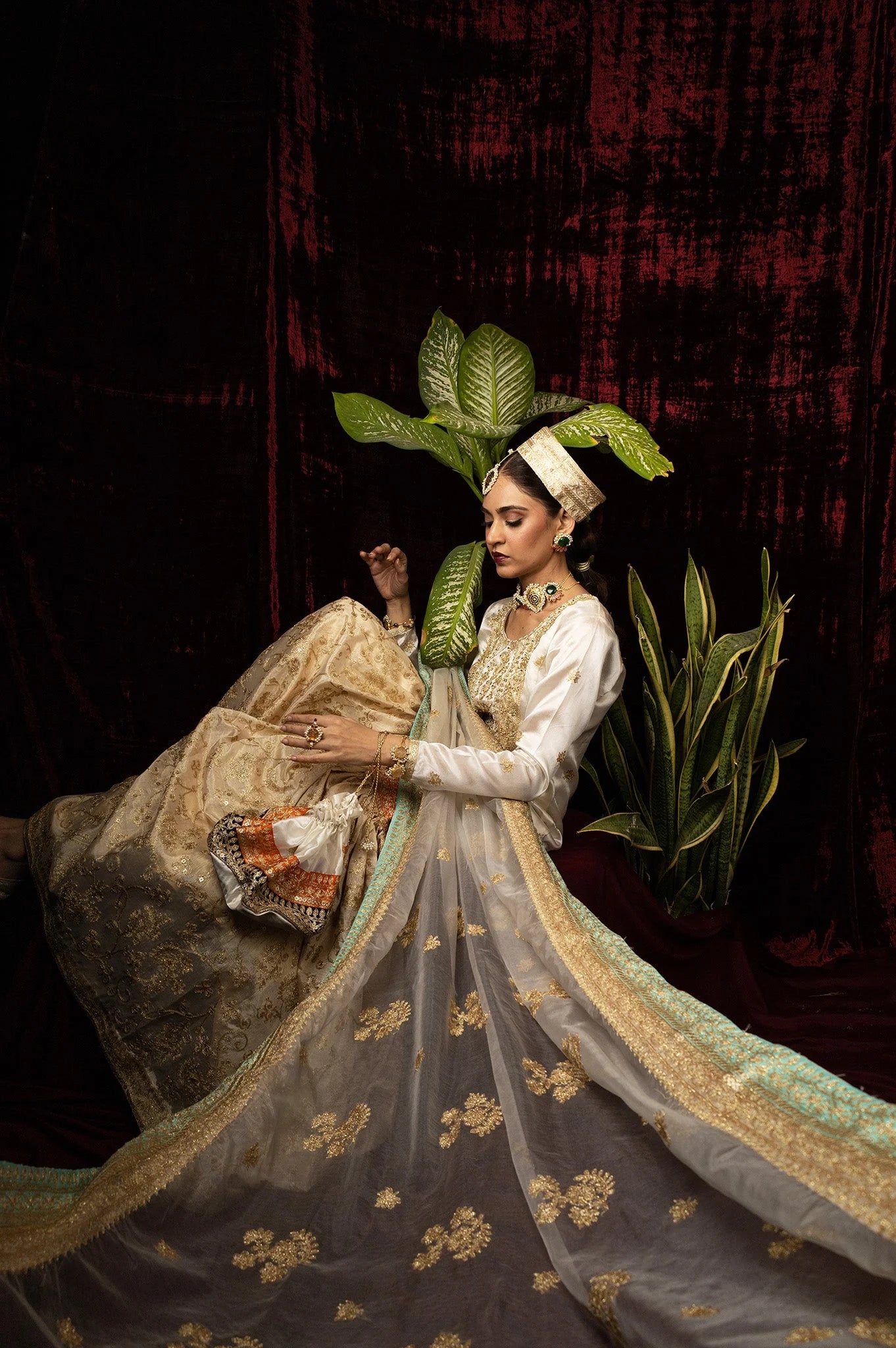 Paired with an embroidered gharara and a graceful organza dupatta featuring contrasting lace