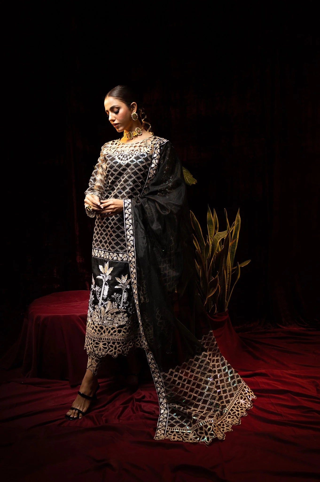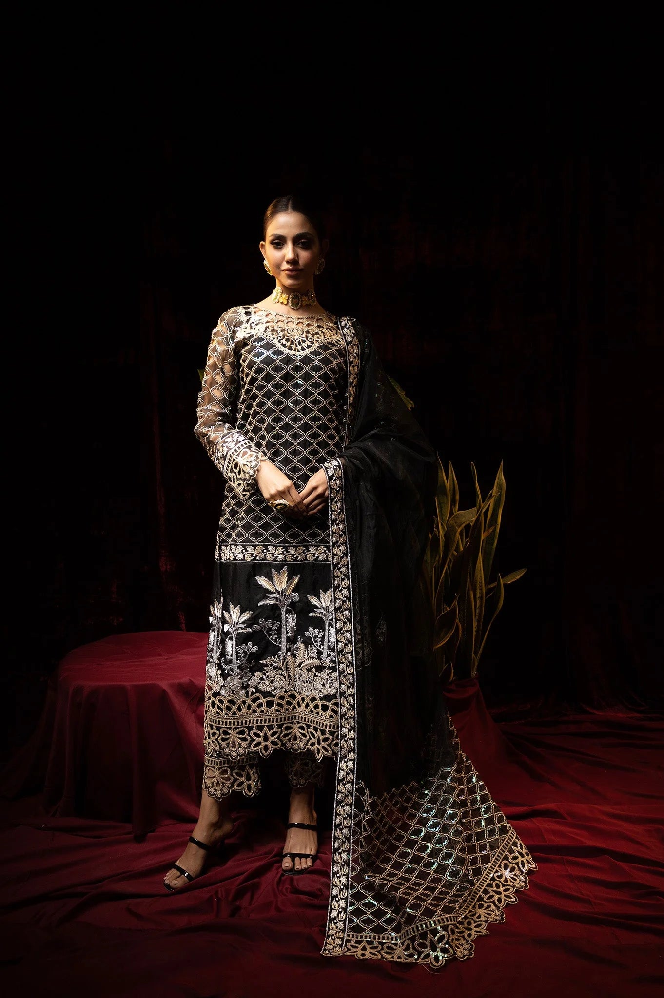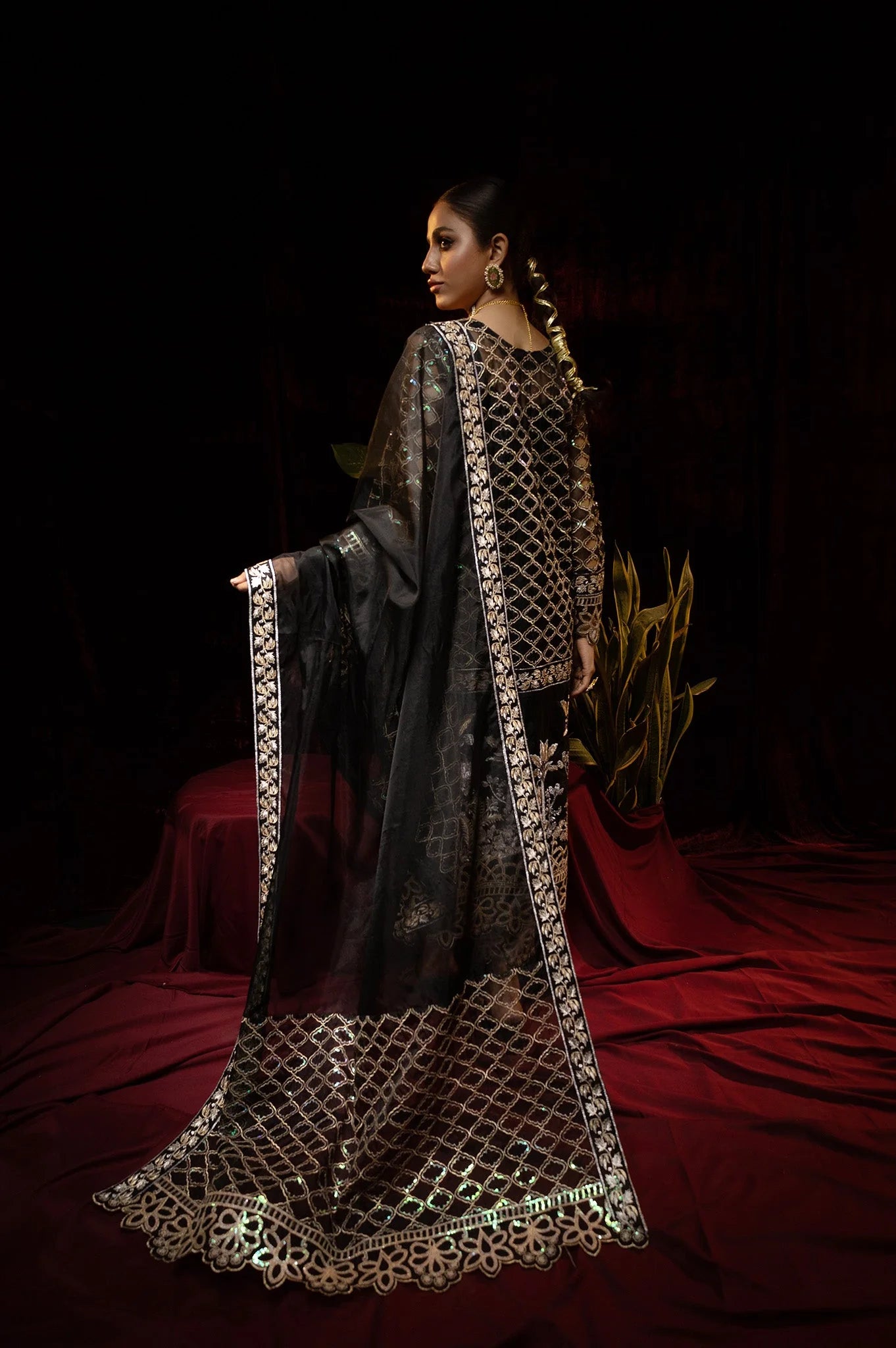 Exude elegance in our Mahtab Black Suit. The Organza shirt boasts intricate resham and emerald