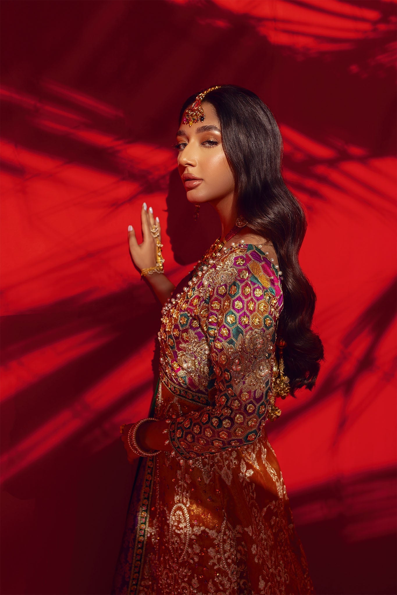 A long multicolor panelled shimmer organza pishwas with geometric worked bodice. The whole piece is finished with beautiful gotta, pearls, kora and sequence work to elevate the piece. It is paired with Jamawar lehnga and pink chiffon dupatta with full embroided borders.