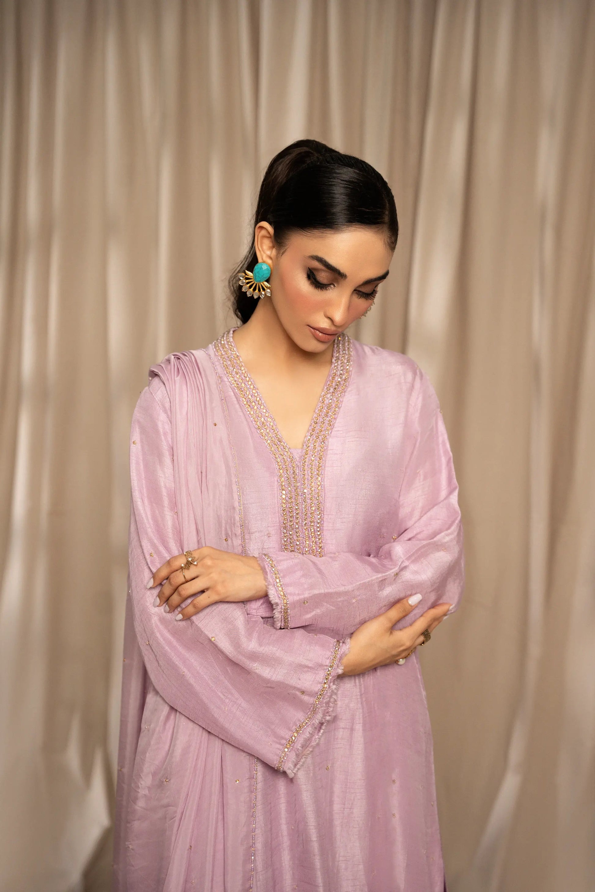LIA - Festive Formal: The ensemble features a lilac korean raw silk long shirt embellished with delicate Swarovski linear neckline and chaan all over. Full sleeves finished with frayed edges. and culottes with medium silk dupatta adorned with Swarovski and lotus inspired cutwork embroidered edges. A relaxed charm this festive season.