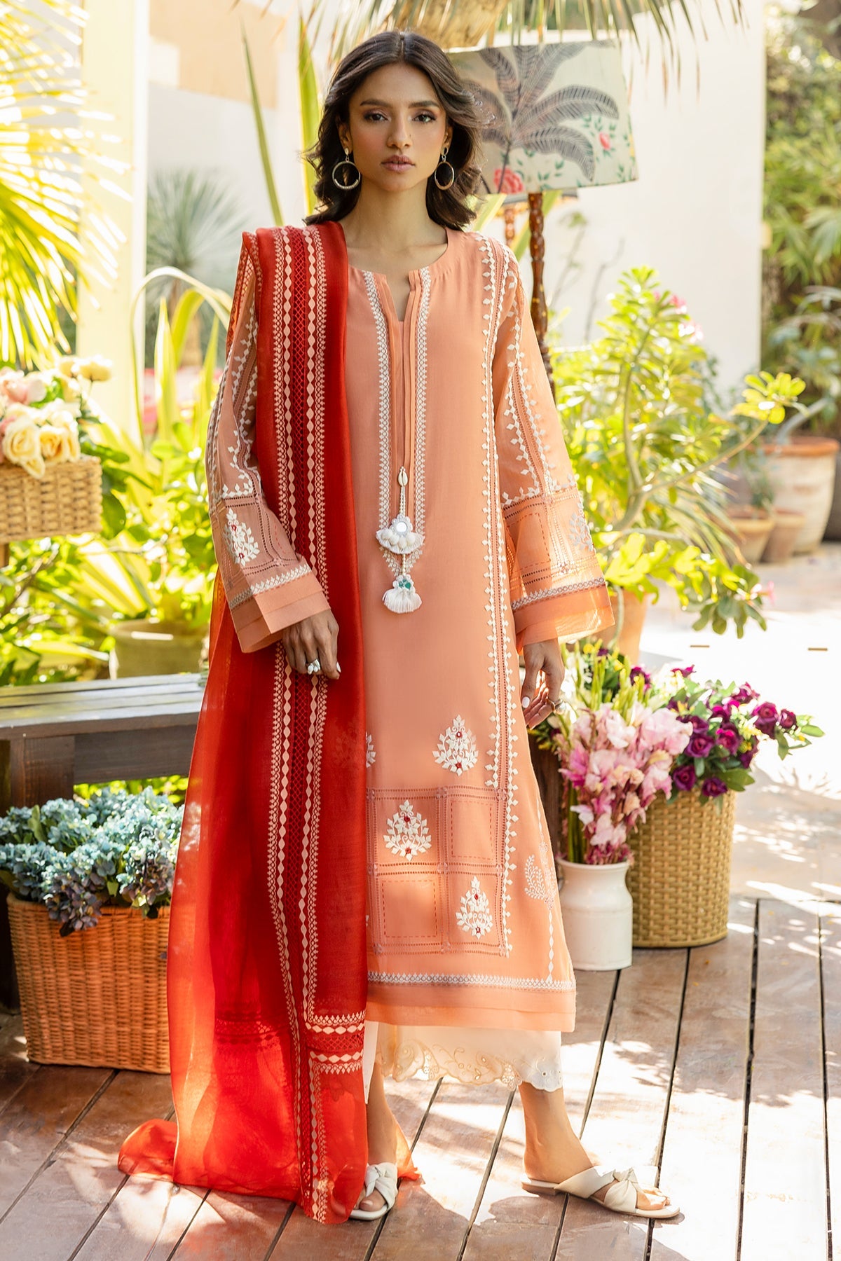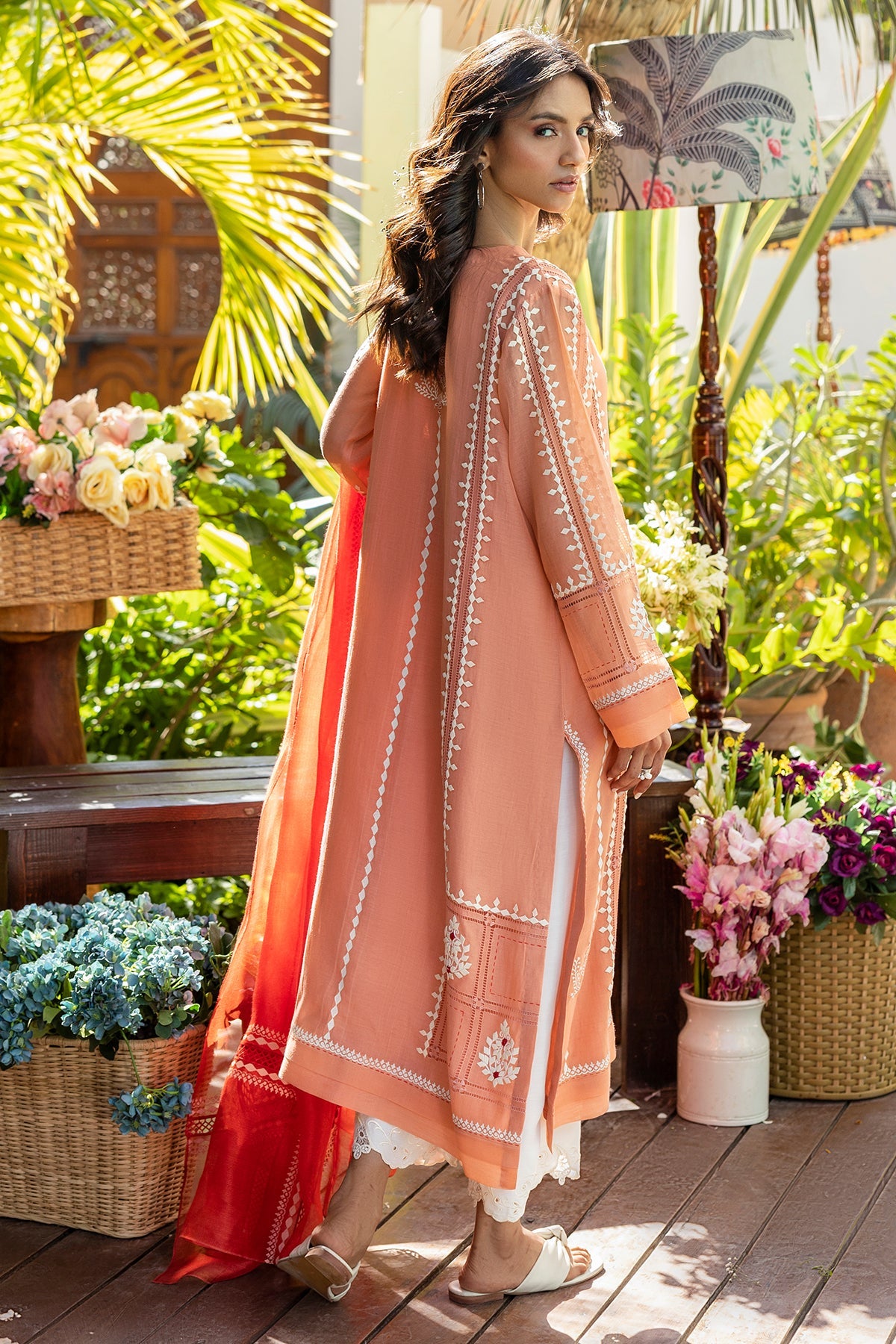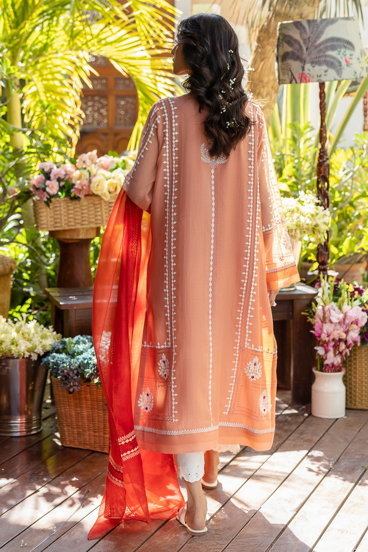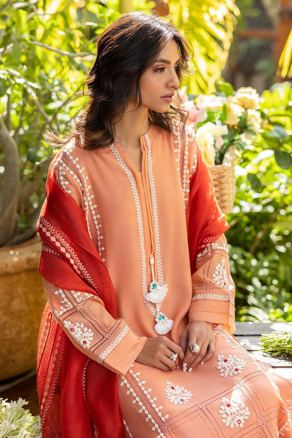 A stunning coral Taarkashi shirt adorned with tukri work, block print, and mirror embroidery in rust. The rust block-printed dupatta with lace details completes this sophisticated, artisanal ensemble.