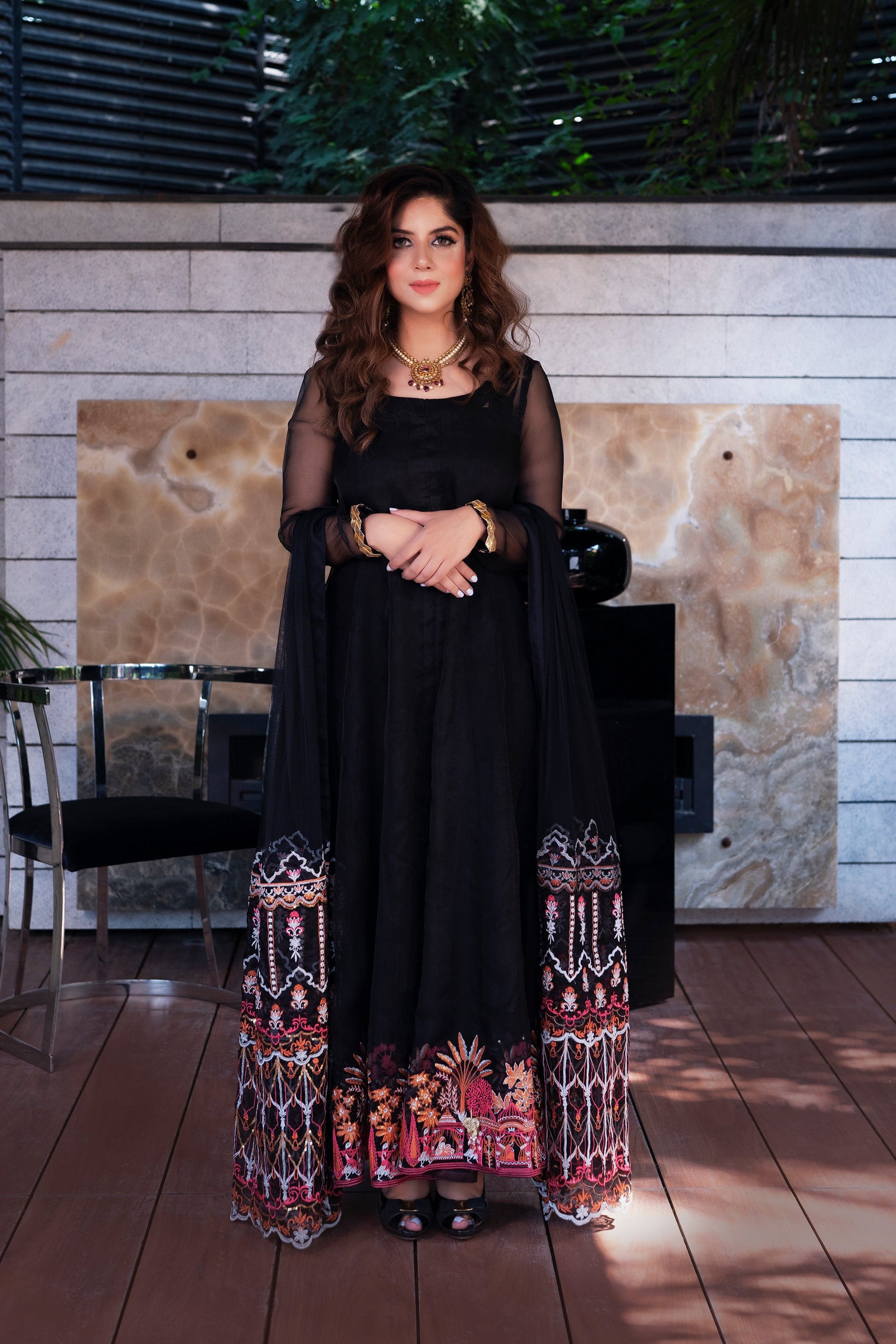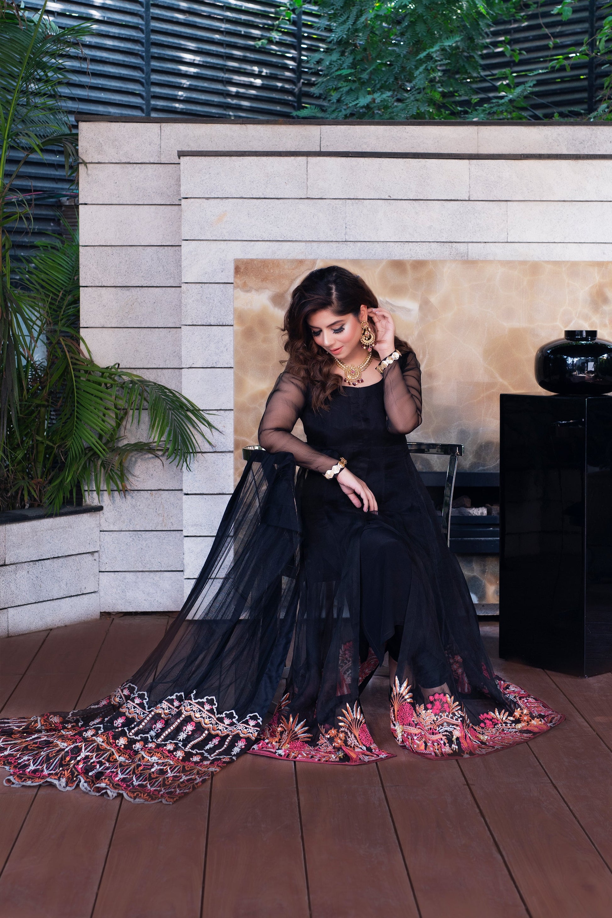 The perfect ensemble for a less is more approach to this wedding season, Naaz is an ebony pishwaas in organza with a beautifully embroidered hem in luscious silk threads, sequins and hand embellishment. It comes with a chooridaar, lining and net dupatta with heavily embroidered paloos.