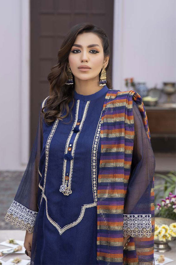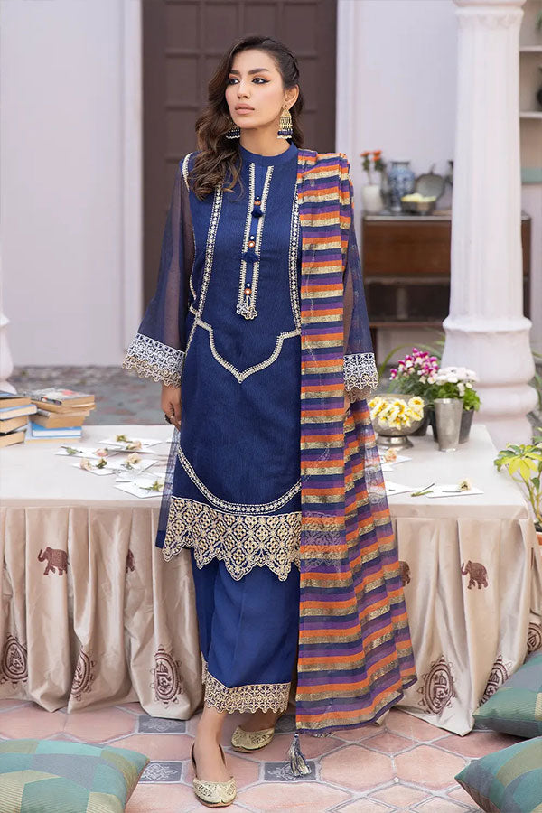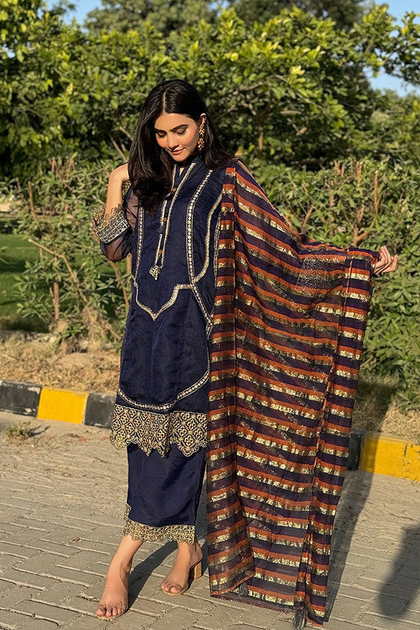 embroidered hem echoes the intricate detailing of the shirt, while the culotte style offers a contemporary twist on traditional attire. Paired with this outfit is a zari striped dupatta perfect for formal gatherings to casual soirées, this Navy Blue 3-piece outfit promises to make a statement wherever you go. Embrace the artistry and sophistication of this ensemble, and elevate your wardrobe to new heights of refinement.