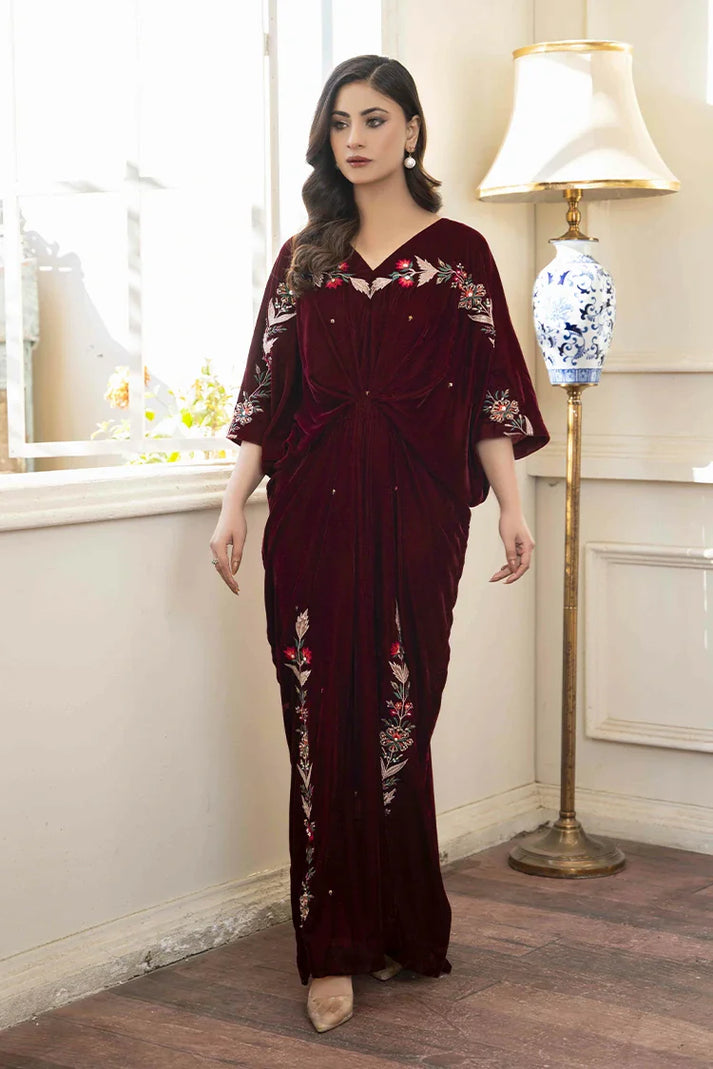 Composition of embroidered patterns on shoulder line and sleeves, this maroon kaftan is a perfect combination of regal elegance with detail aesthetics of naqshi pearls , cut moti and patch work on it.