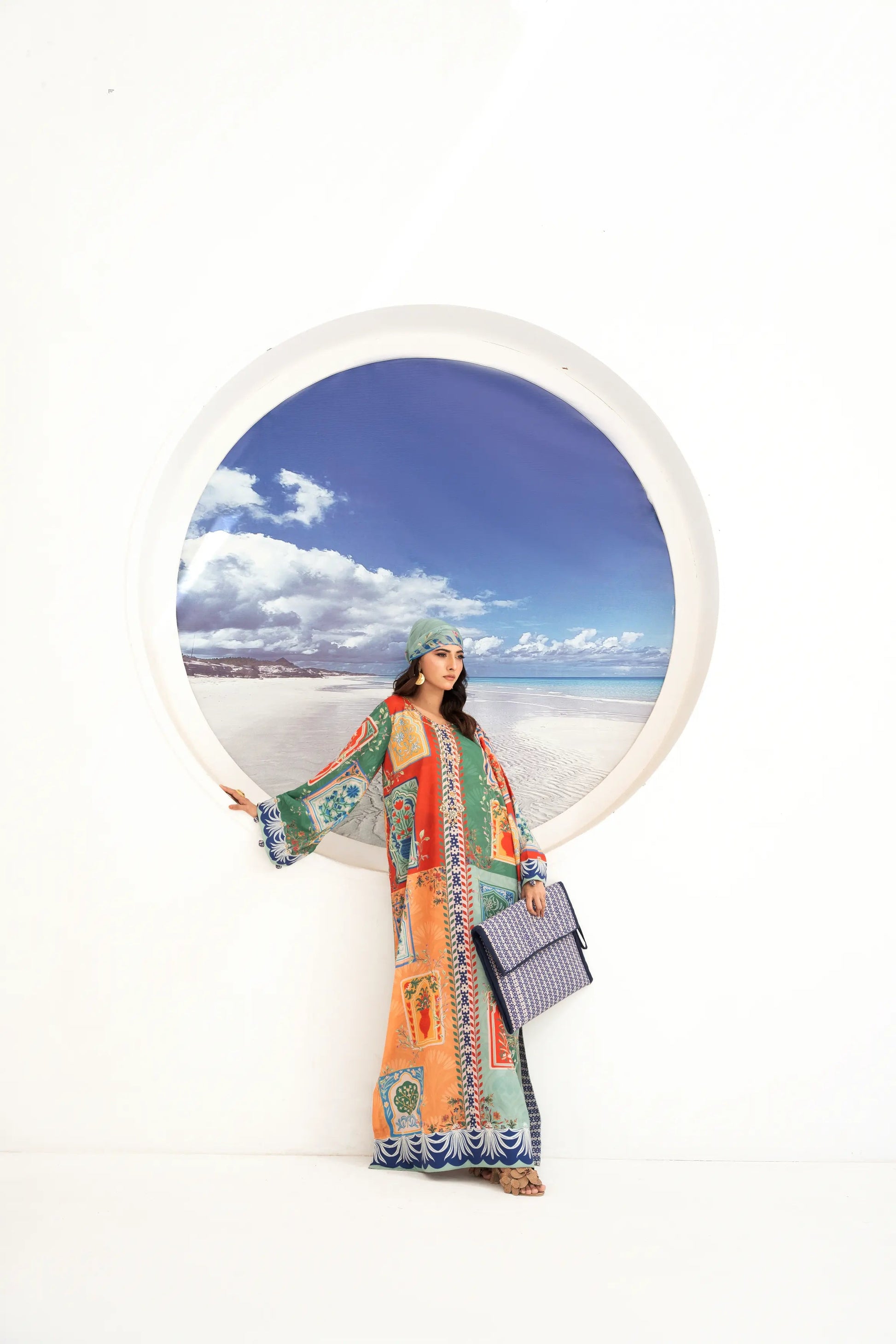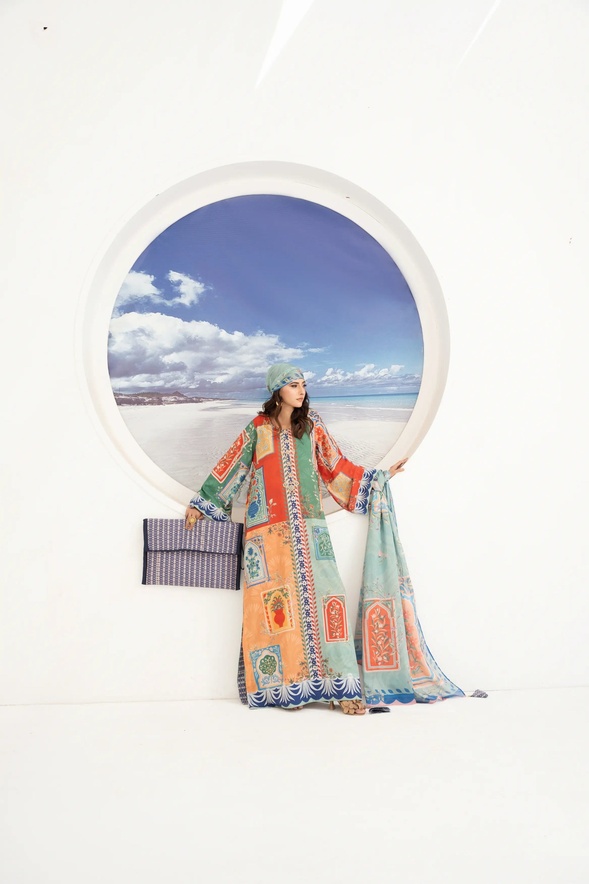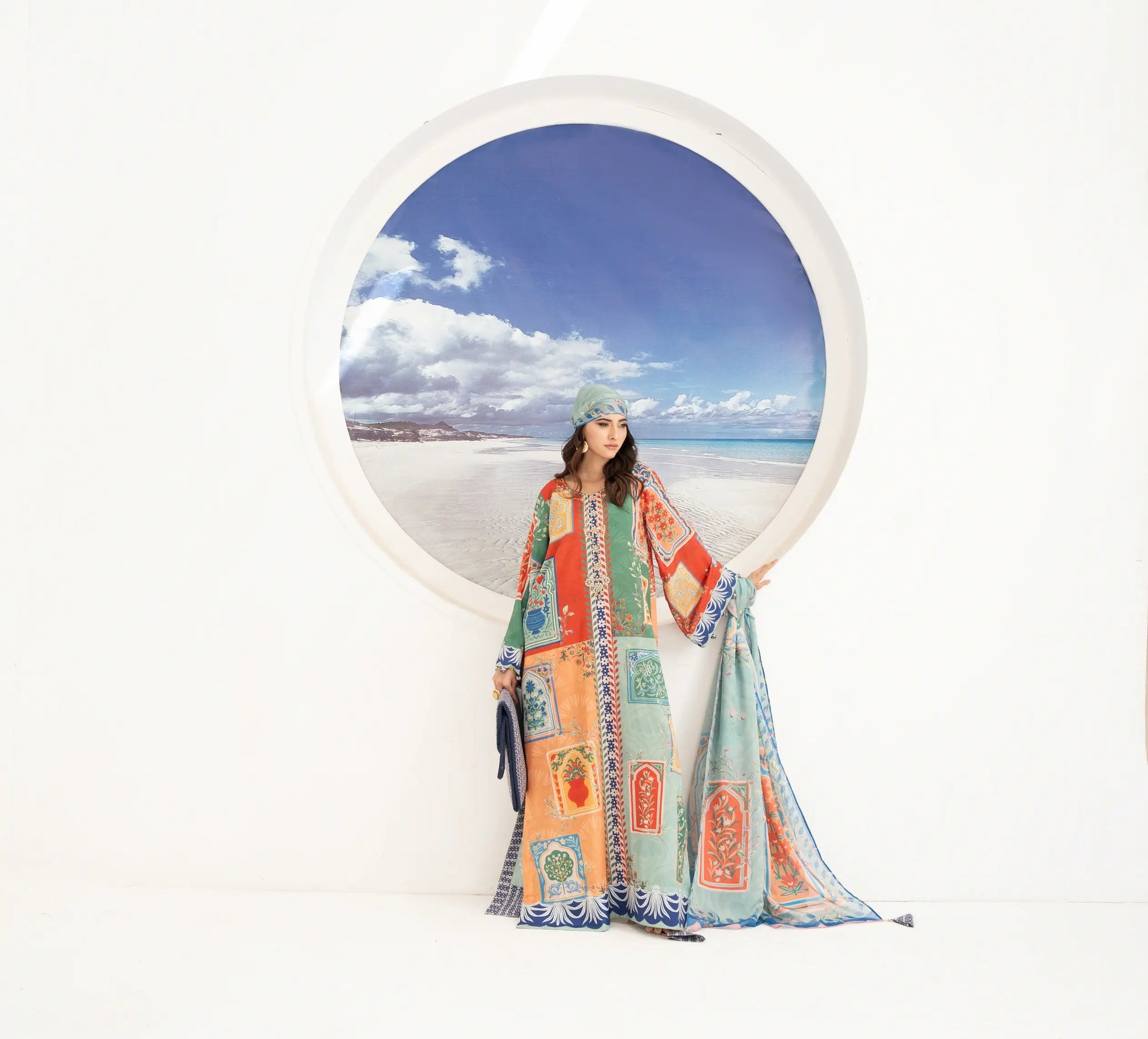 FLORA & FAUNA - Eid Festive: A digitally printed crepe silk long kaftan shirt with round neck feature zardozi, pearl, sequins and Swarovski hand embroidery. Kurta sleeves embellished with hand embroidery and fabric finishing. Paired with contrasting digitally printed crepe silk straight pant. Medium silk digitally printed dupatta adorned with tassel finishing.