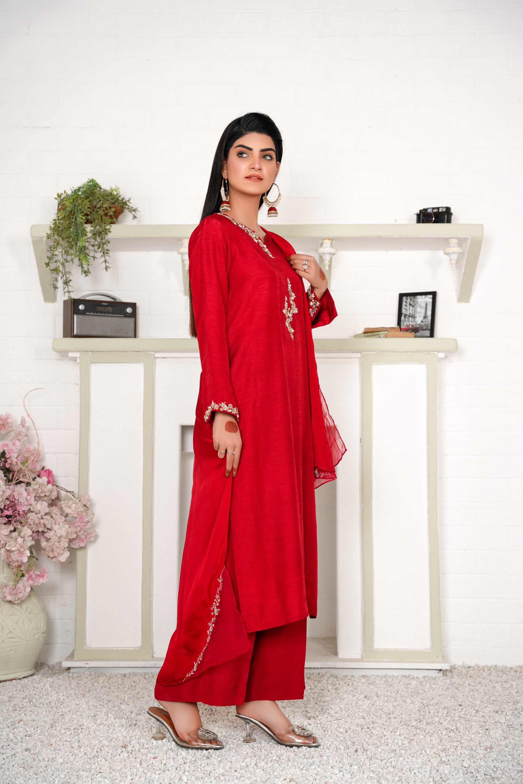 Sumptuously adorned neckline and sleeves using dabka, pearls and sequins over a sirocco colored canvas is an ethereal attire accompanied by silk dupatta and trousers.