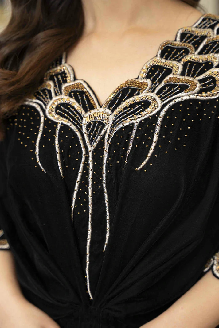 A mesmerizing black velvet kaftan is opulently curative with naqshi, dabka and embroidery and cutwork at neckline and sleeves.