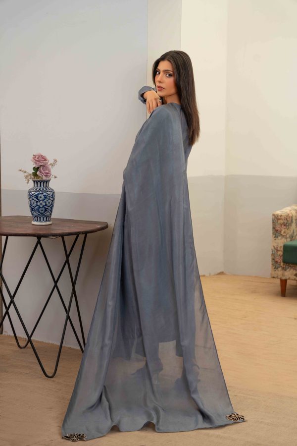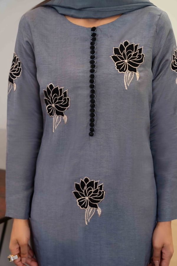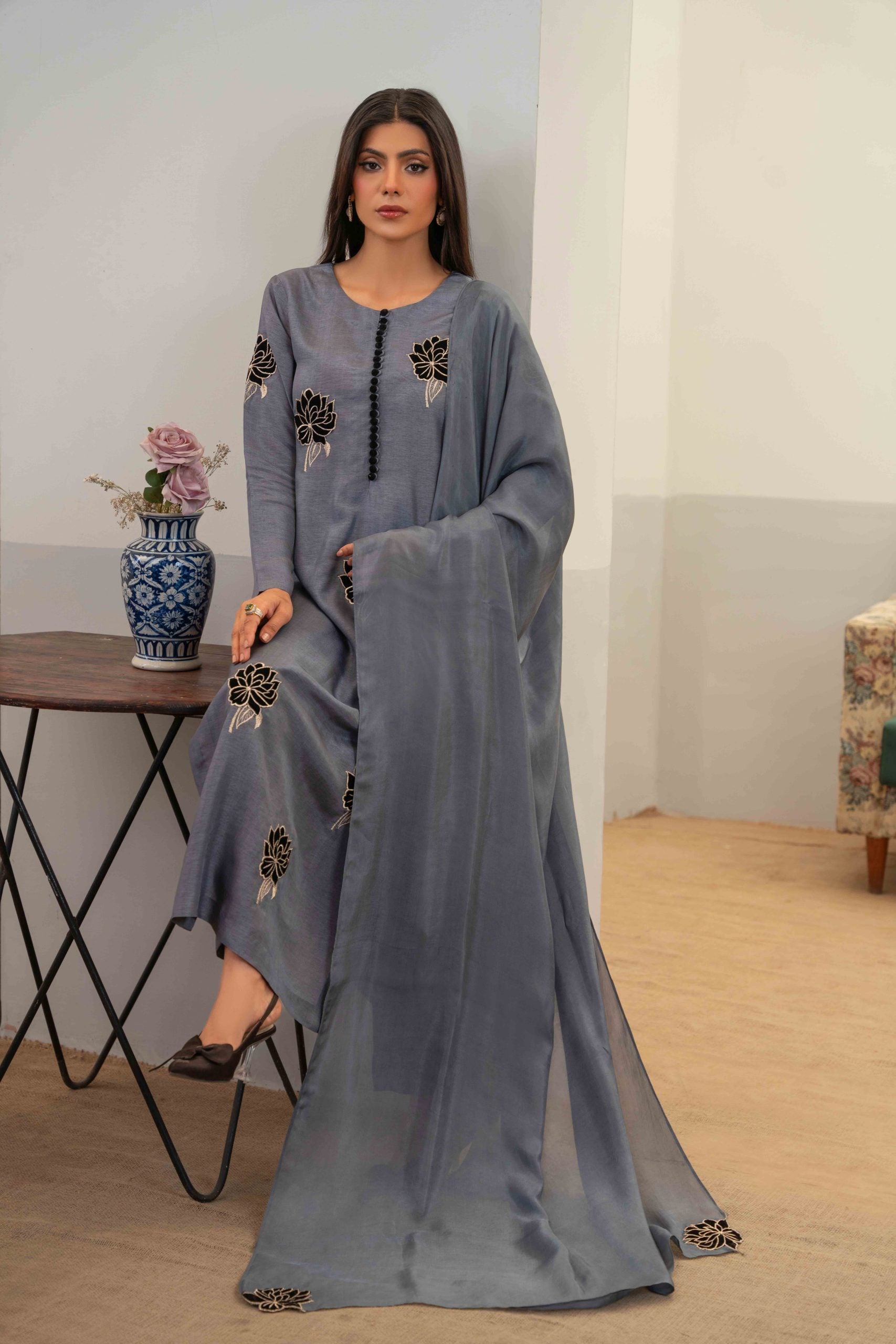 Make a statement in this stunning Reine grey raw silk ensemble with floral velvet patch work at front paired with a delicate embroidered dupatta. Trouser is included.
