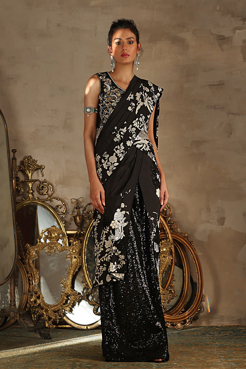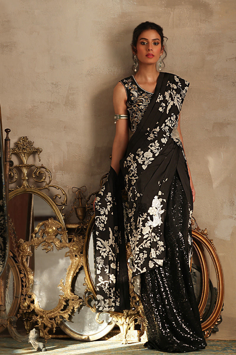 Indulge in the timeless elegance of Sheesha Silk fabric with this exquisite saree, a harmonious blend of modern allure and vintage charm. Crafted to drape gracefully, the saree embodies sophistication and femininity with its flowing texture and luxurious feel. Beautiful machine embroidered silver,black and ivory floral motifs appliqued on the font of the saree.