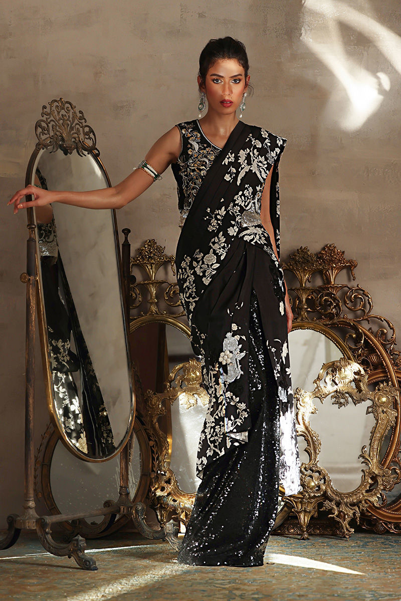 Adorned with delicate vintage floral motifs, each intricately enhanced with meticulous Zardozi work, this saree exudes an aura of regal splendor. The meticulous craftsmanship adds depth and dimension, creating a mesmerizing tapestry of tradition and contemporary finesse.