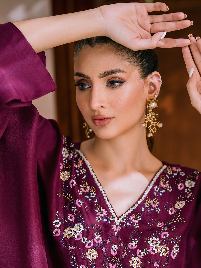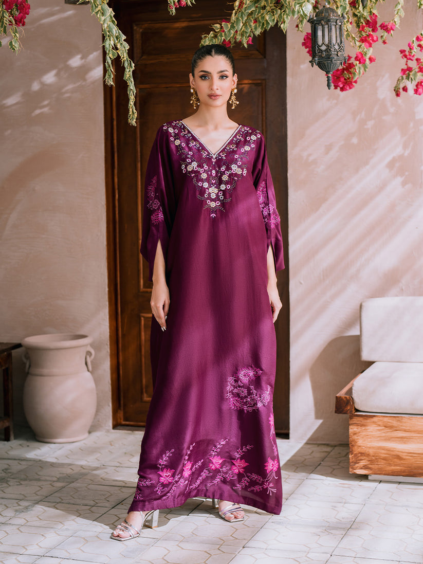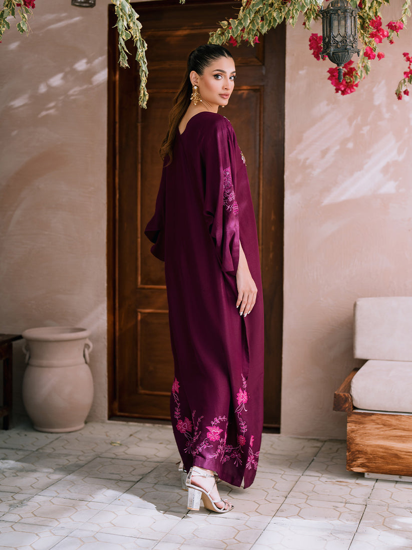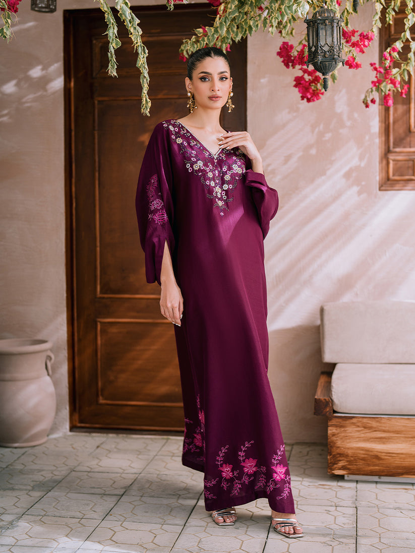 Plum kaftan with embroidery and handwork on the neck, complemented by embroidery details on the sleeves, chaak, and damaan. Made from pure raw silk for the kaftan, paired with Korean silk pants.