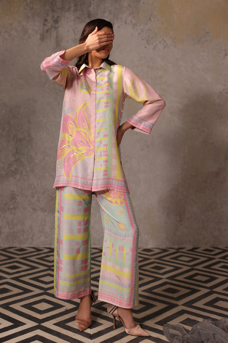 Bright and breezy, this digitally printed Korean raw silk set merges vibrant patterns with subtle hand-embellished sequins. Ideal for modern dressing, it strikes the perfect balance between playful prints and delicate detailing.
