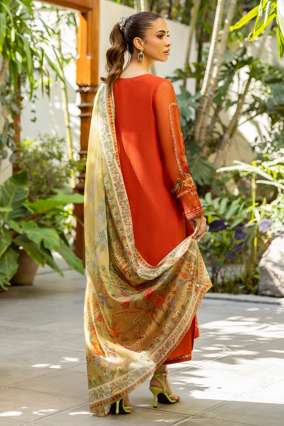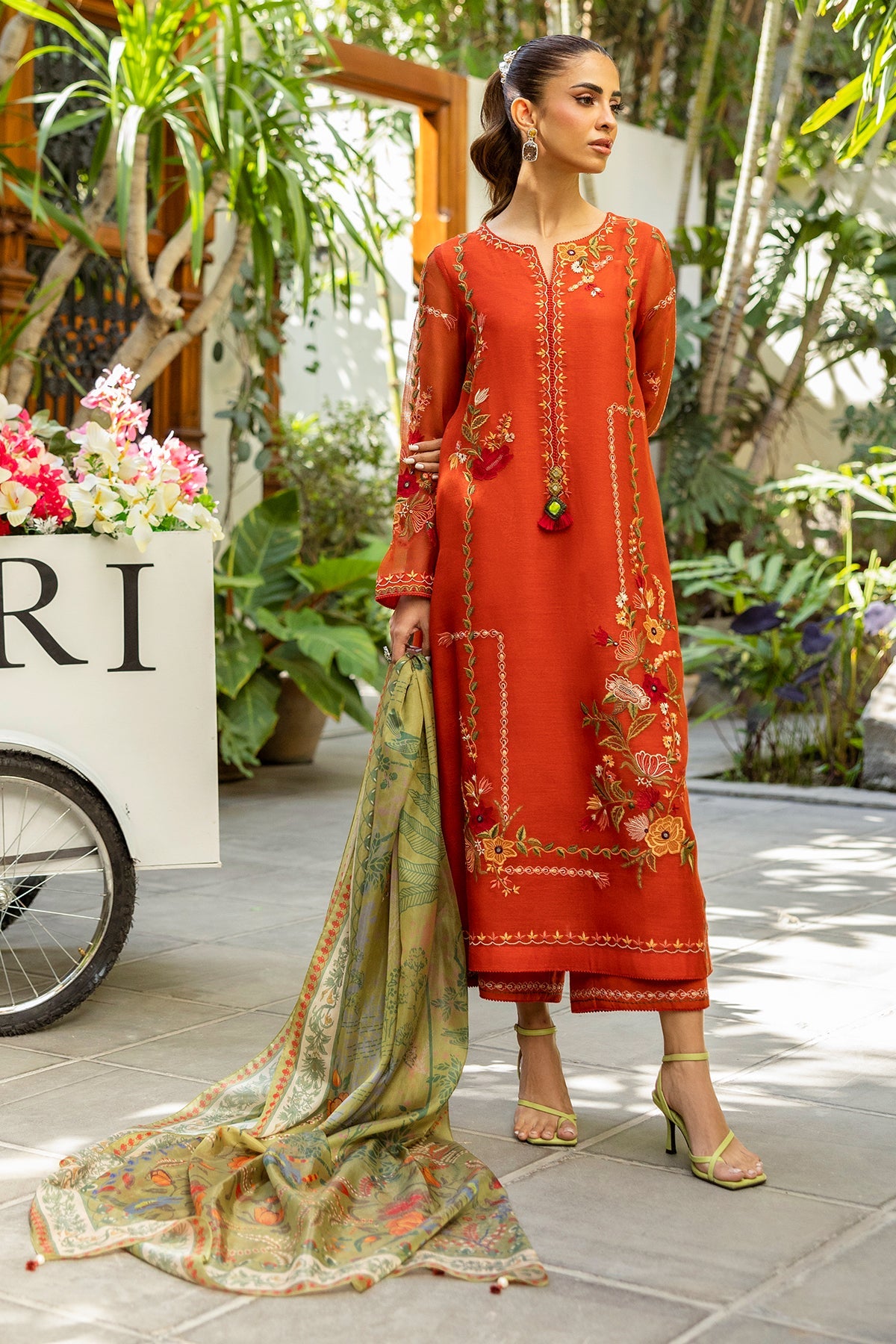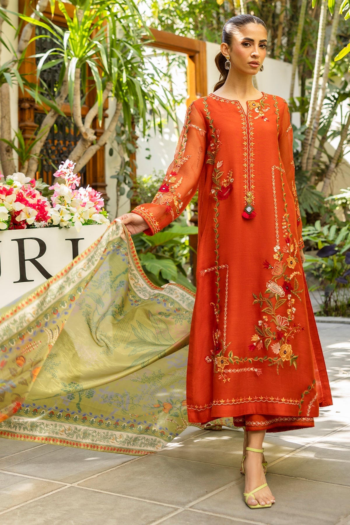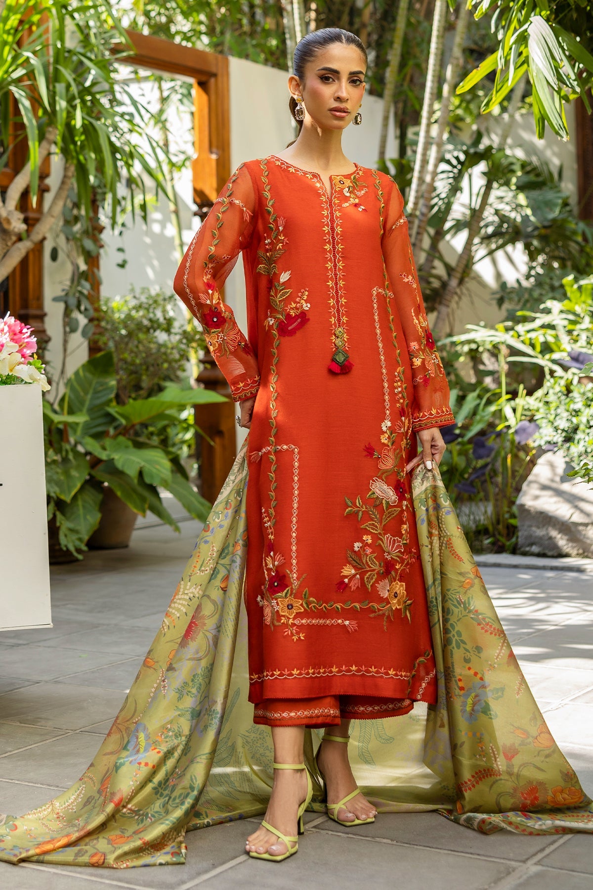 Intricately embroidered with finesse, this rust shirt is accentuated with tassel details on the neckline, paired with a digitally printed dupatta and matching embroidered culottes.