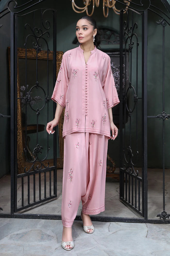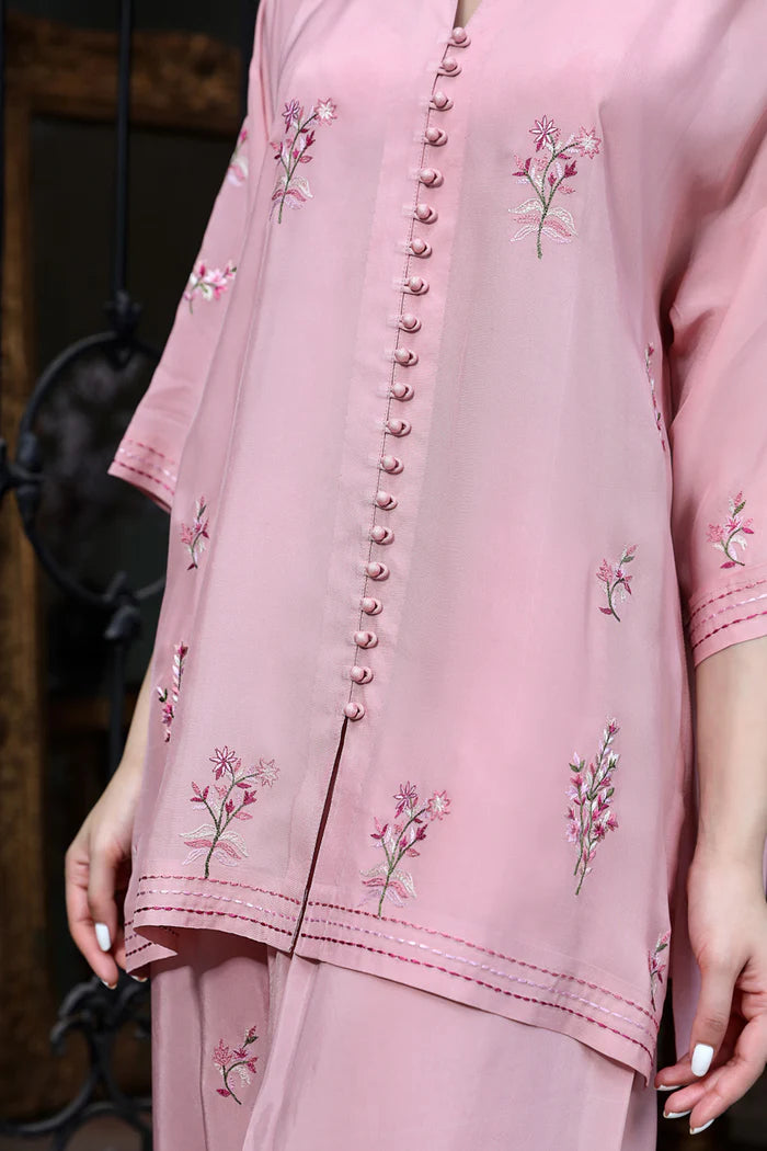 The captivating pink hue raw silk,cut in a contemporary silhouette.The short shirt is paired with the same shade of raw silk hydrabadi shalwar to will be your ultimate style solution.You can pair it with heels and you are good to go.