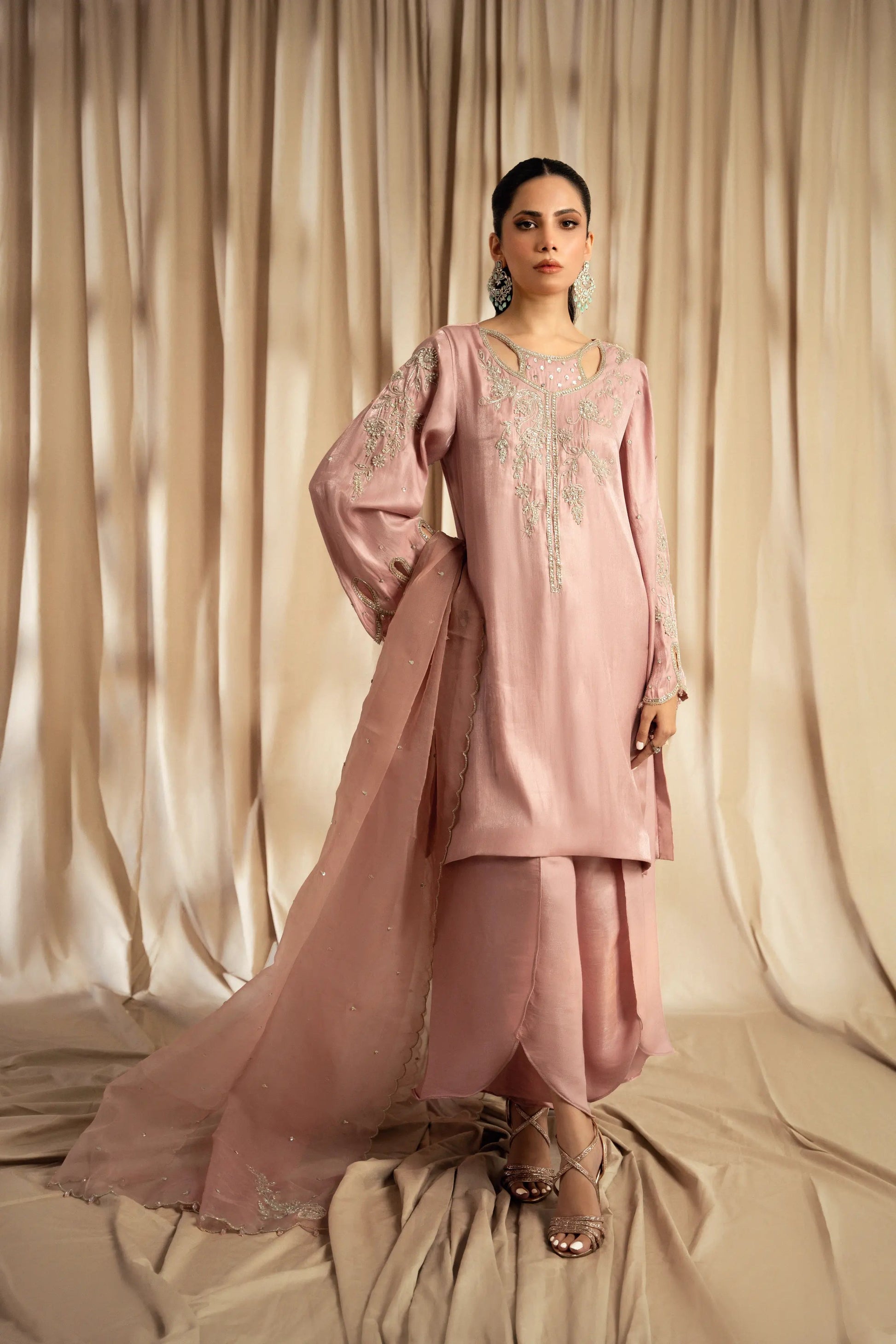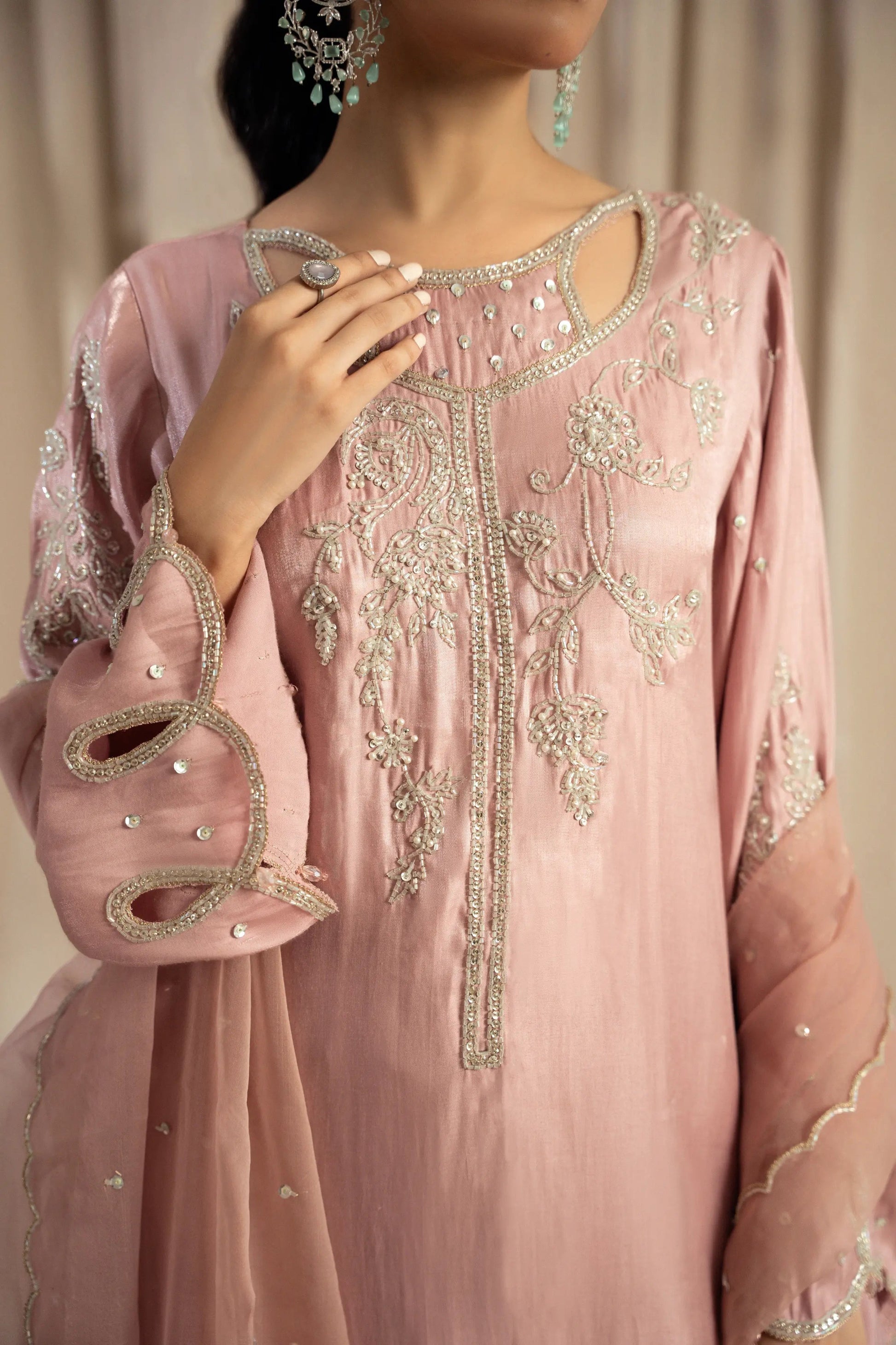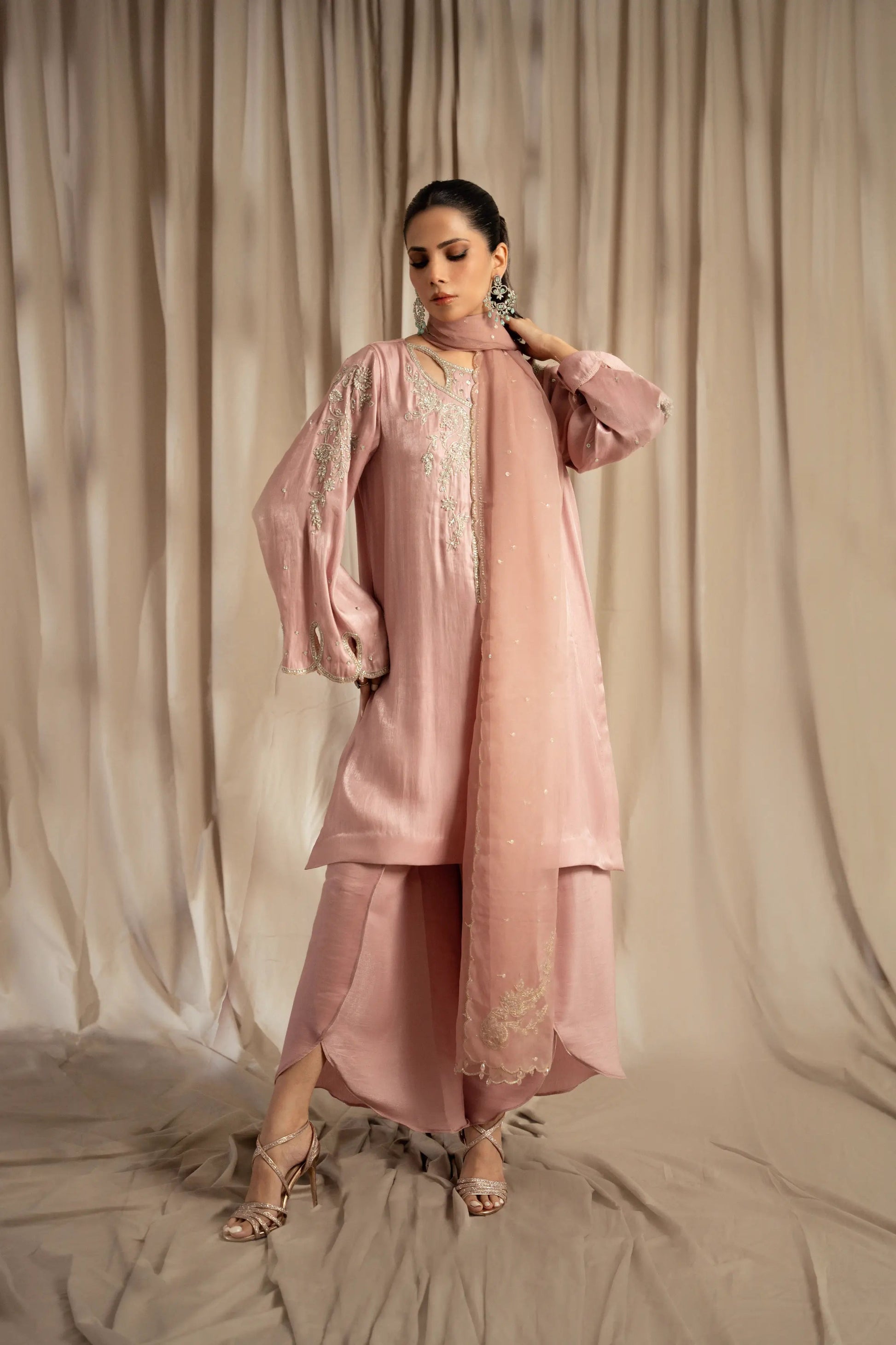 LIA - Festive Formal: The ensemble features a tea pink sheesha silk short shirt embellished with intricate contrasting light grey hand embroidery of bead, sequins, pearl and cutwork. Paired with overlapped flared trouser and organza dupatta adorned with hand embroidery with makes it the perfect choice for any occasion.