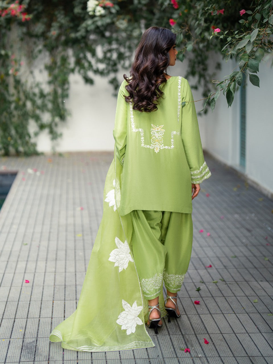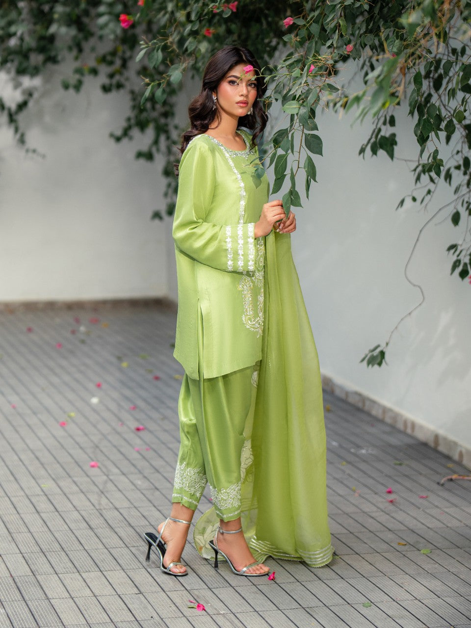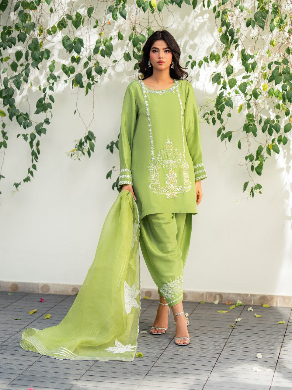 The Green Varda outfit, featuring vibrant technicolor embroidery and intricate handwork details, is elegantly paired with raw silk pants.