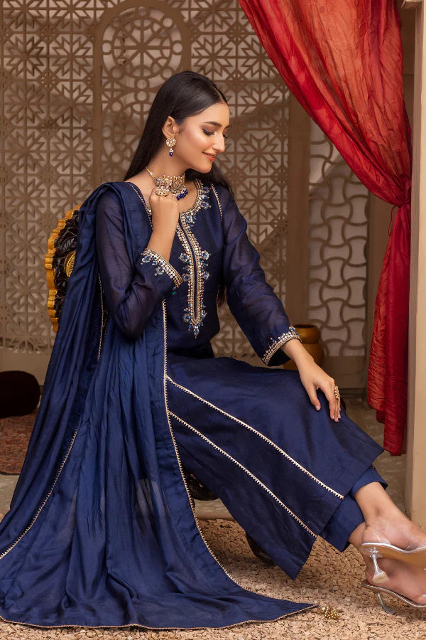 Premium your style game with this beautiful Khadi silk shirt, featuring delicate handwork on the neckline. It comes with a comfy raw silk trouser and a soft silk dupatta, finished with pretty lace and playful tassels. This outfit is the perfect blend of elegance and ease, making it ideal for any special occasion.