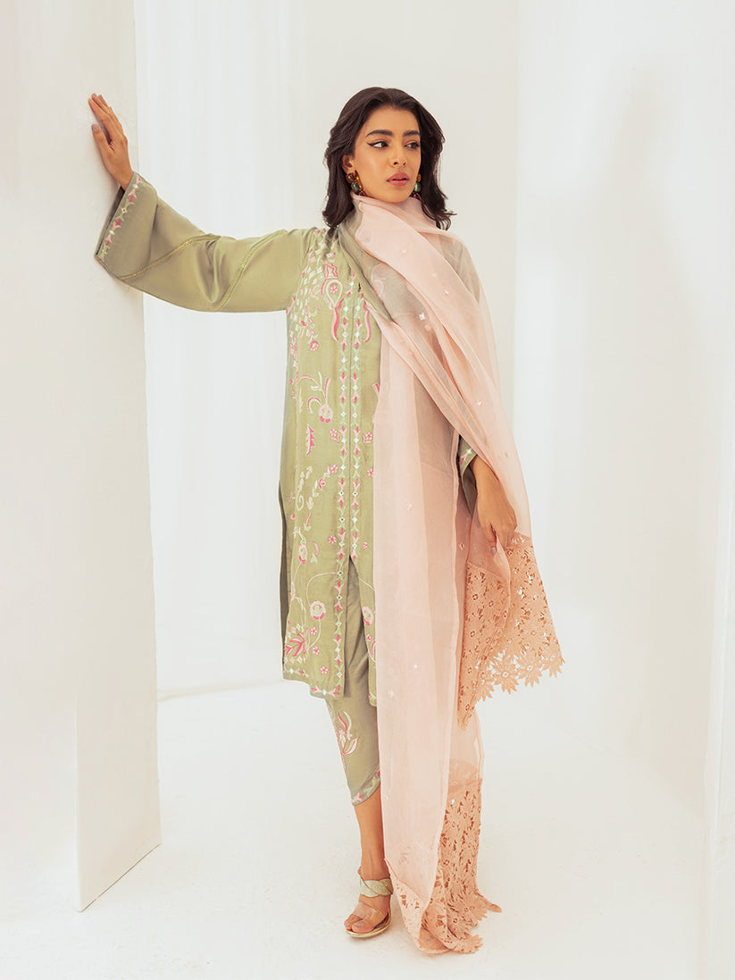 A sage green raw silk kurta with intricate arih work in shades of pink, peach, and off-white, complemented by mirror work. Paired with tapered silk pants adorned with embroidered motifs and a shaded dupatta with lace borders.