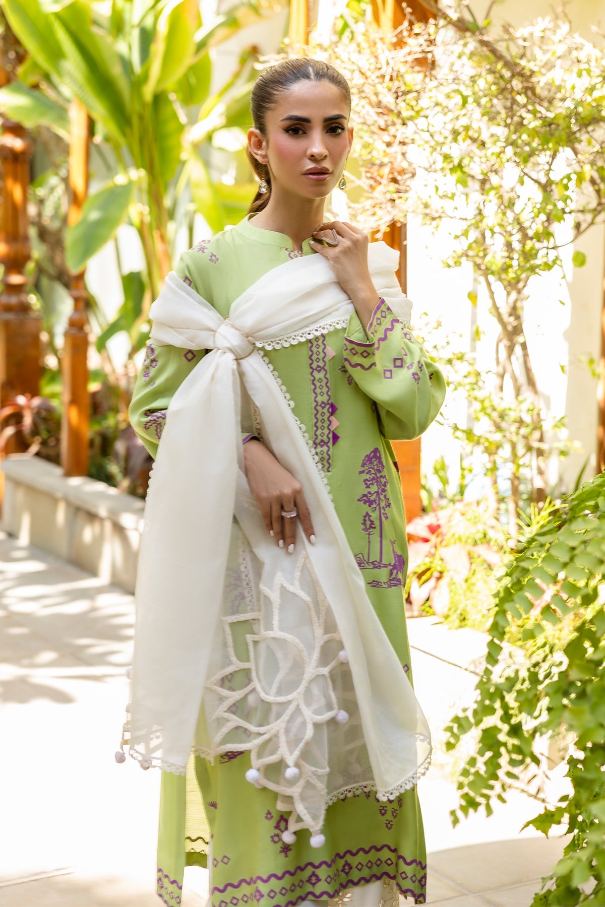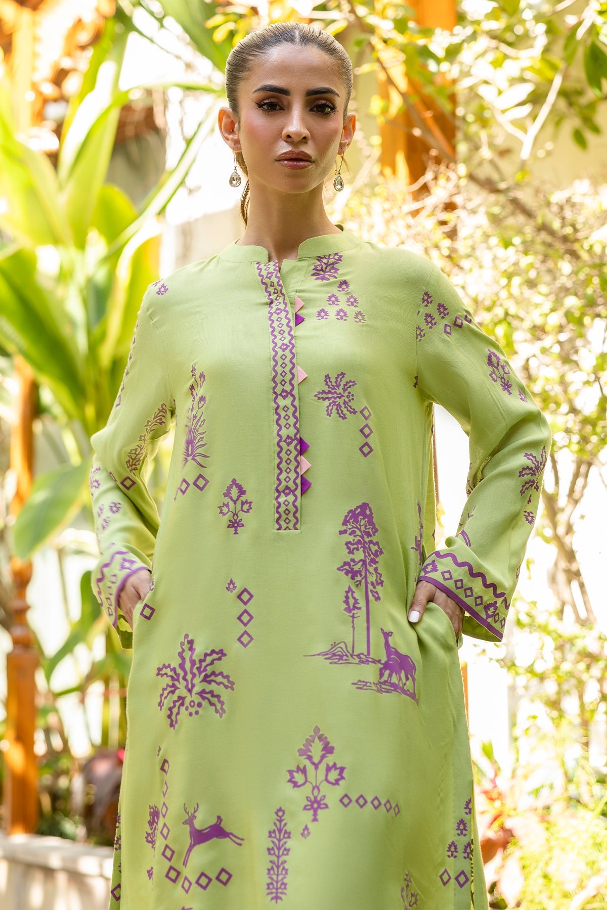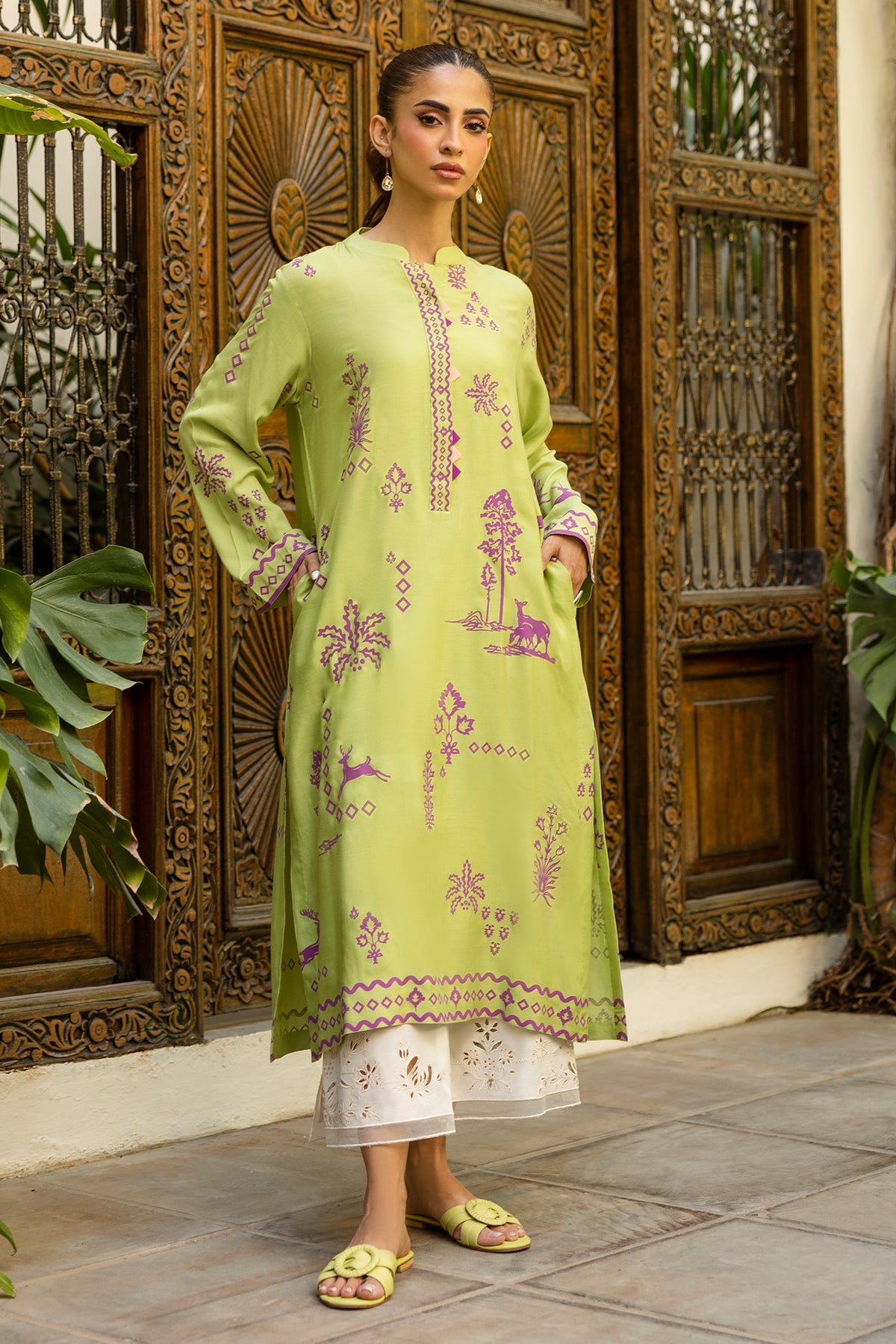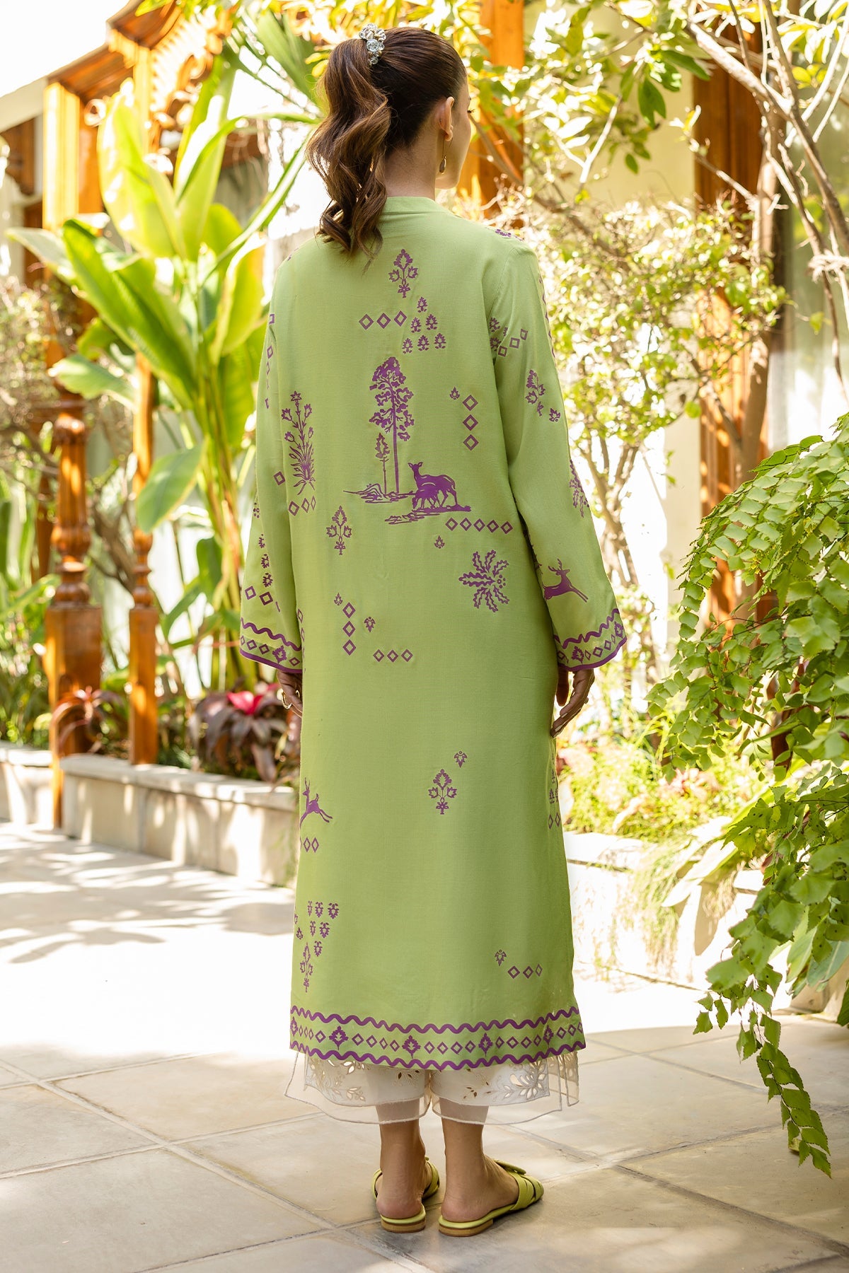 A striking lime green kurta with unique screen-printed patterns and modern touches. A fashionable take on traditional style.