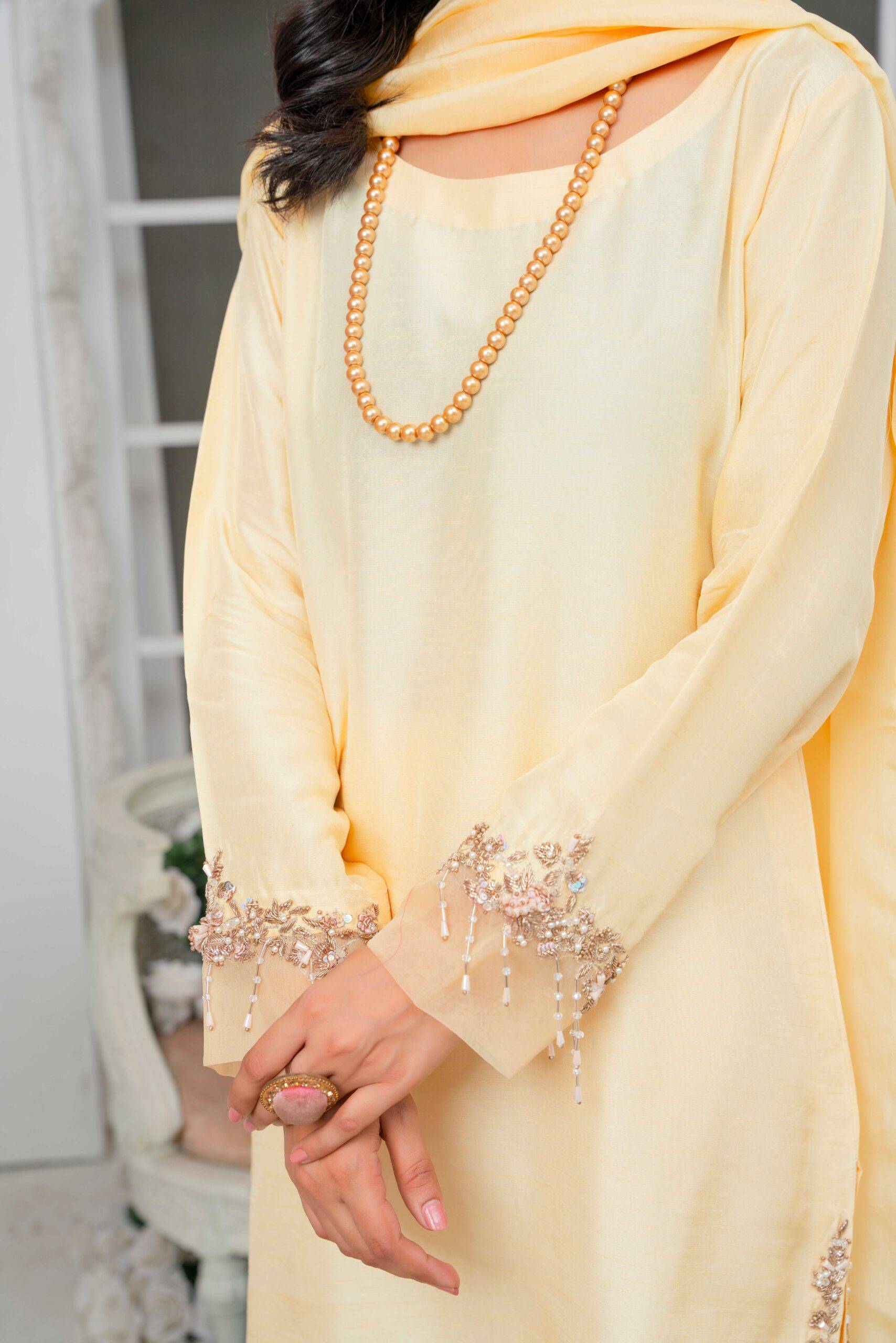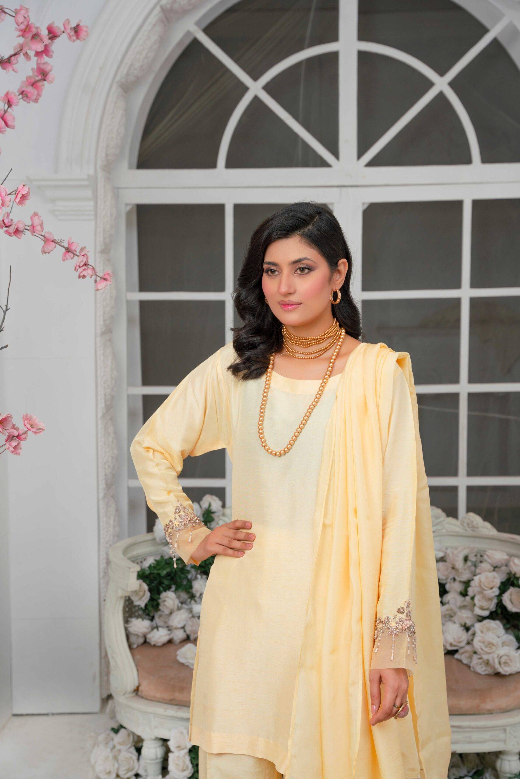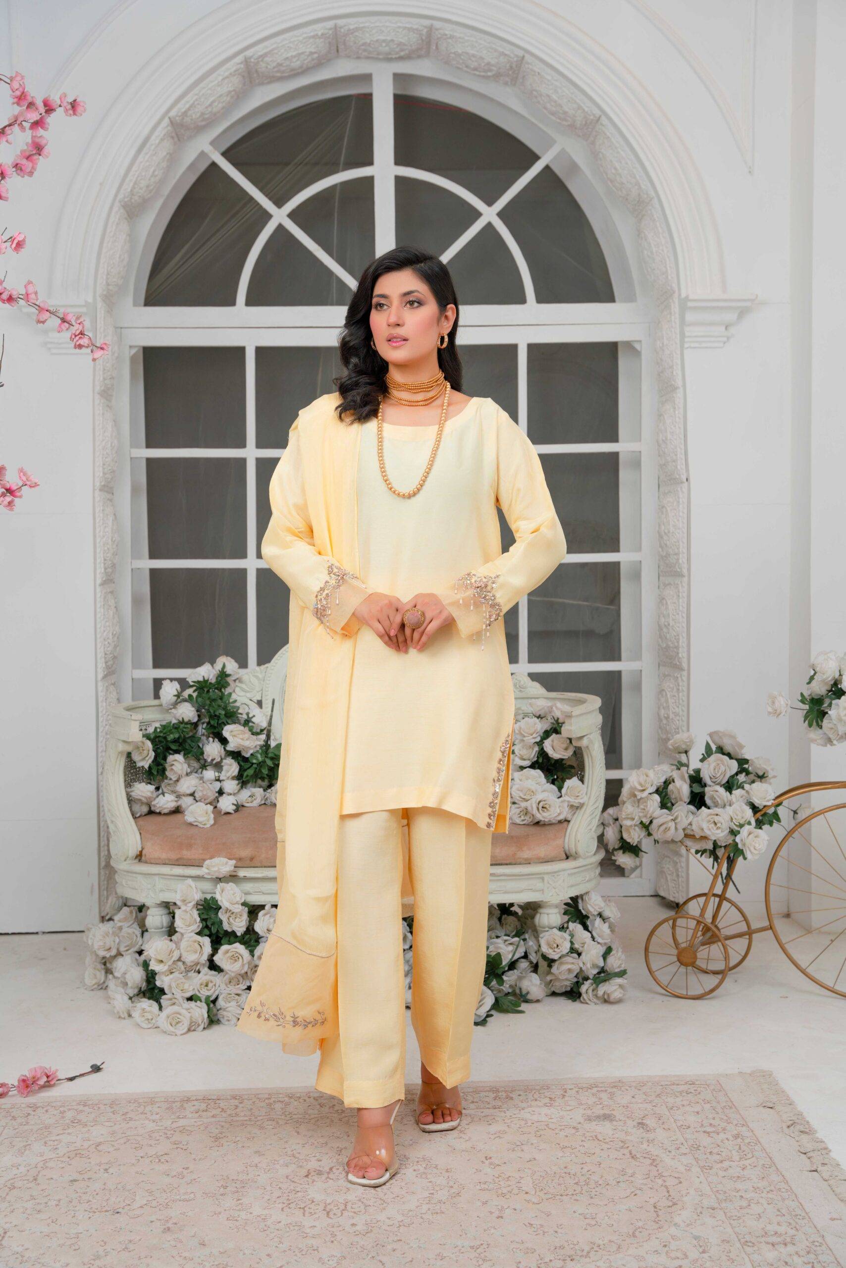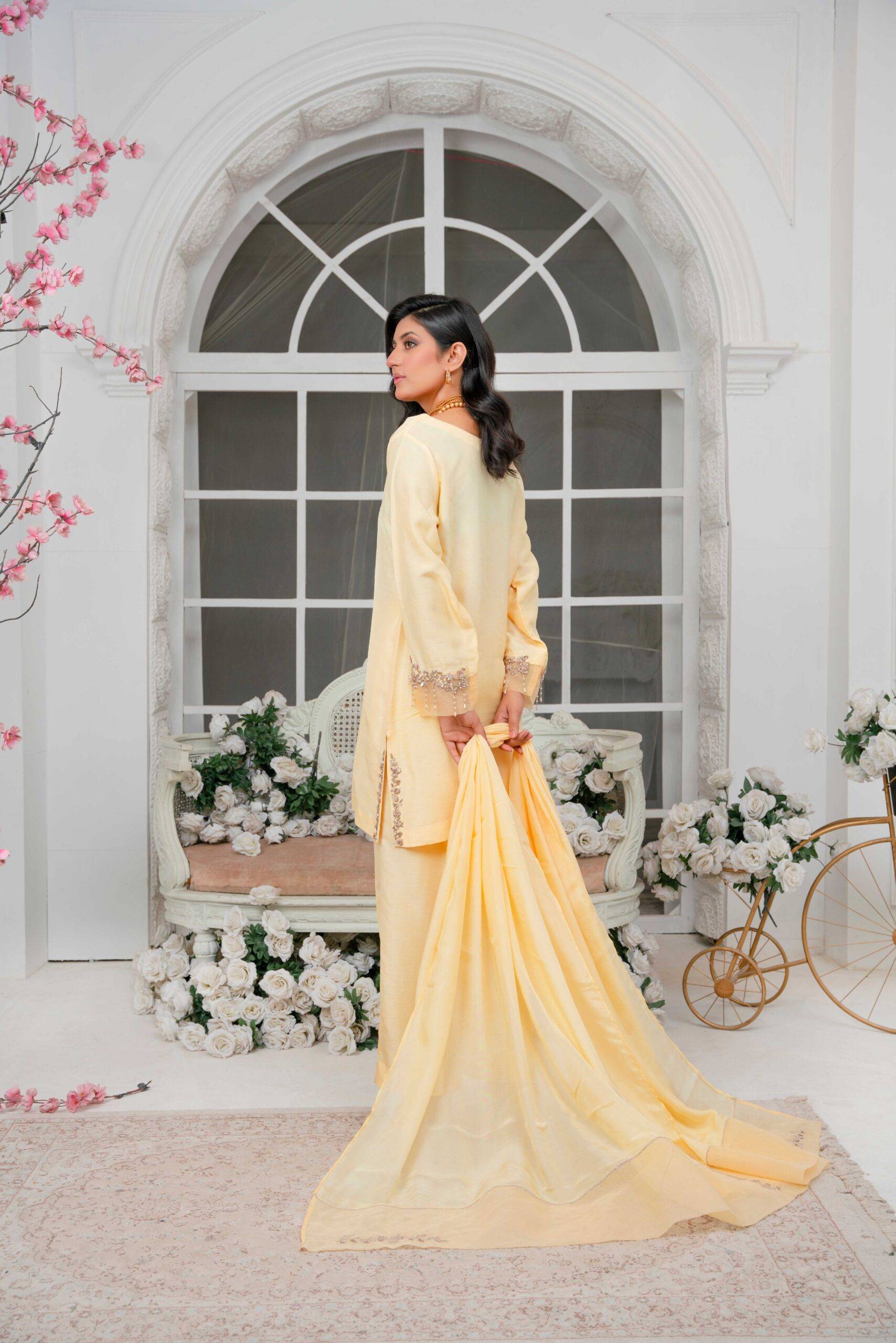 Indulge is ultimate sophistication with soft yellow hues and details at sleeves and Daman paired with silk embroidered dupatta giving a timeless look. Trouser is included.