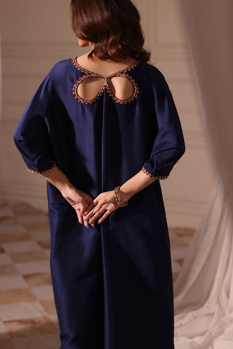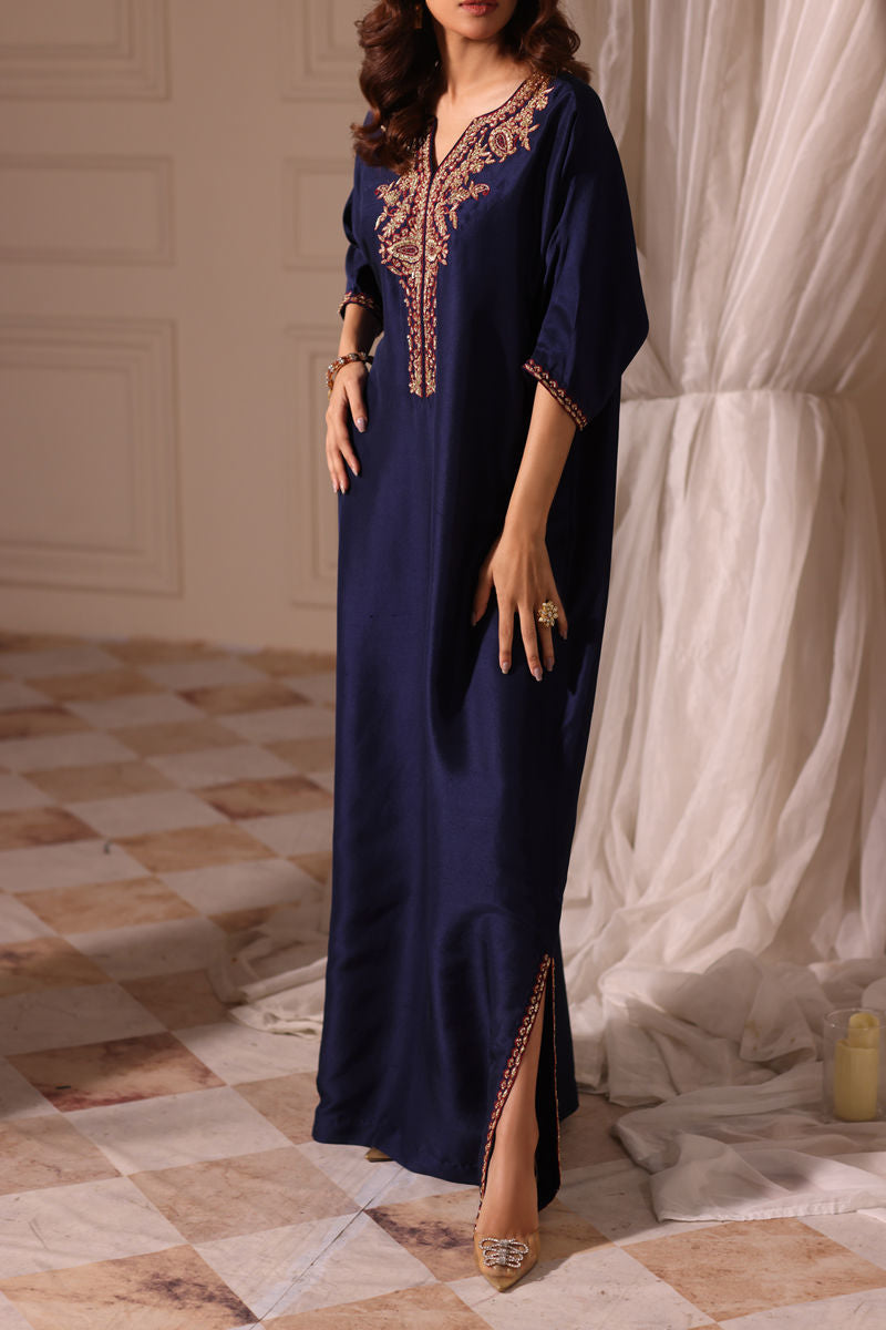 Elevate your wardrobe with this pure navy-blue raw silk kaftan features exquisite hand-embellishment in gold and maroon