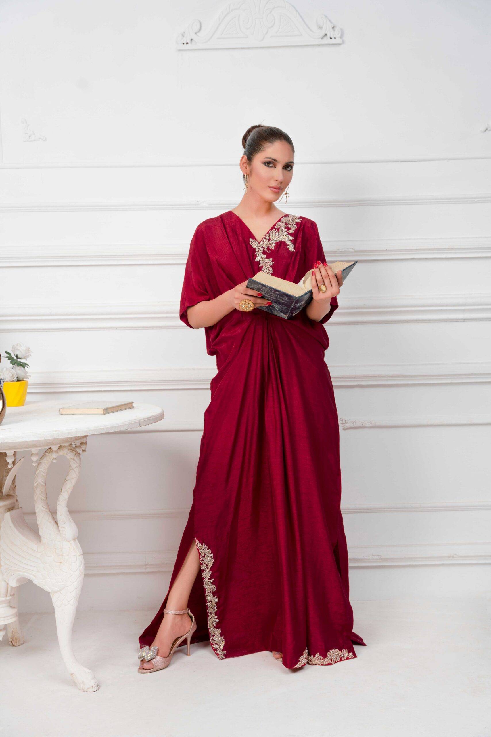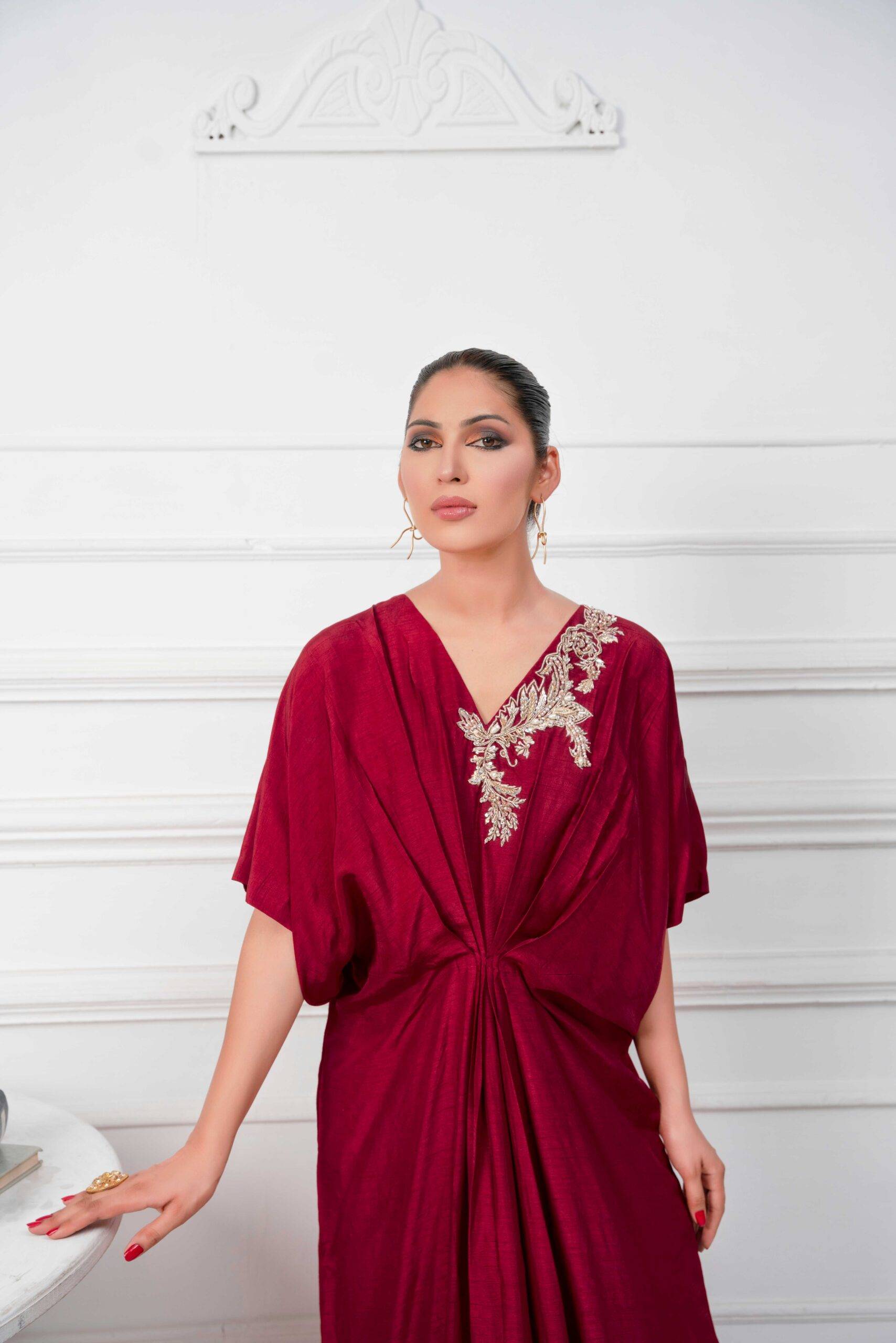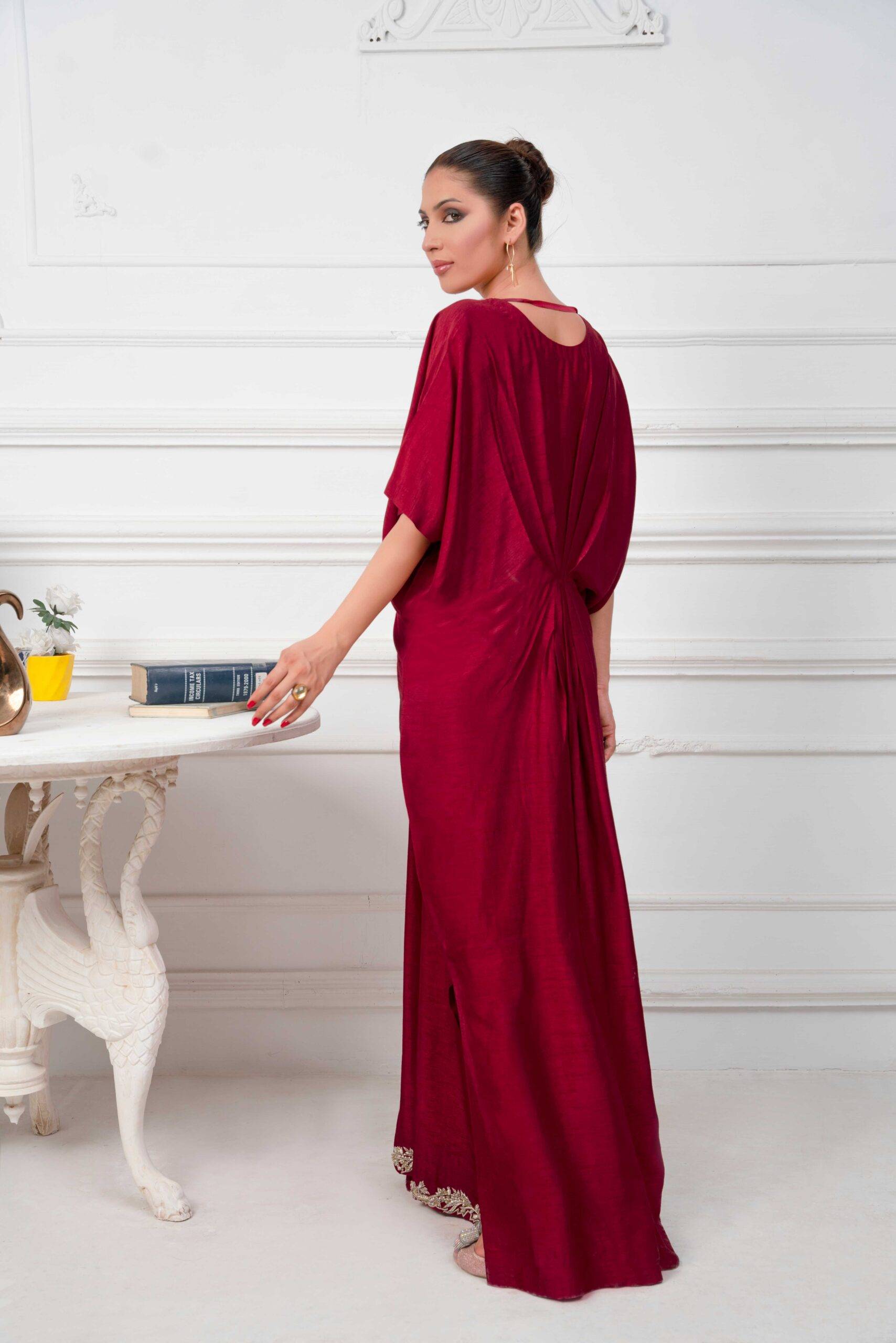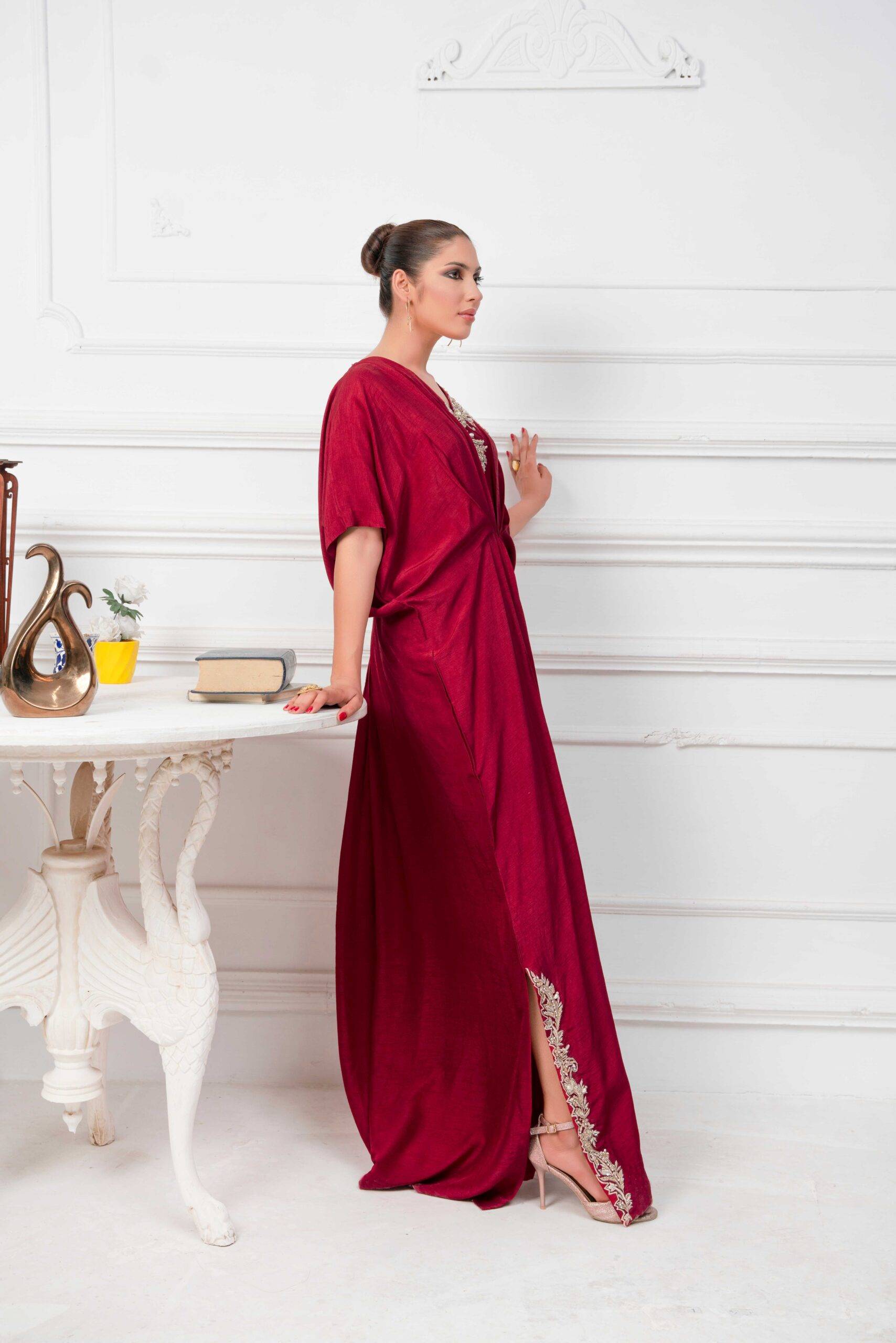 A mesmerizing maroon kaftan is opulently curated with dabka pearls and crystals at neckline and emanating cutwork at side slit makes it an elegant silhouette. Kaftans will be free size with 56 inches length but can be customizes as per requirements.