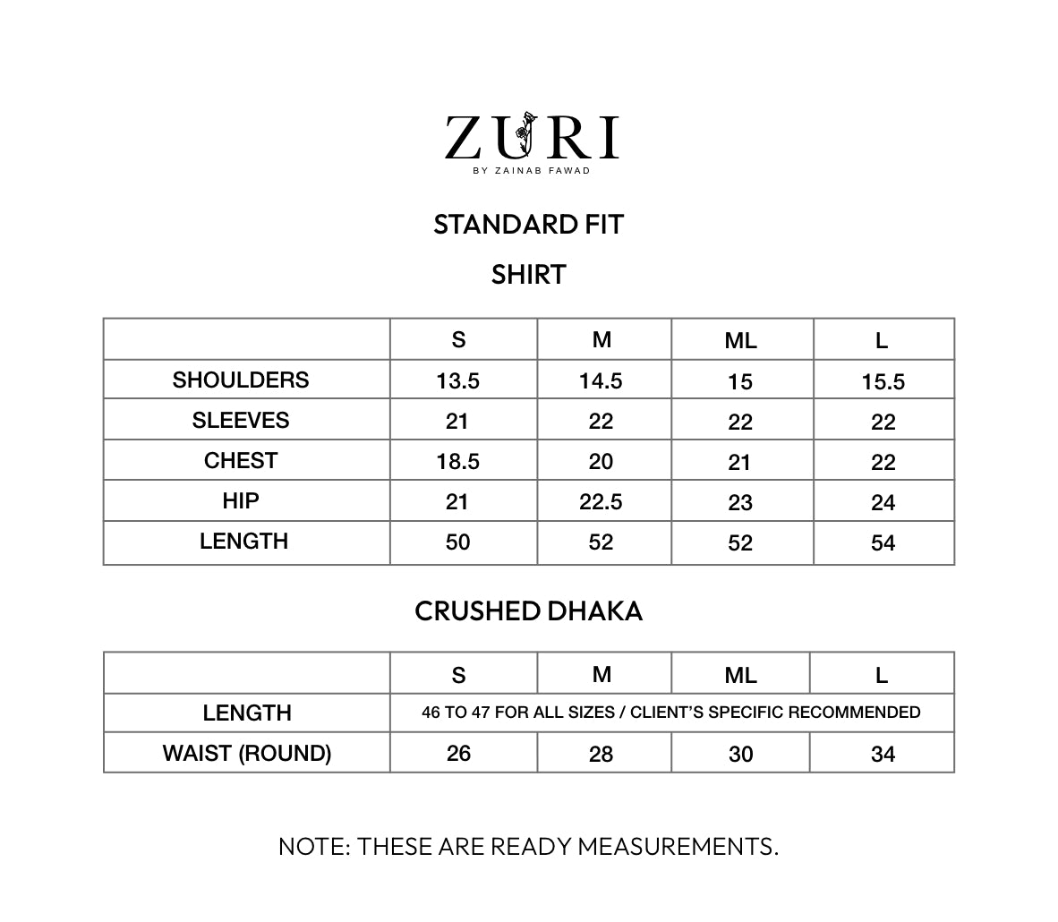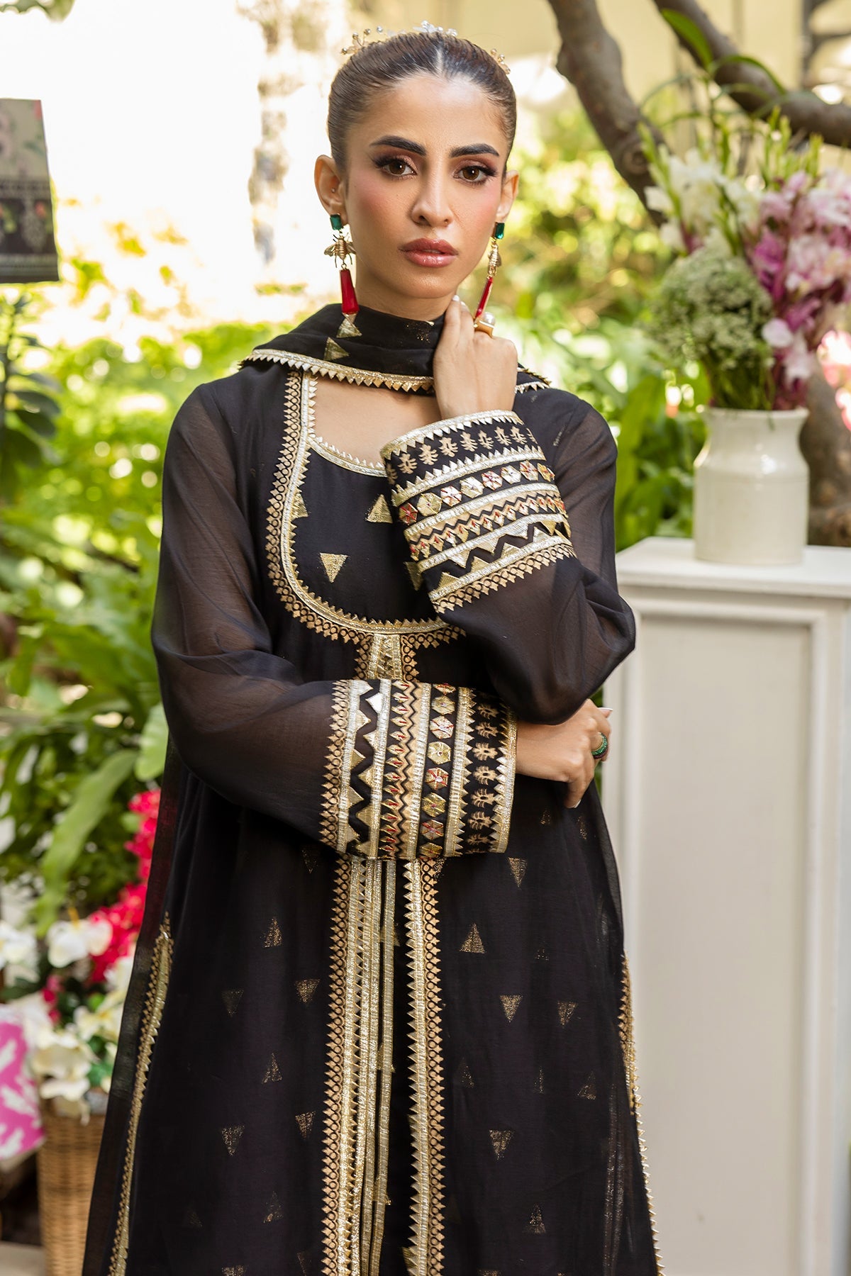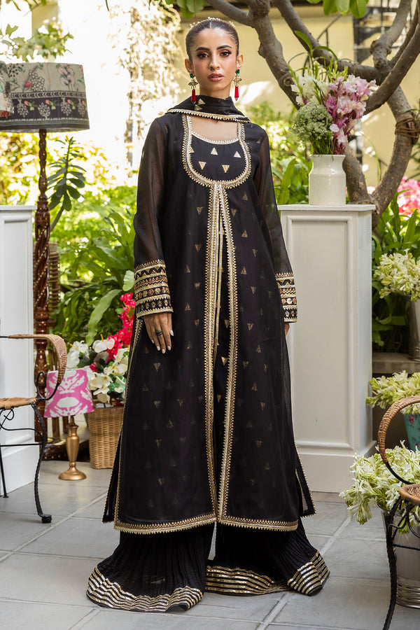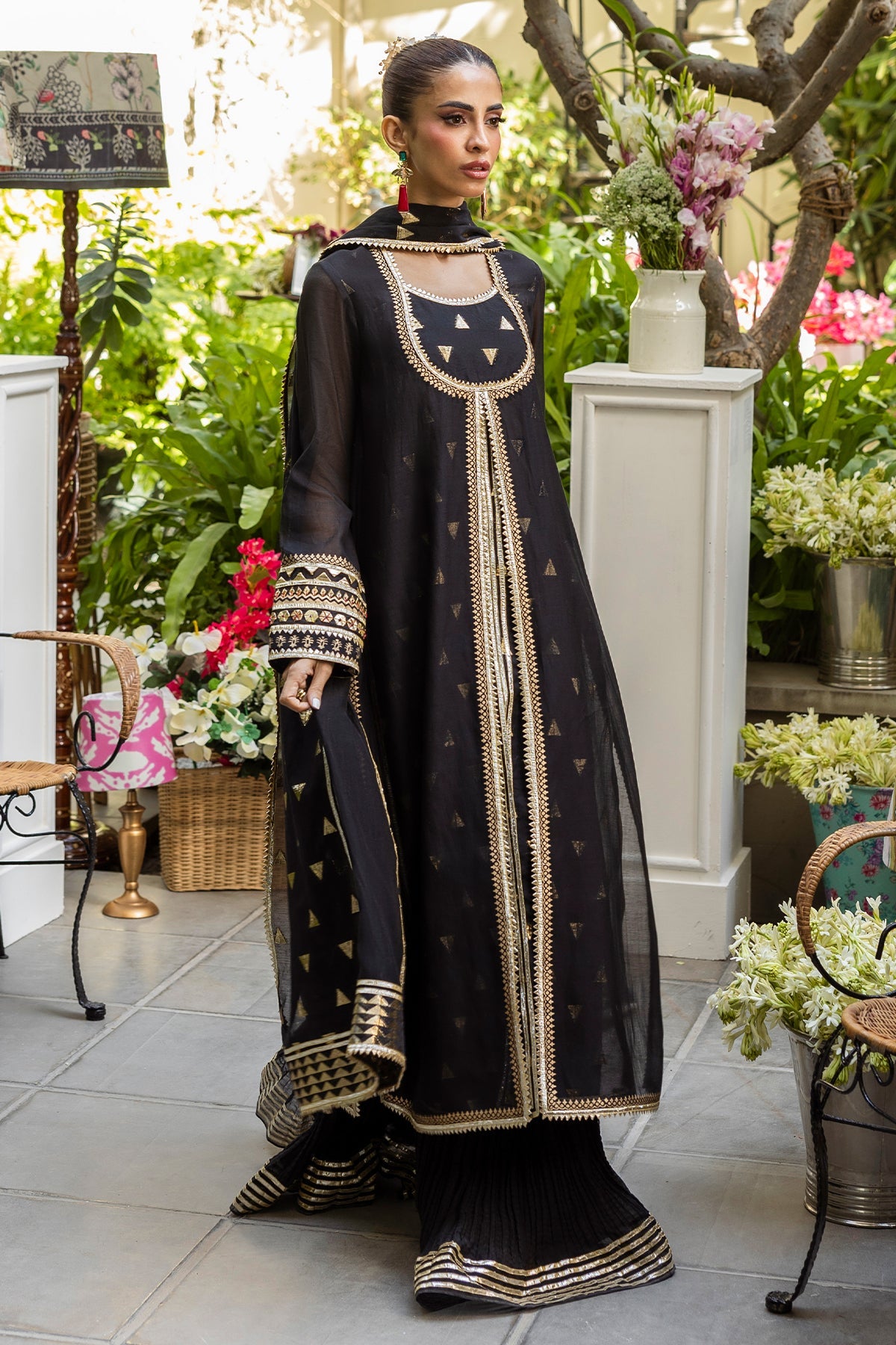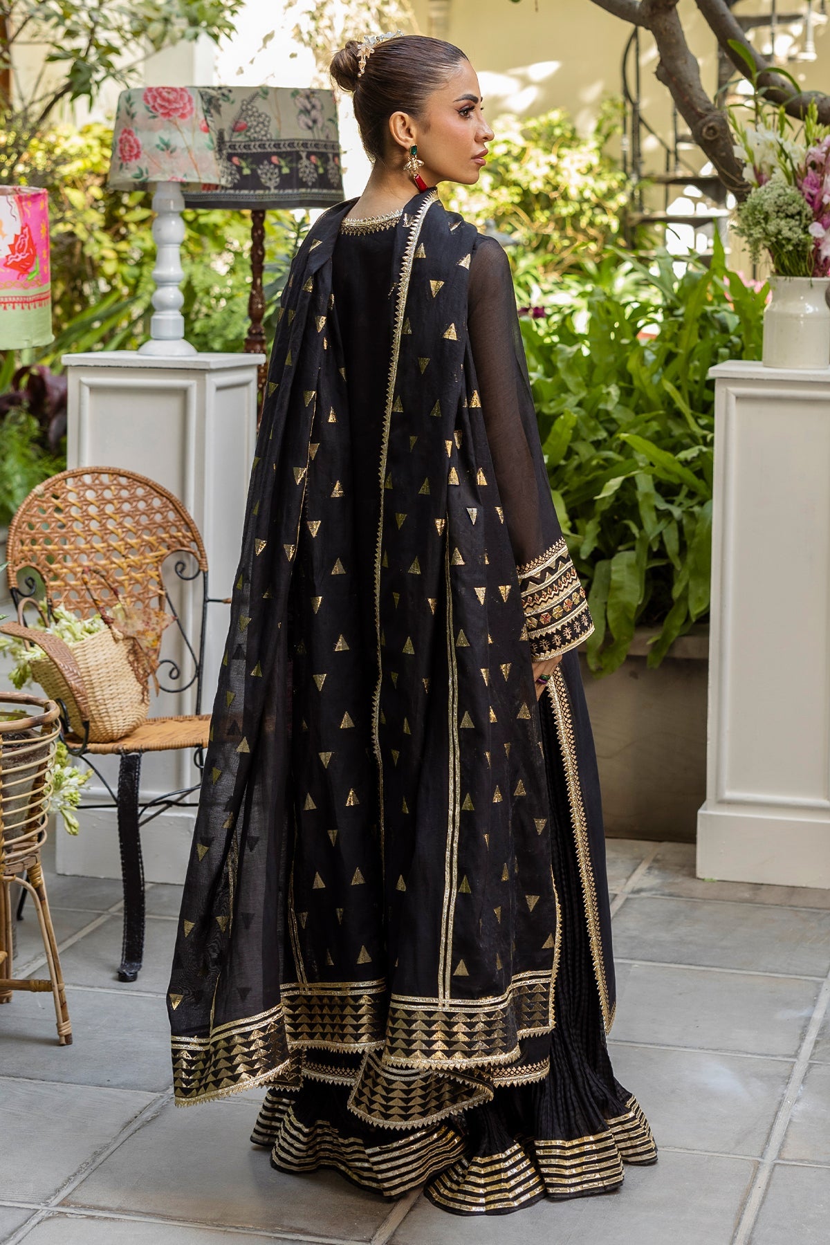 A black cora cotton long shirt featuring block print, gotta edging, and a shimmering lorex lining. The heavily embellished sleeves add a regal touch, paired elegantly with a crushed Dhaka and lorex dupatta.