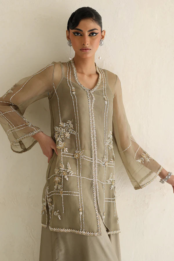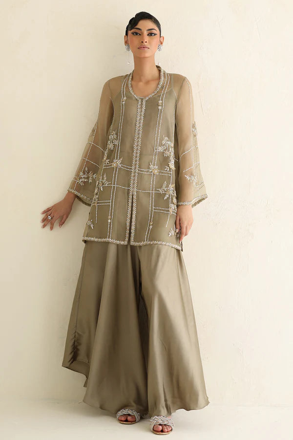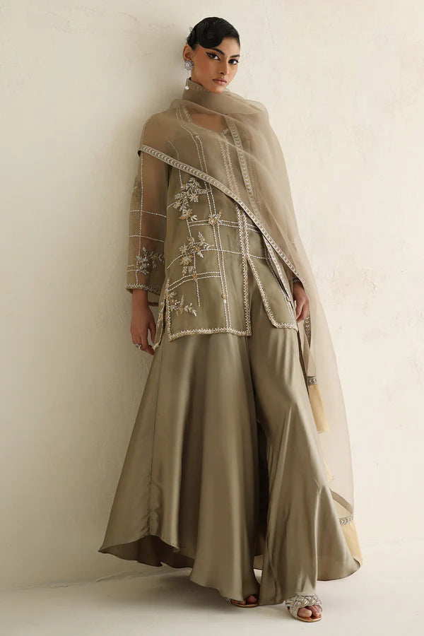 paired with trendy loose pants and organza dupatta with gold frill, making this piece truly unforgettable.