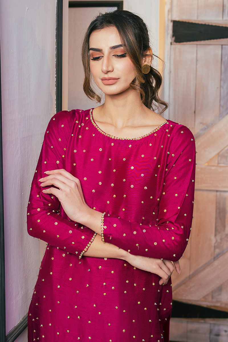 “Zuri” is an amalgamation of timeless silhouettes crafted to perfection, a magenta Korean silk shirt laden with multicolored Swarovski and gold sequins all over the shirt to give you an effortless but chic look. You can also pair it up with